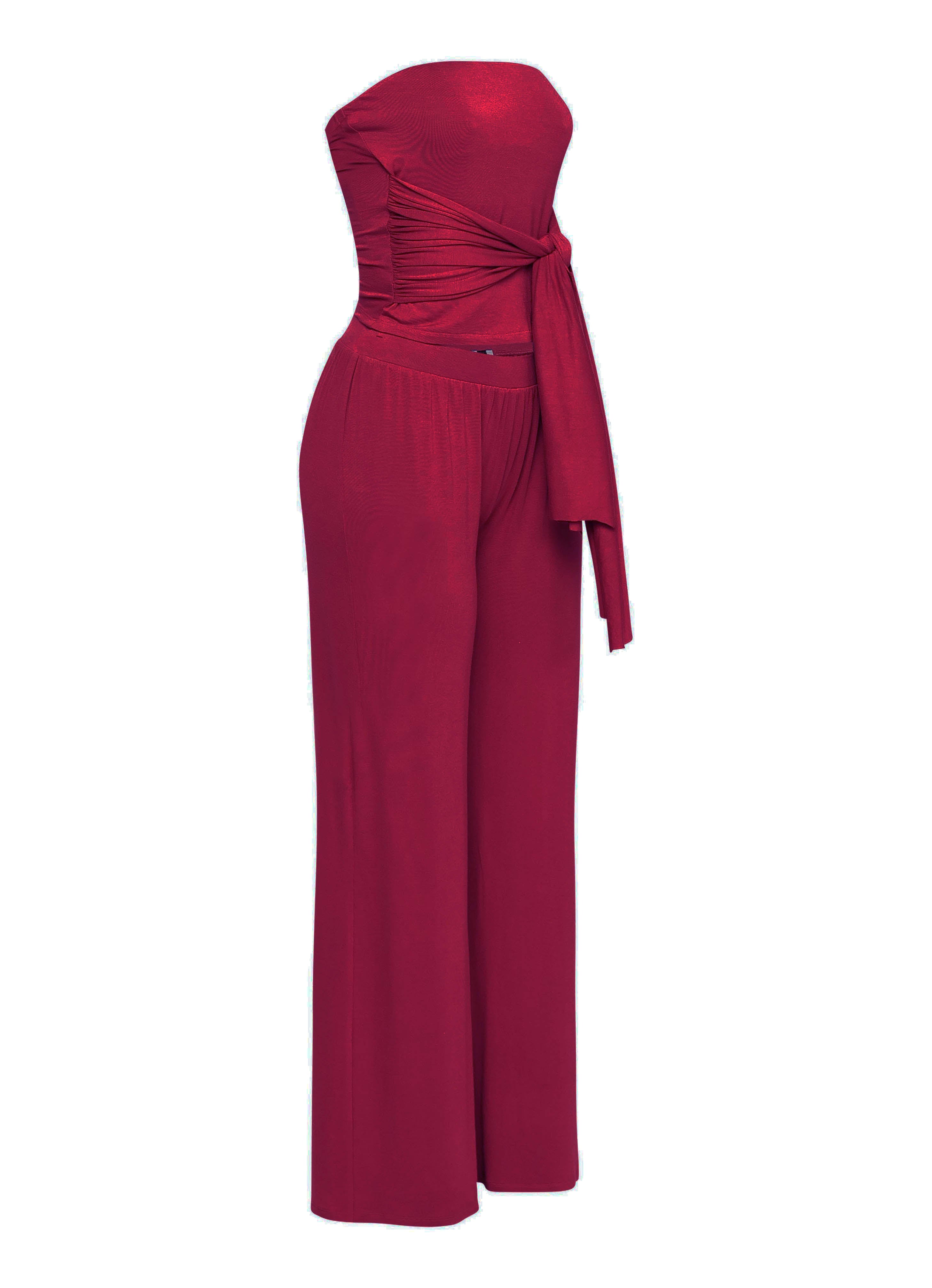 The one-piece slay your closet's been waiting for. The After Party Energy Strapless Tie Jumpsuit is all about effortless curves and soft confidence. Designed with a flattering tube top and front tie detail, it cinches you in at the waist and flows into wide-leg pants that give legs-for-days energy. Super stretchy, comfy, and wearable from brunch to rooftop cocktails. Bonus: the inseam's tall-girl approved.