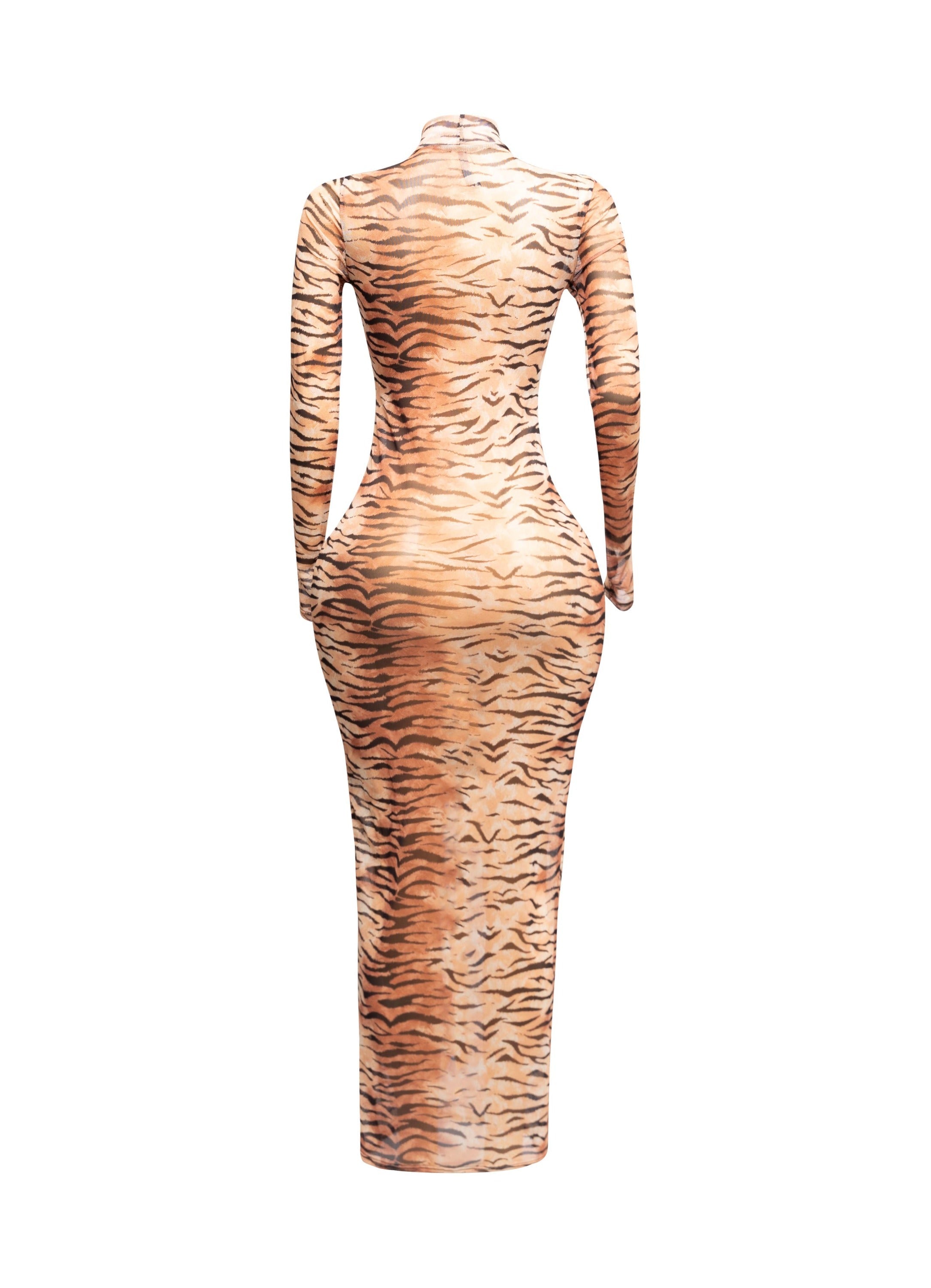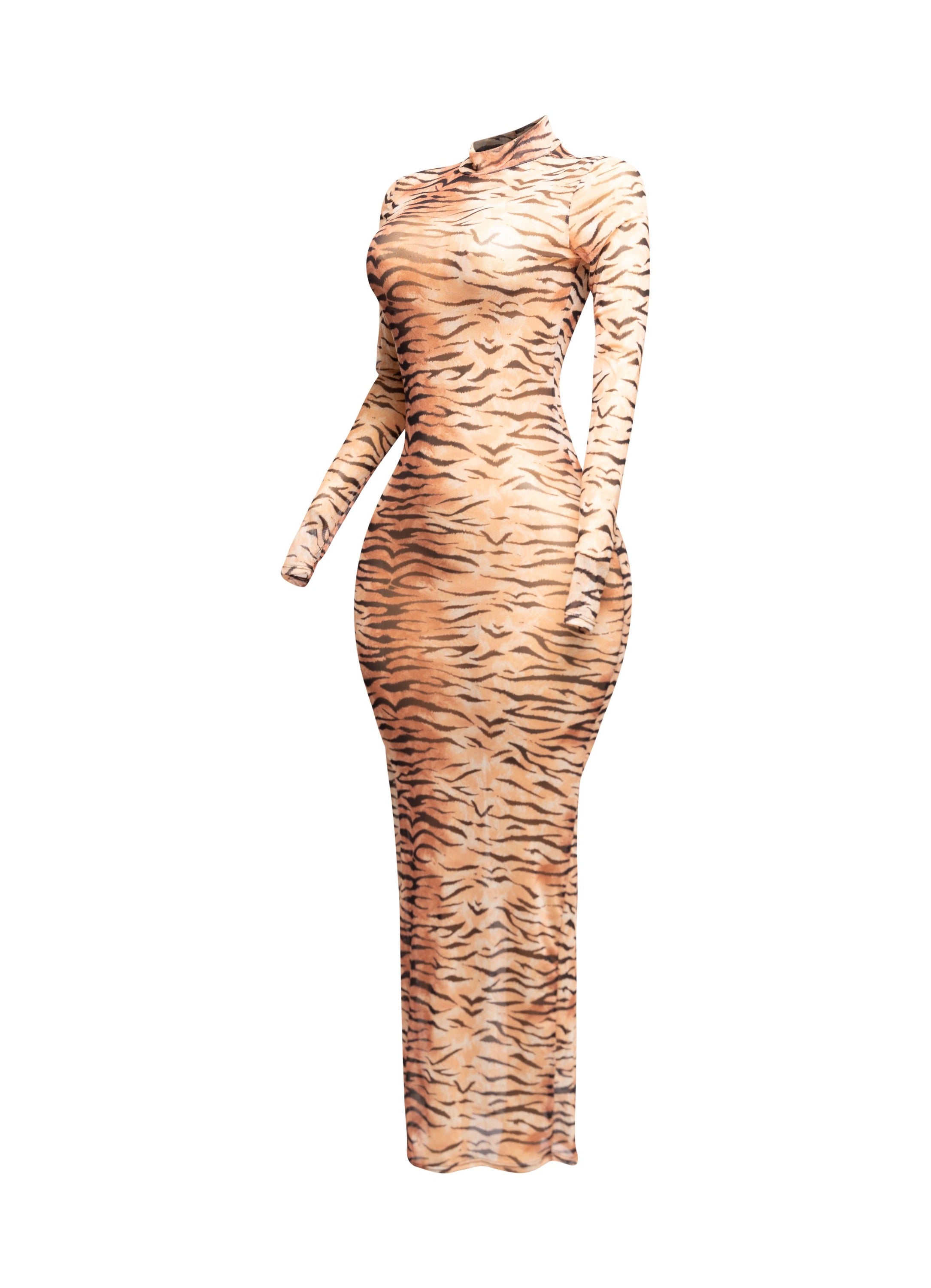 • Mock neck maxi dress • Long sleeve with thumb hole • Animal print • Zipper back • Sheer mesh...