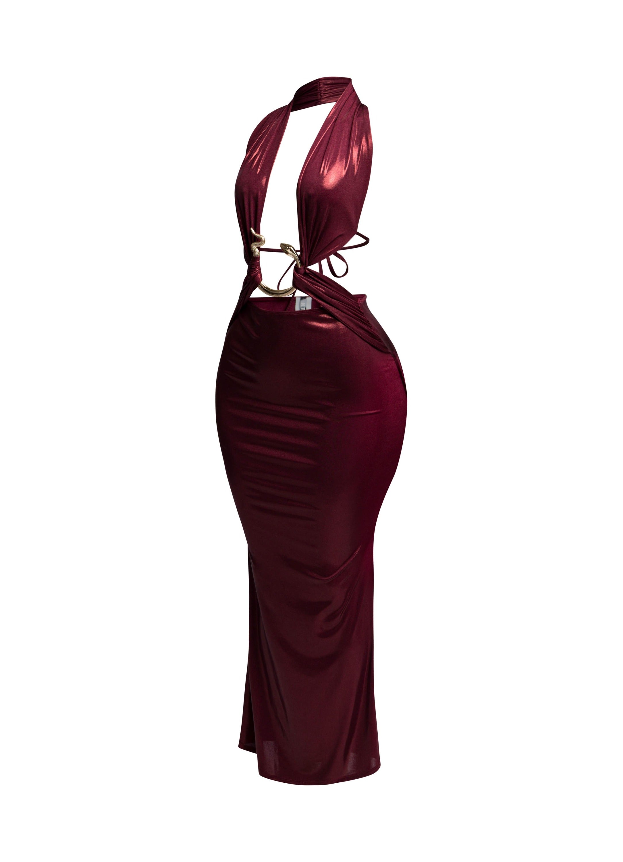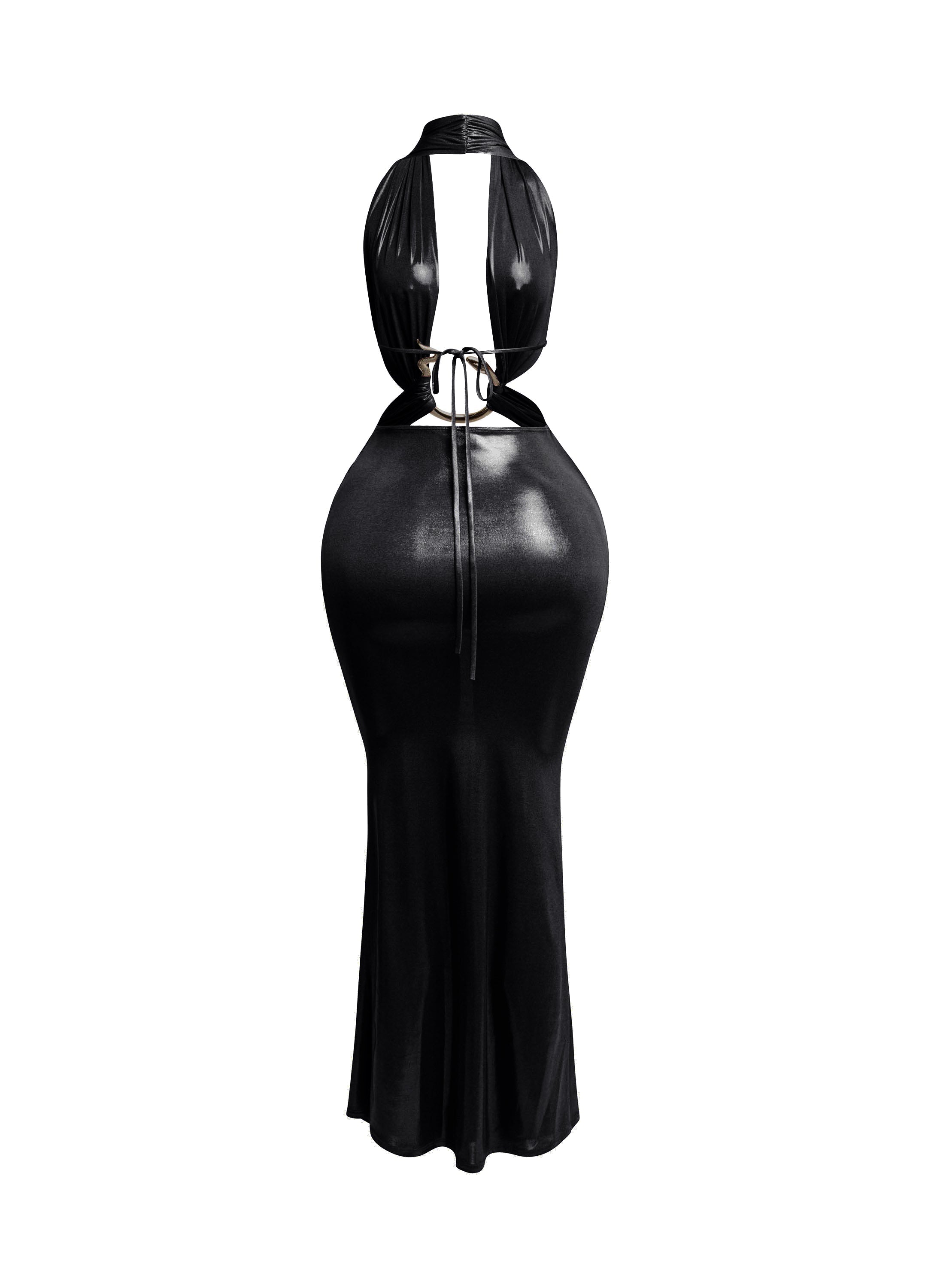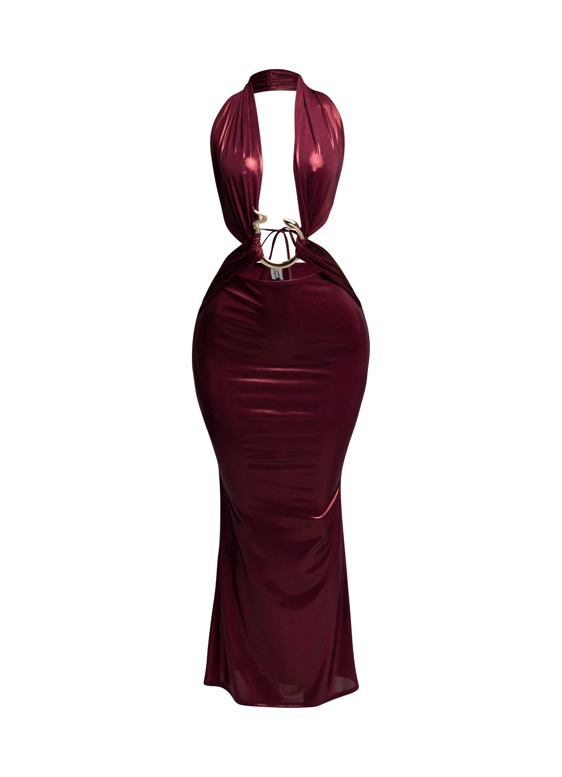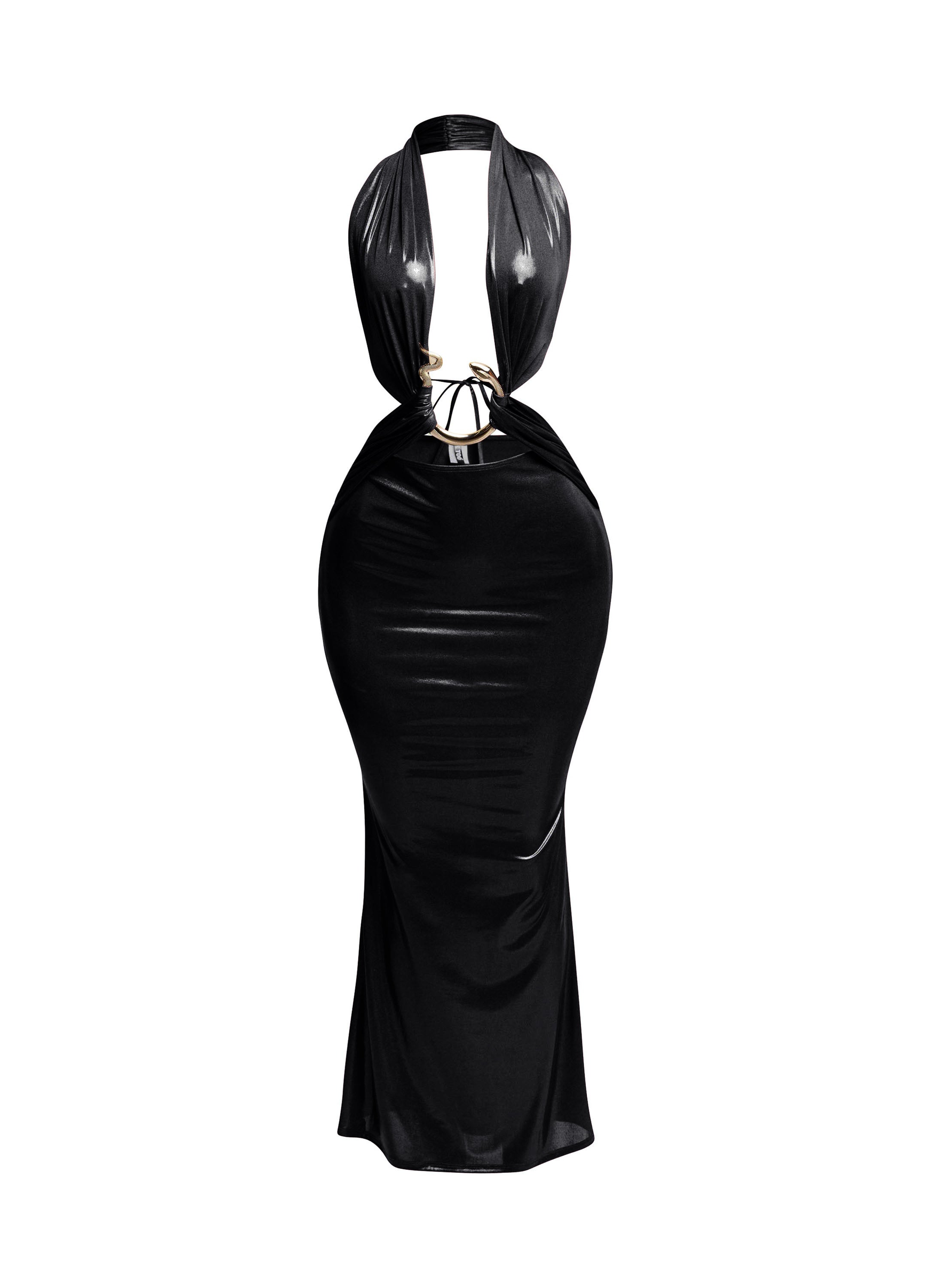 • Halter maxi dress • Backless • Gold trim detailed • Open front • Stretch • 95%Polyestser 5%Spandex • Length...