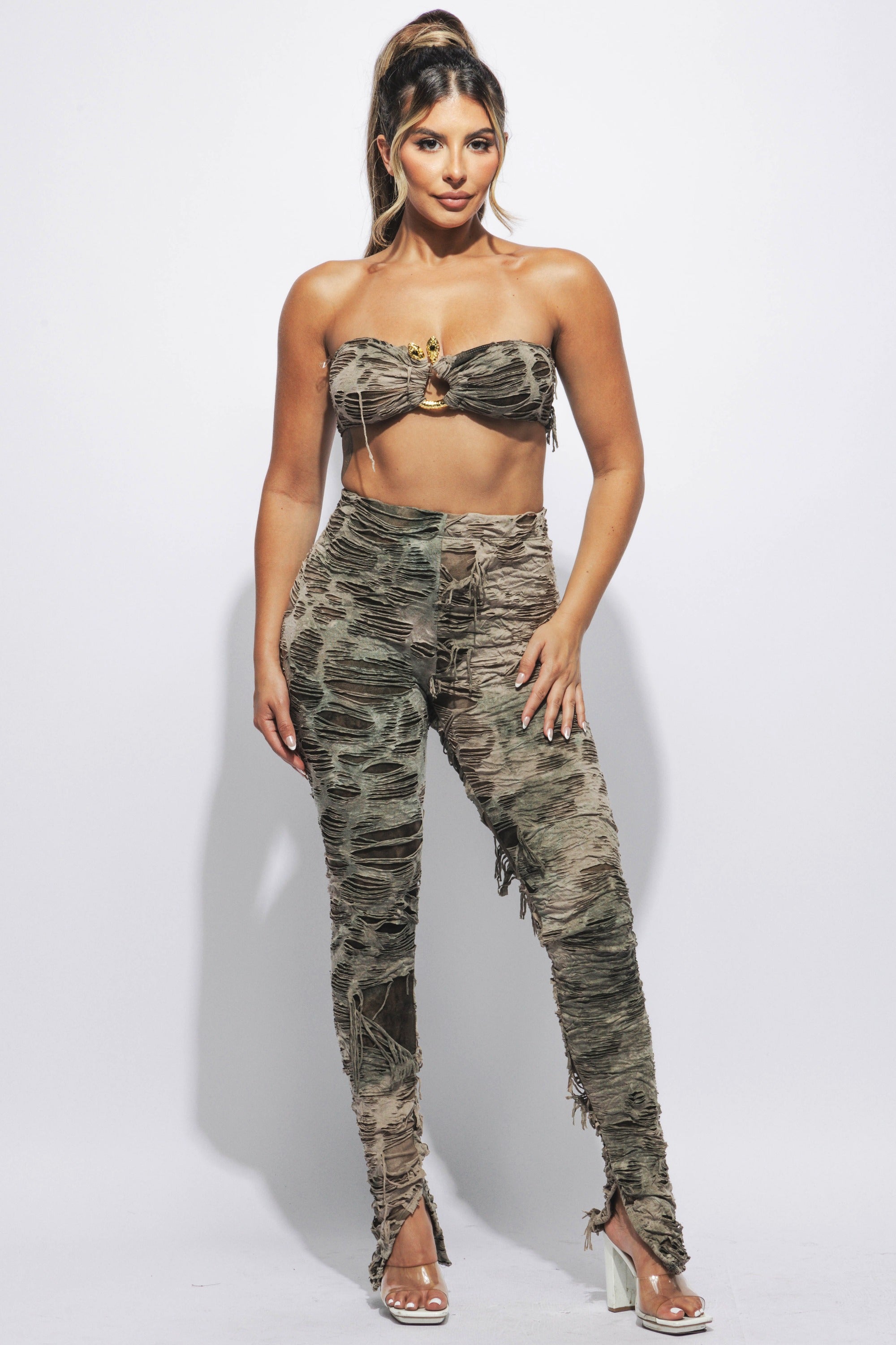 Elevate your style with our stunning bandeau top and pants set. Featuring a chic distressed pattern and form-fitting design, this...