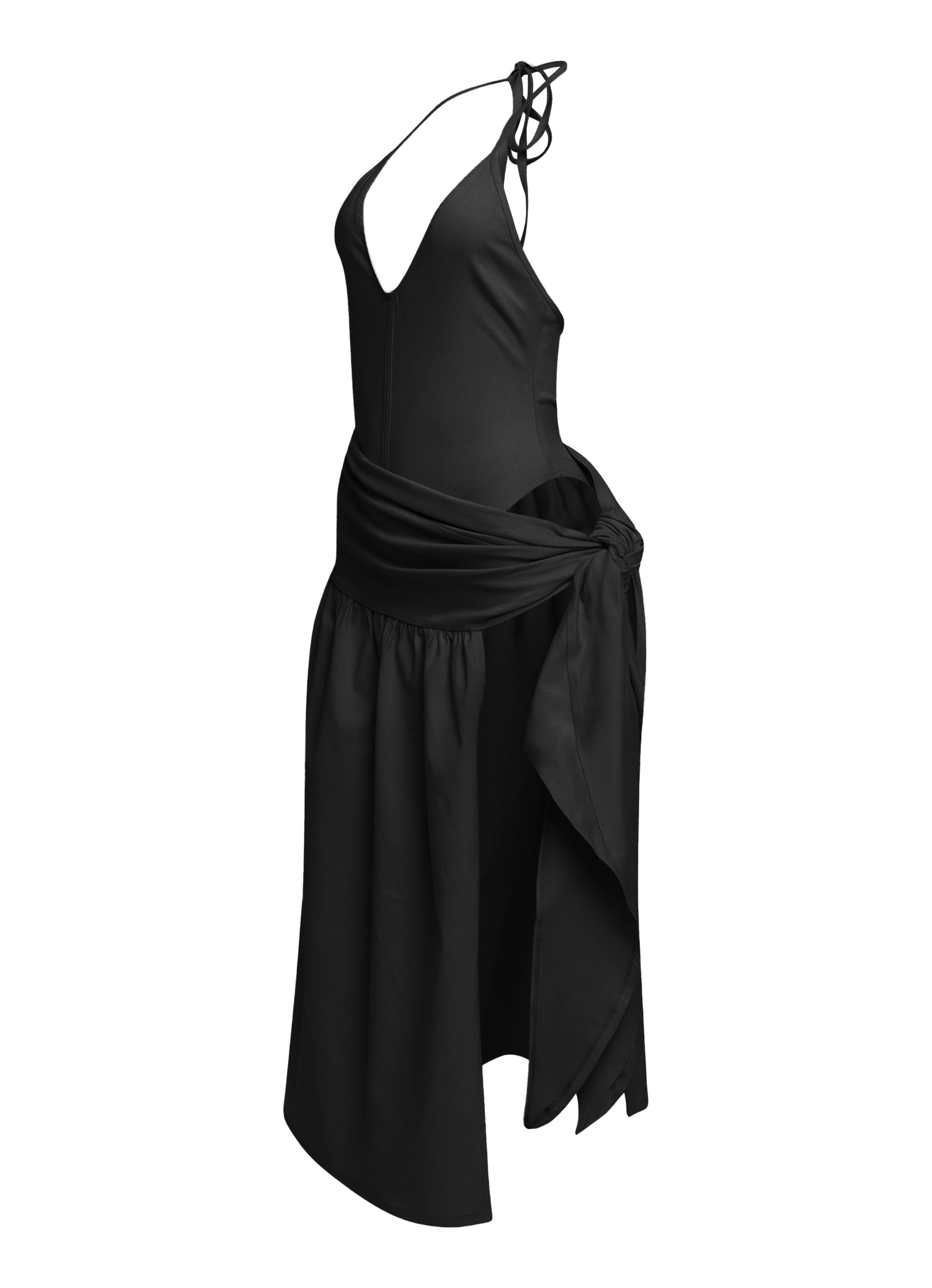 Coastal Flirt Halter Midi Dress with Tie Waist Detail Black
