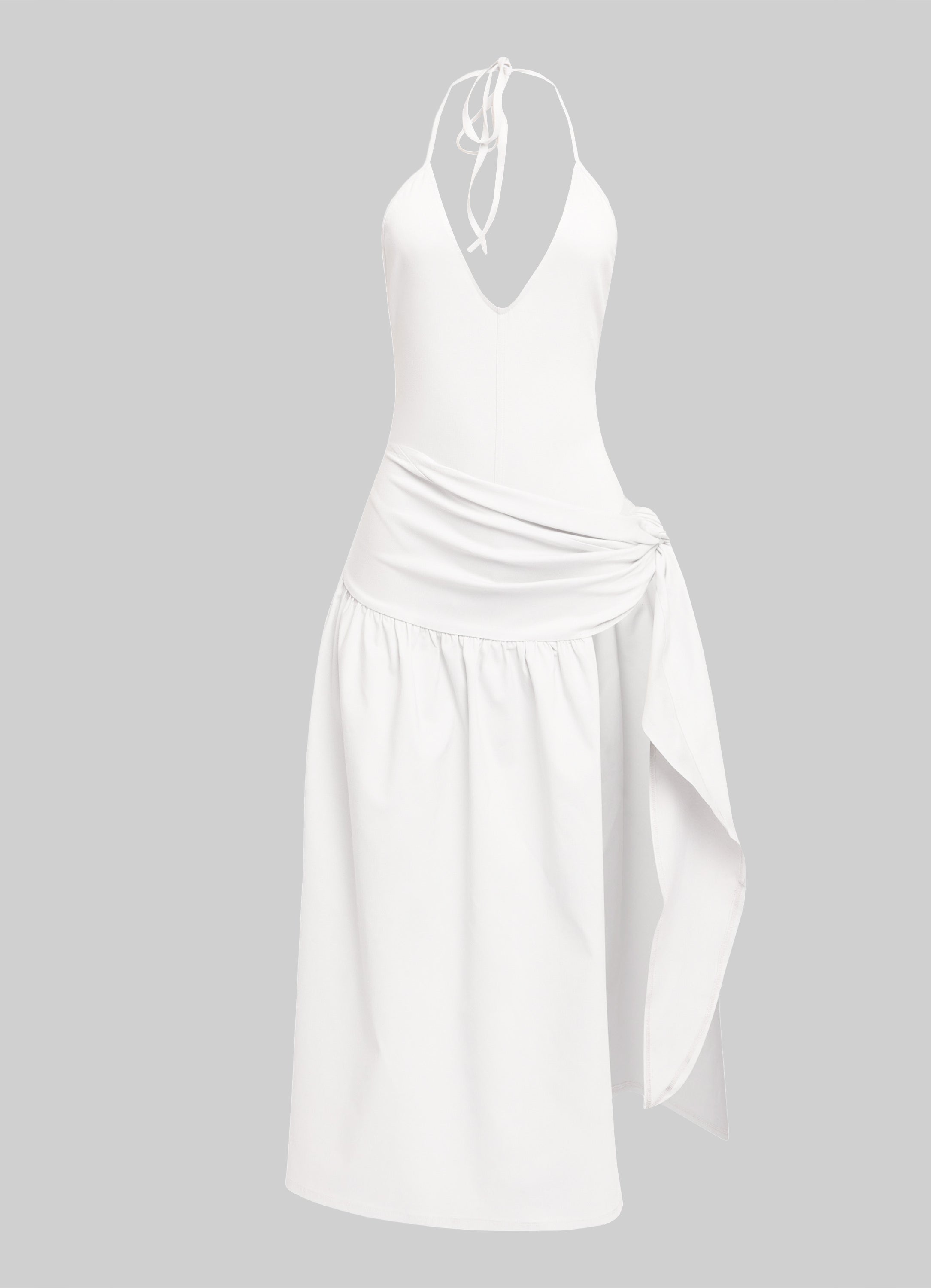 Warning: temperatures may rise. This halter midi dress is a full-body serve in every color. Designed with a curve-hugging bodysuit base, a snap-back halter neckline, and a dramatic tie-waist skirt with a high leg reveal, it’s giving goddess energy with zero effort. The woven stretch-blend fabric flatters your shape while the wrap overlay brings the drama. Style it with lace-up heels and a sleek bun for a rooftop moment or resort escape.