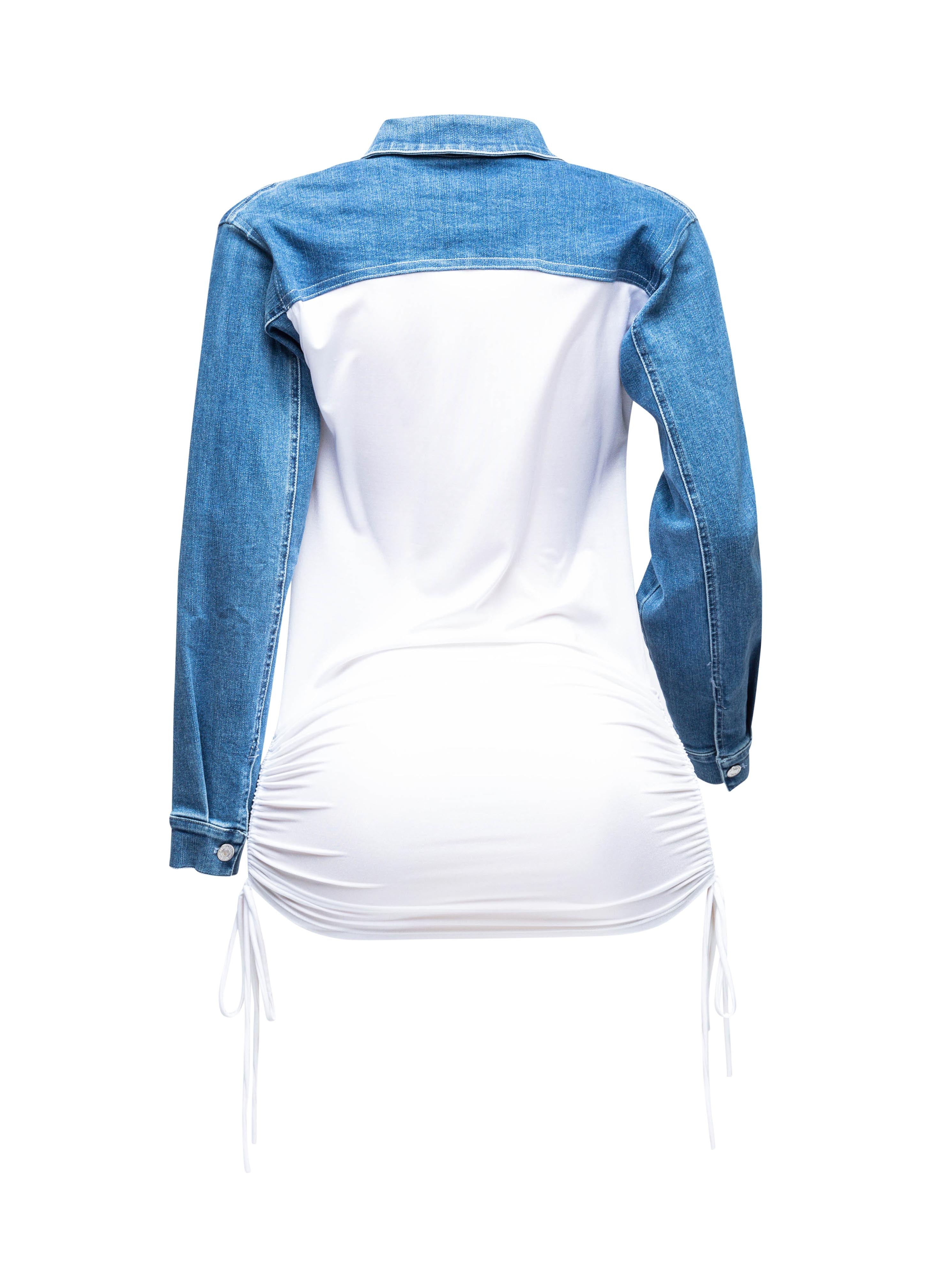 • Available in black and white with denim contrast• Denim yoke detail• Cowl neck front• Ruched skirt detail• Stretch body•...