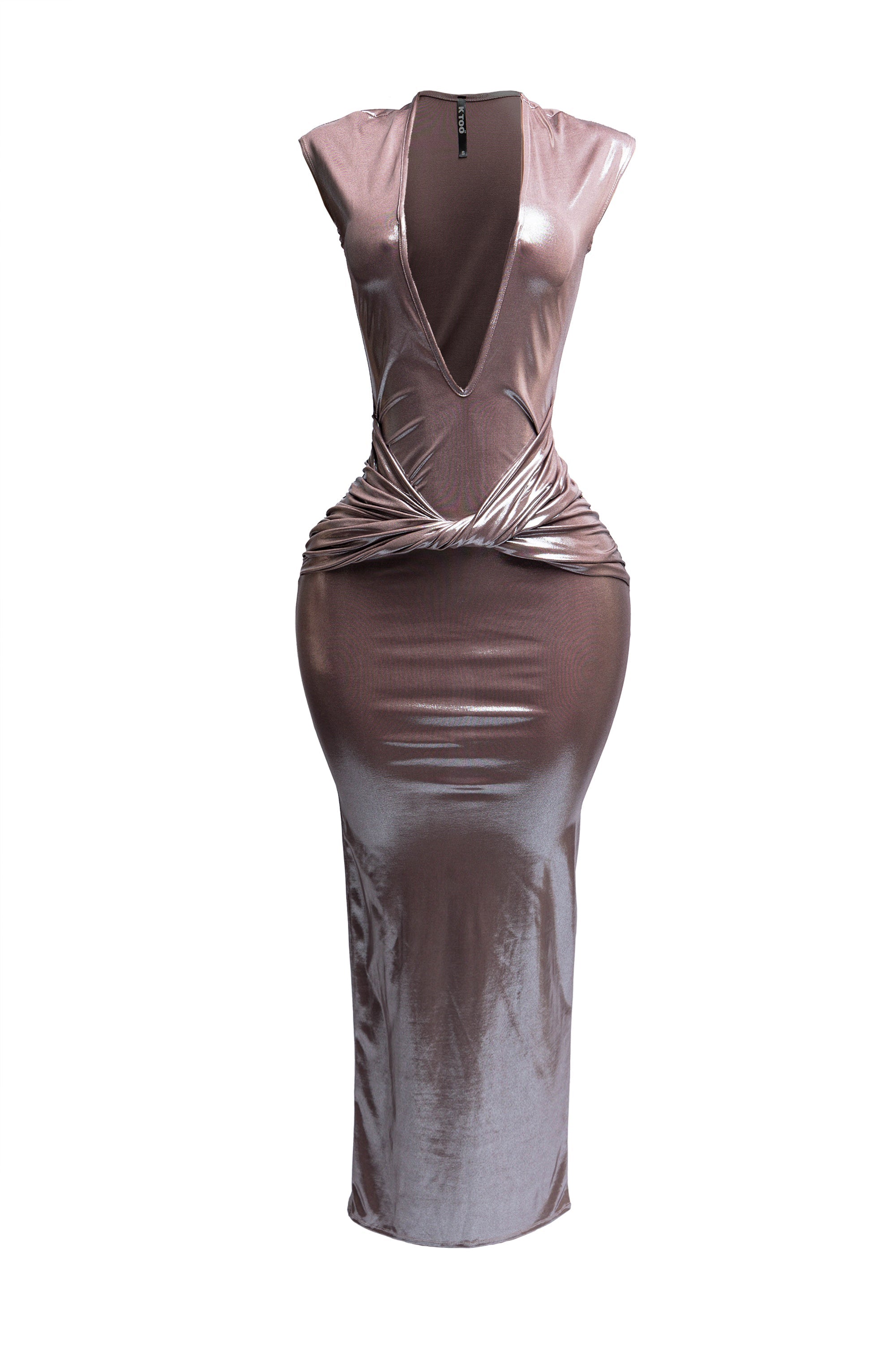 • Deep V neck• Covered shoulder cuffs• Twisted front detail• Maxi dress• Stretch • 95%Polyester 5%Spandex• Length : 57"(HPS)• Imported