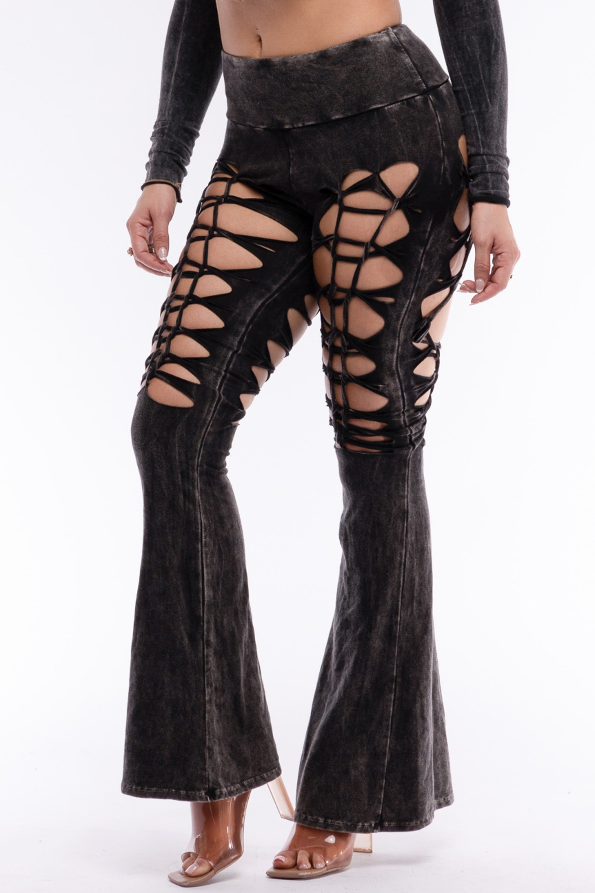 Dare to standout with these eye-catching Cut and Tie Mineral Wash Flared Pants. Featuring a bold design with side cut-outs...