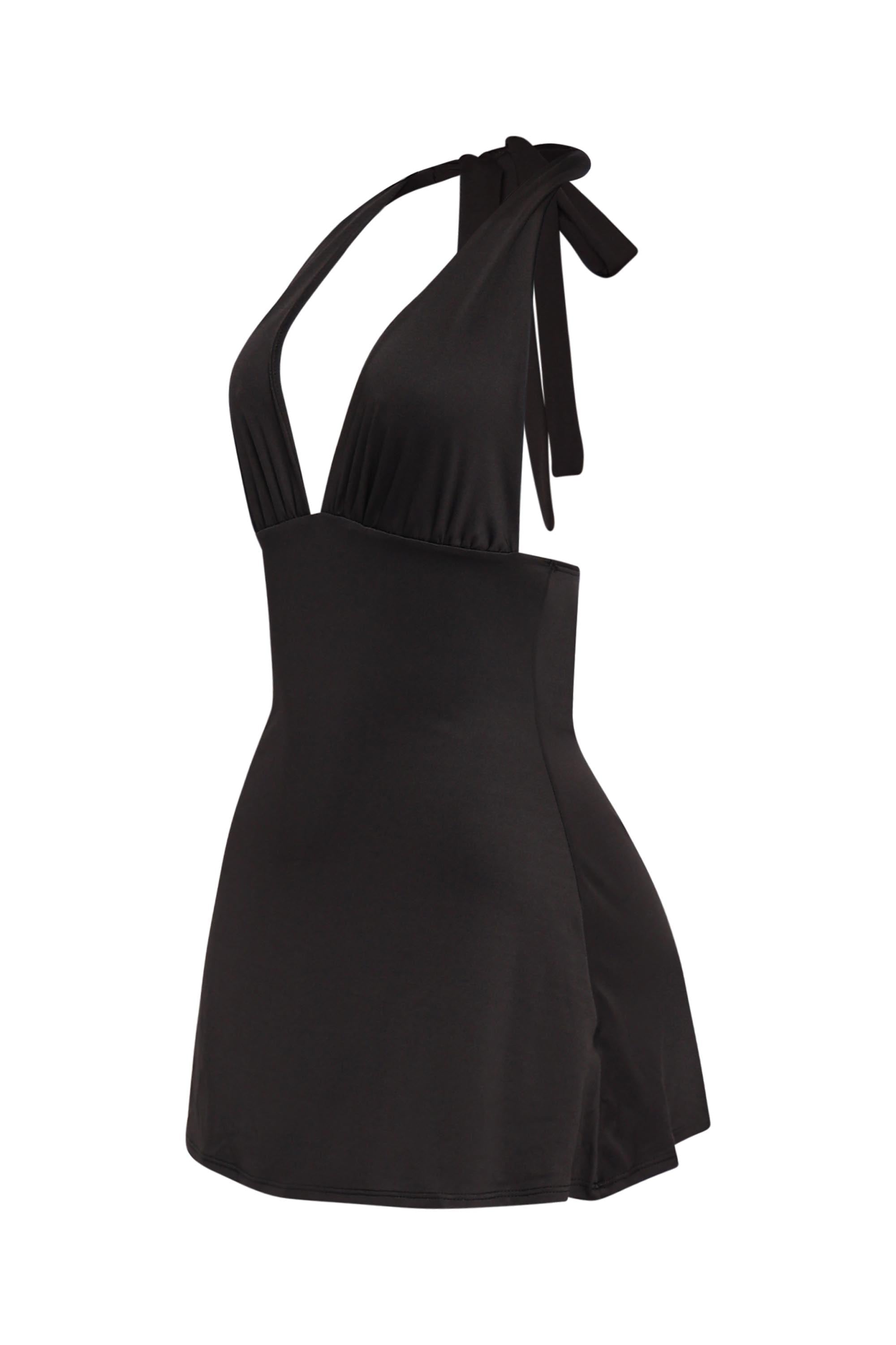 Dive Into Me Halter Mini Dress with Tie Back and Plunge Black