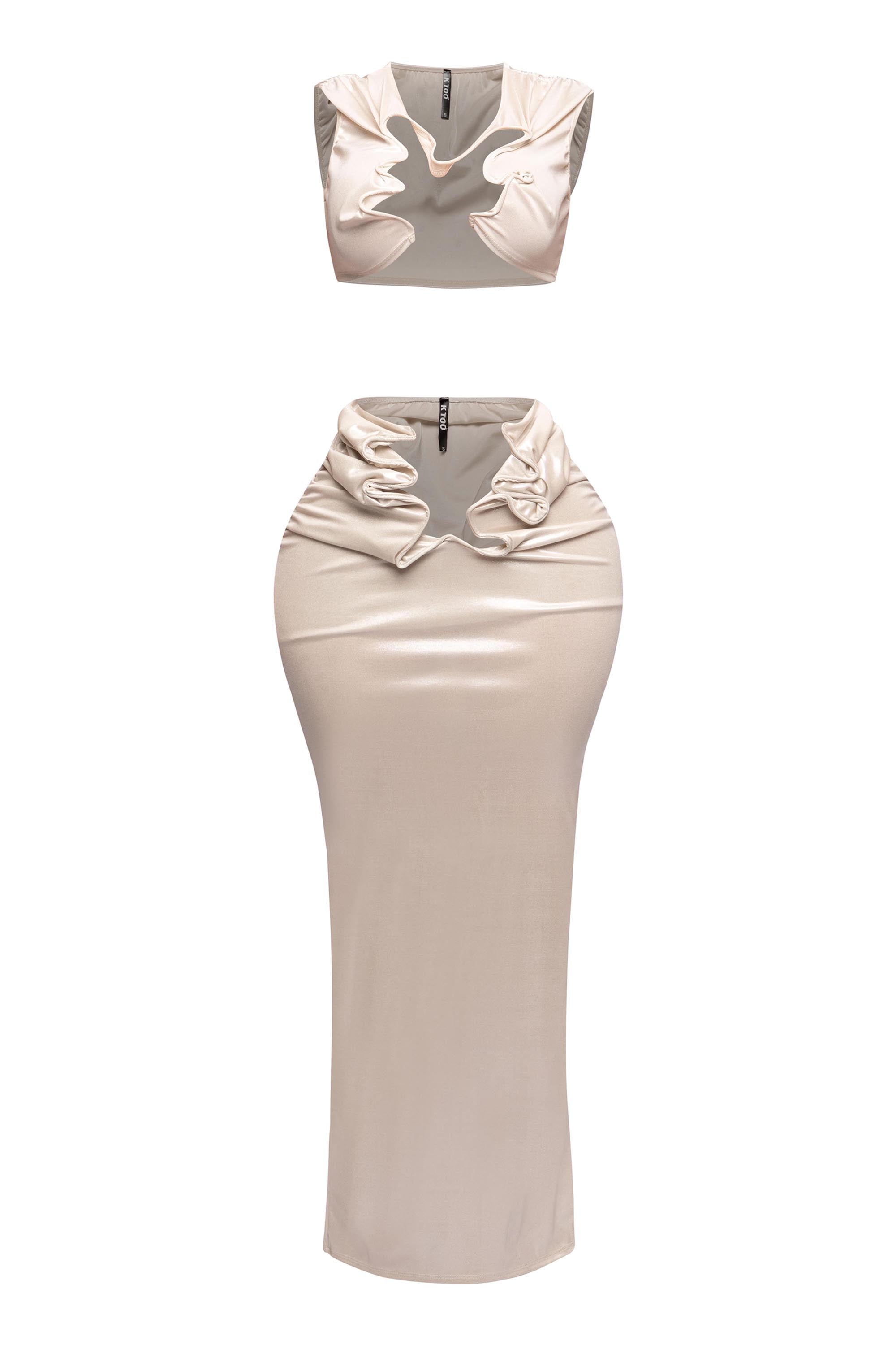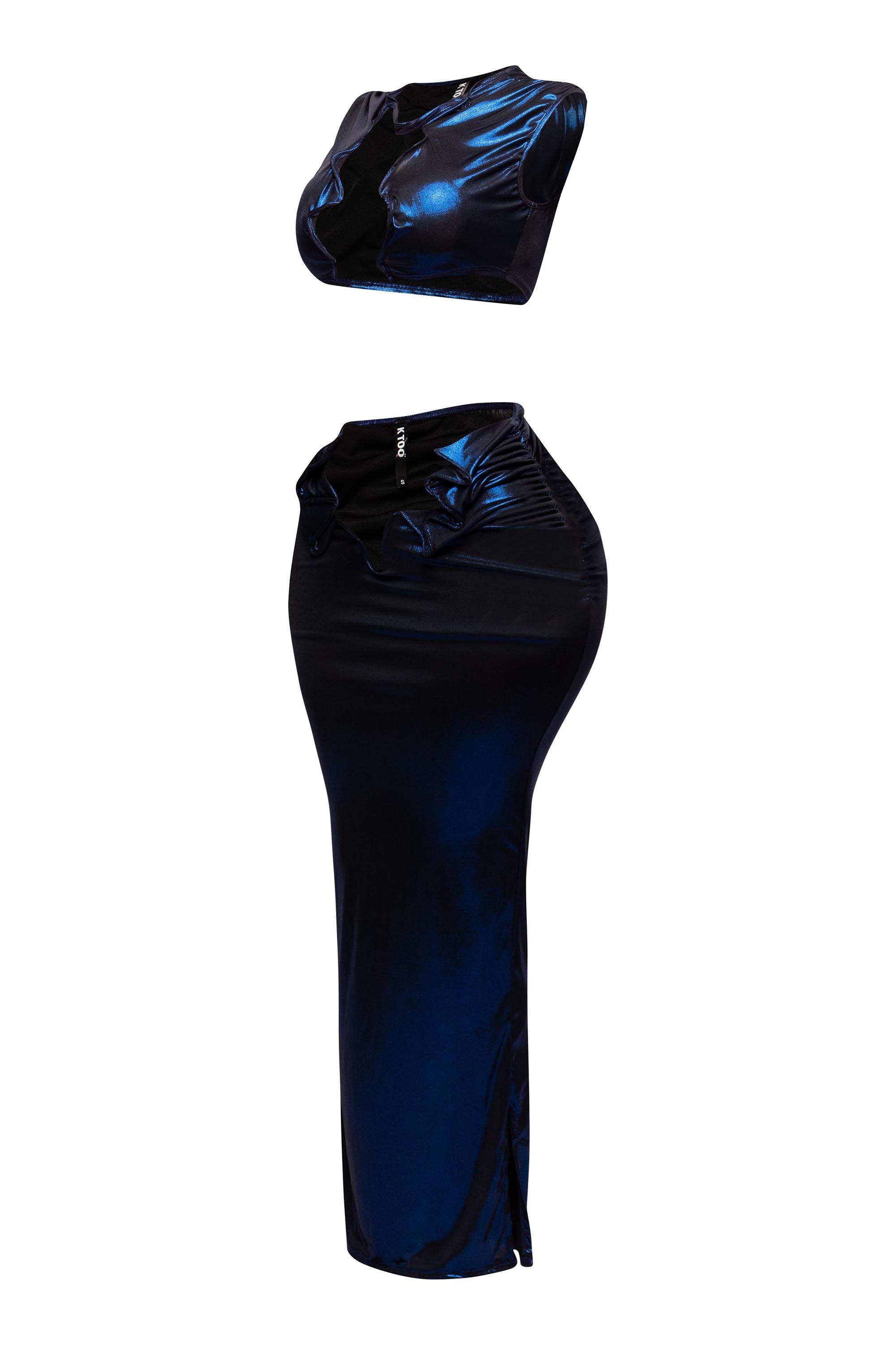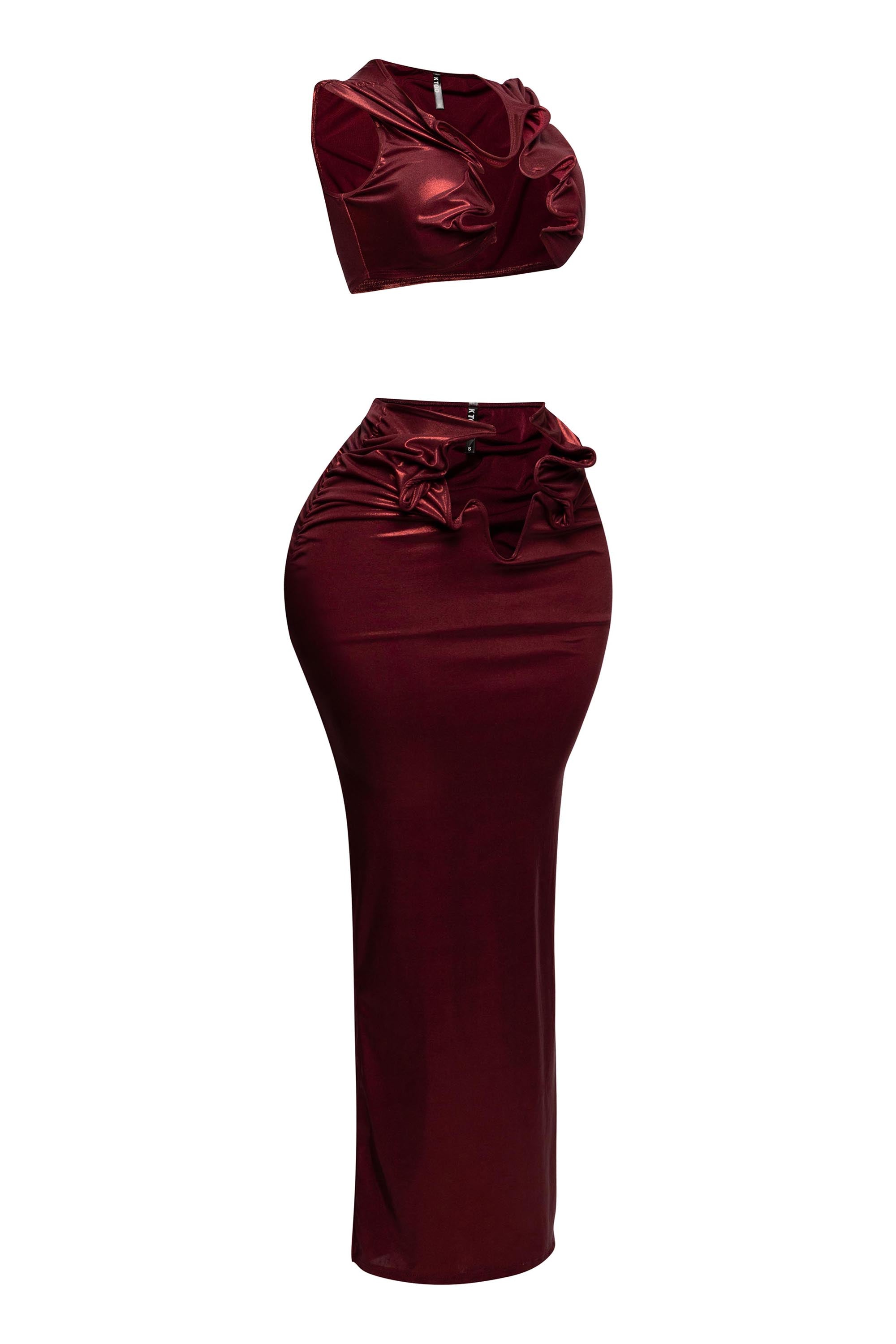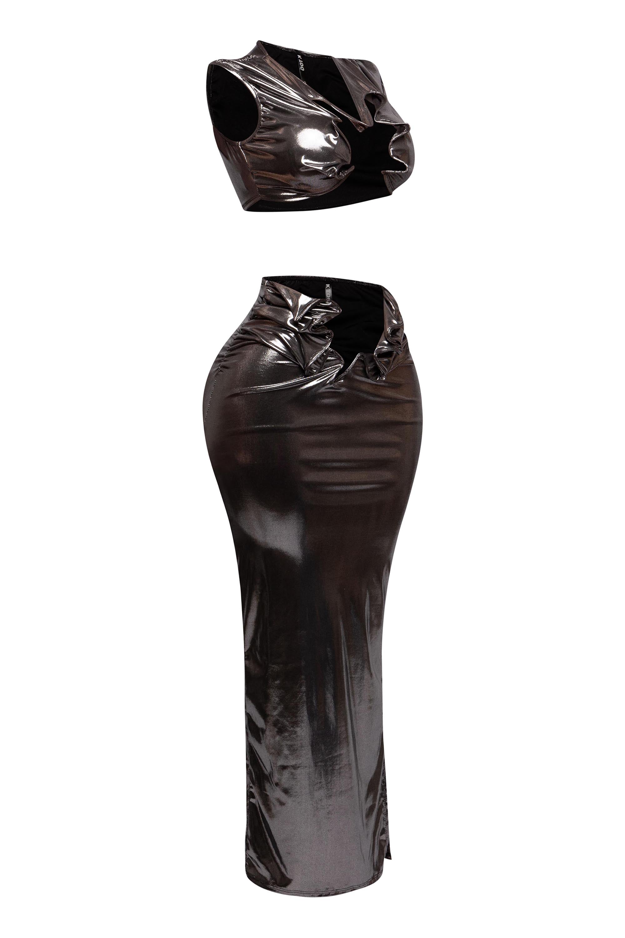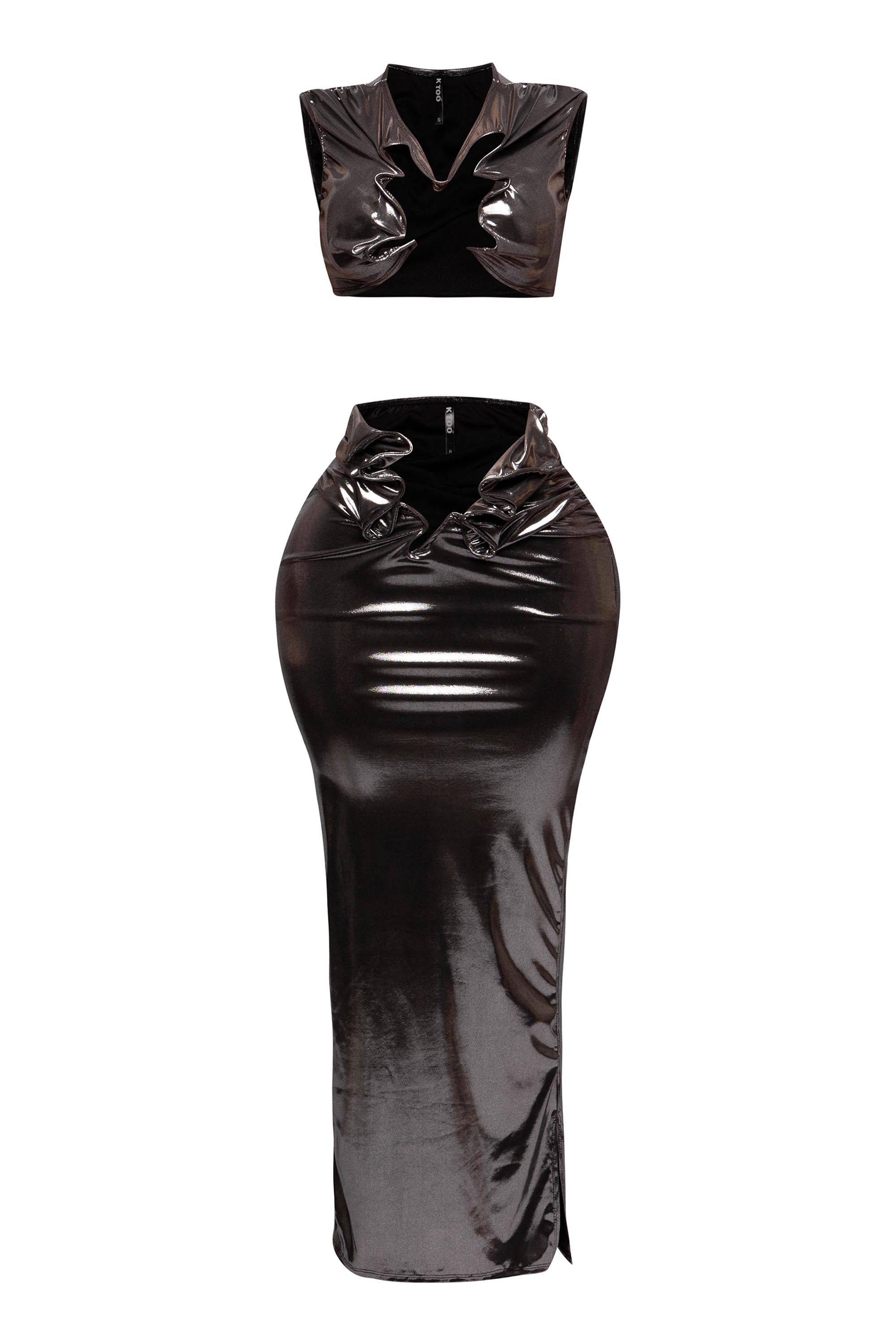 • Foiled skirt set • Flex wire detail • Sleeveless crop top • Maxi skirt • Pull on style •...