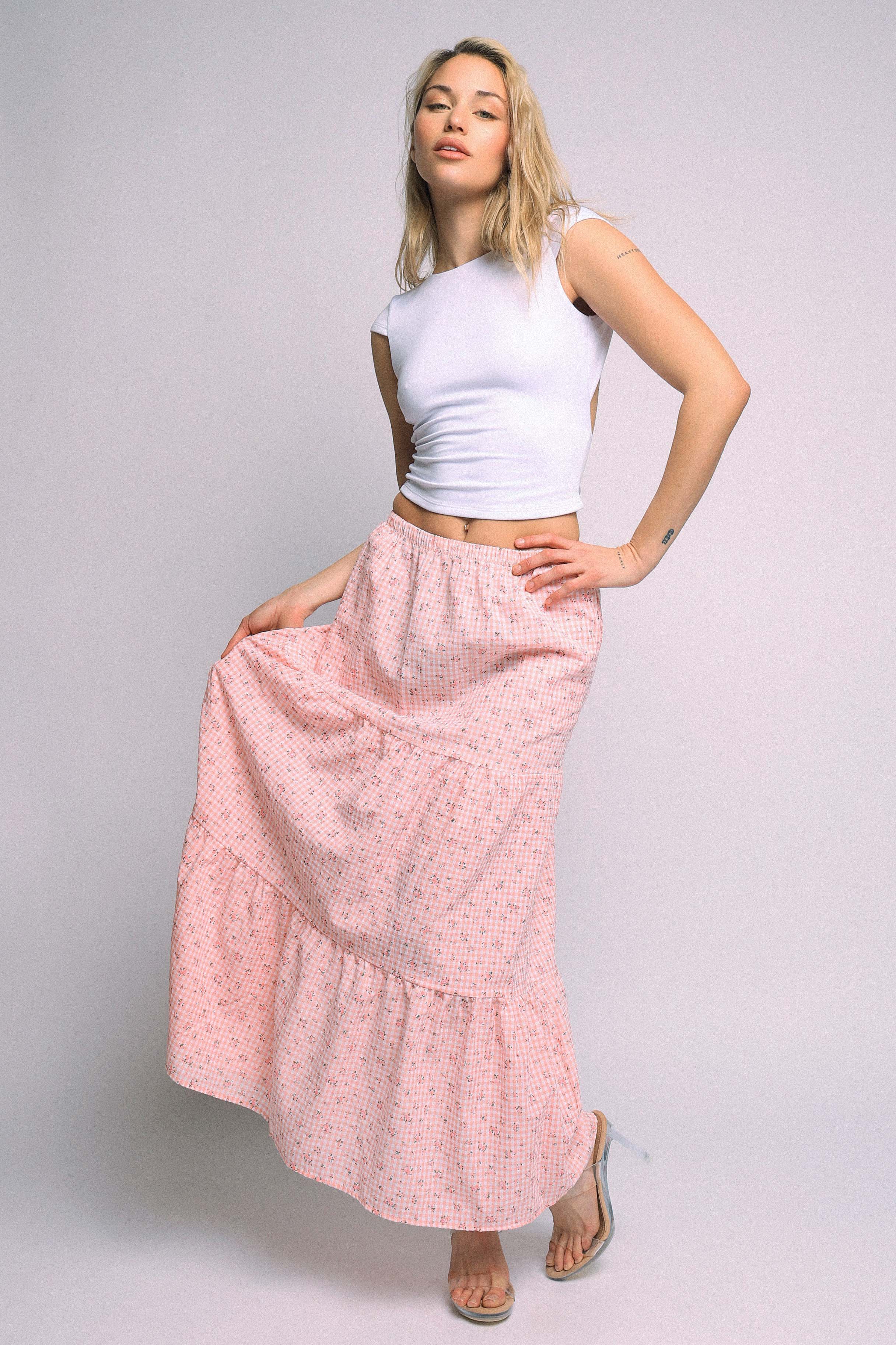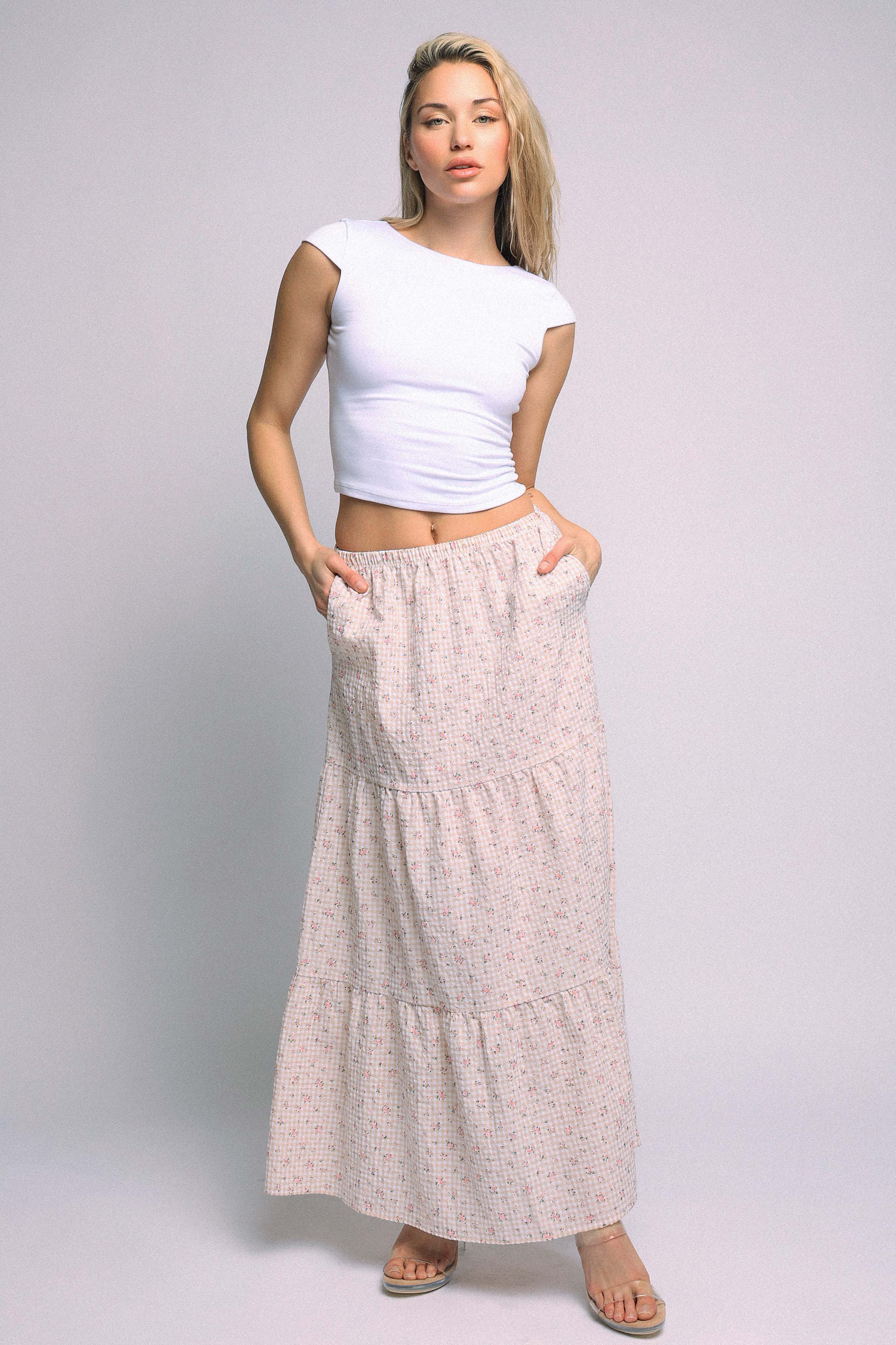 Lightweight textured fabric with floral pattern Elastic waistband for a comfortable fit Flowing tiered silhouette Maxi length with side pockets...