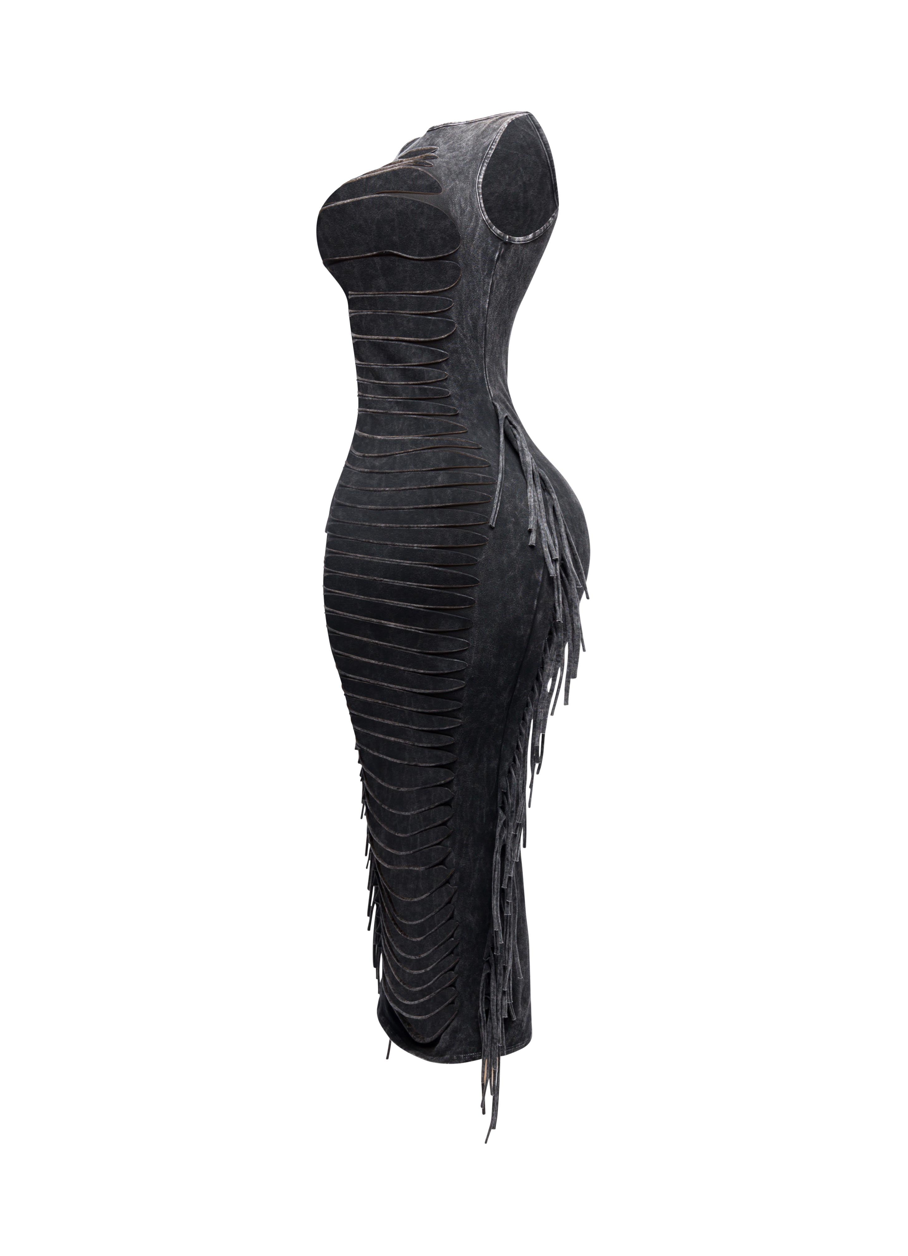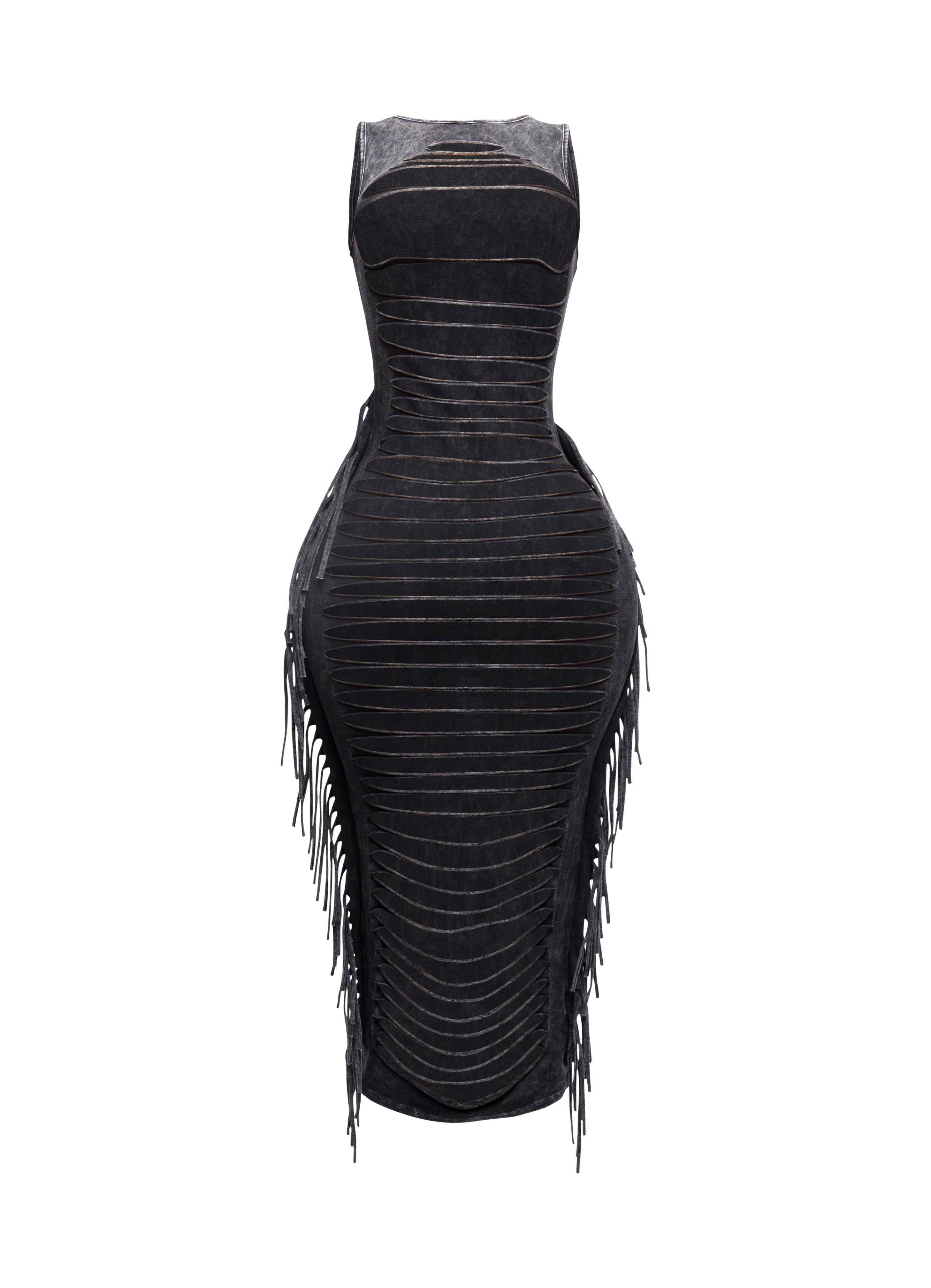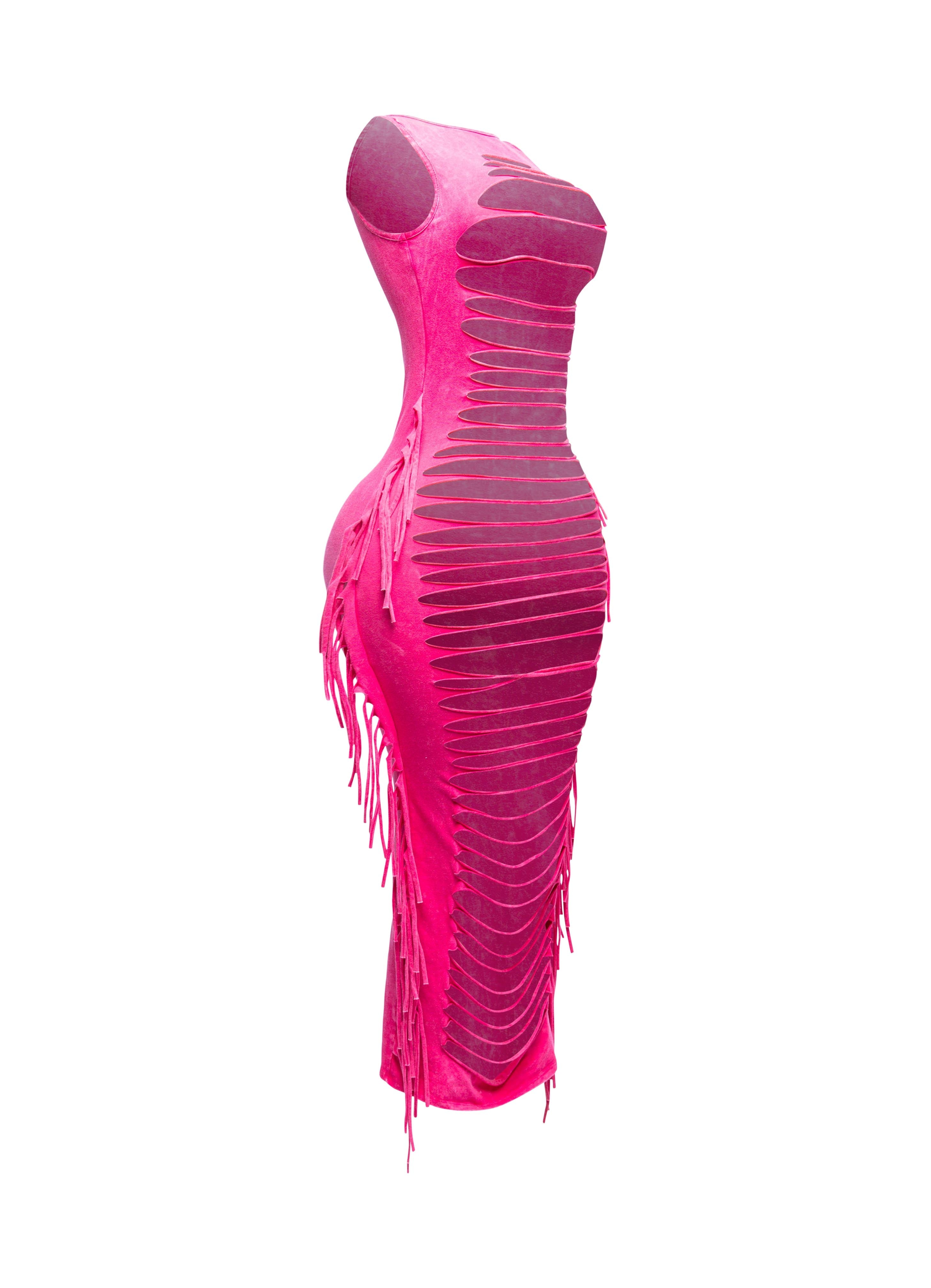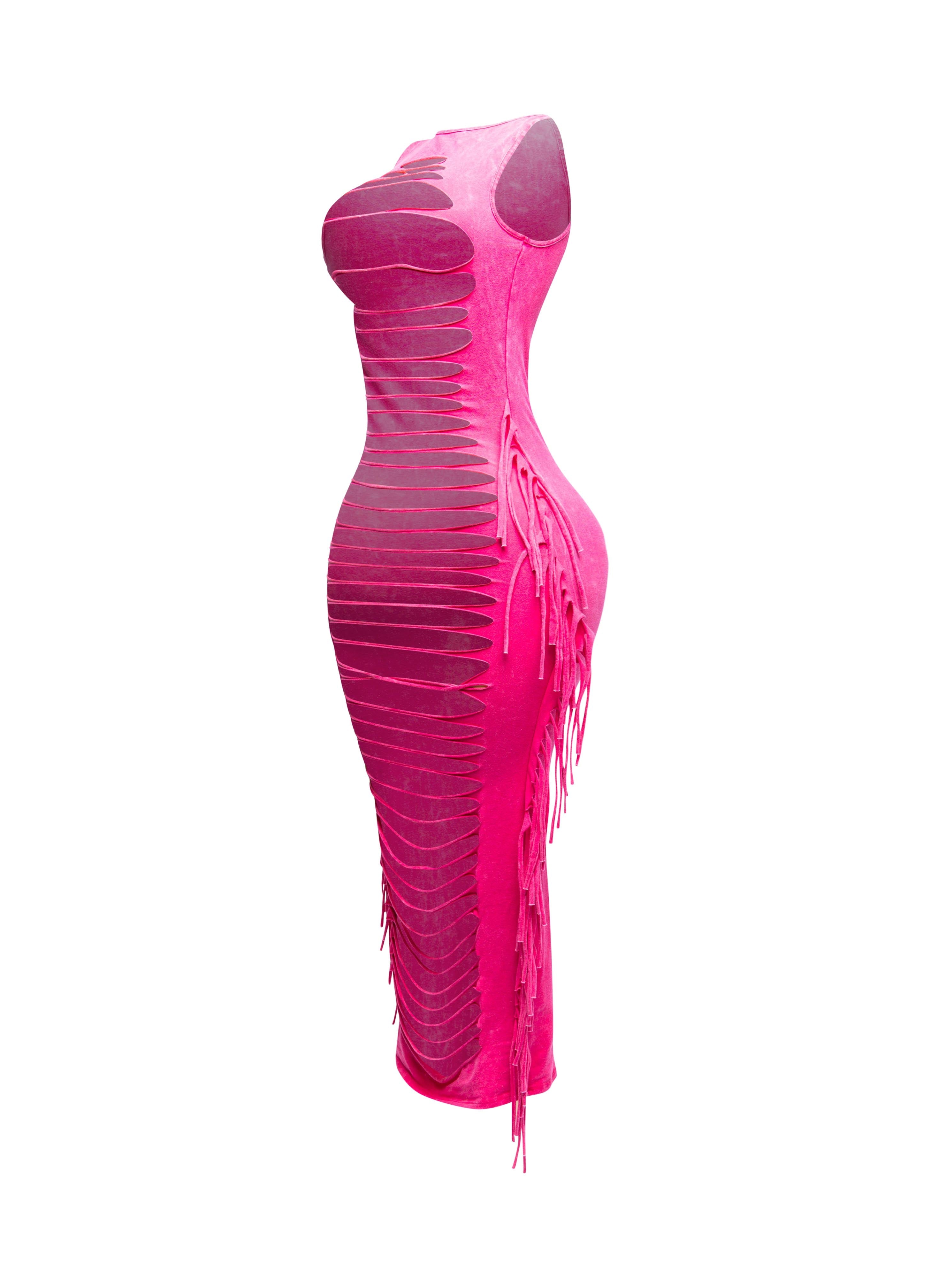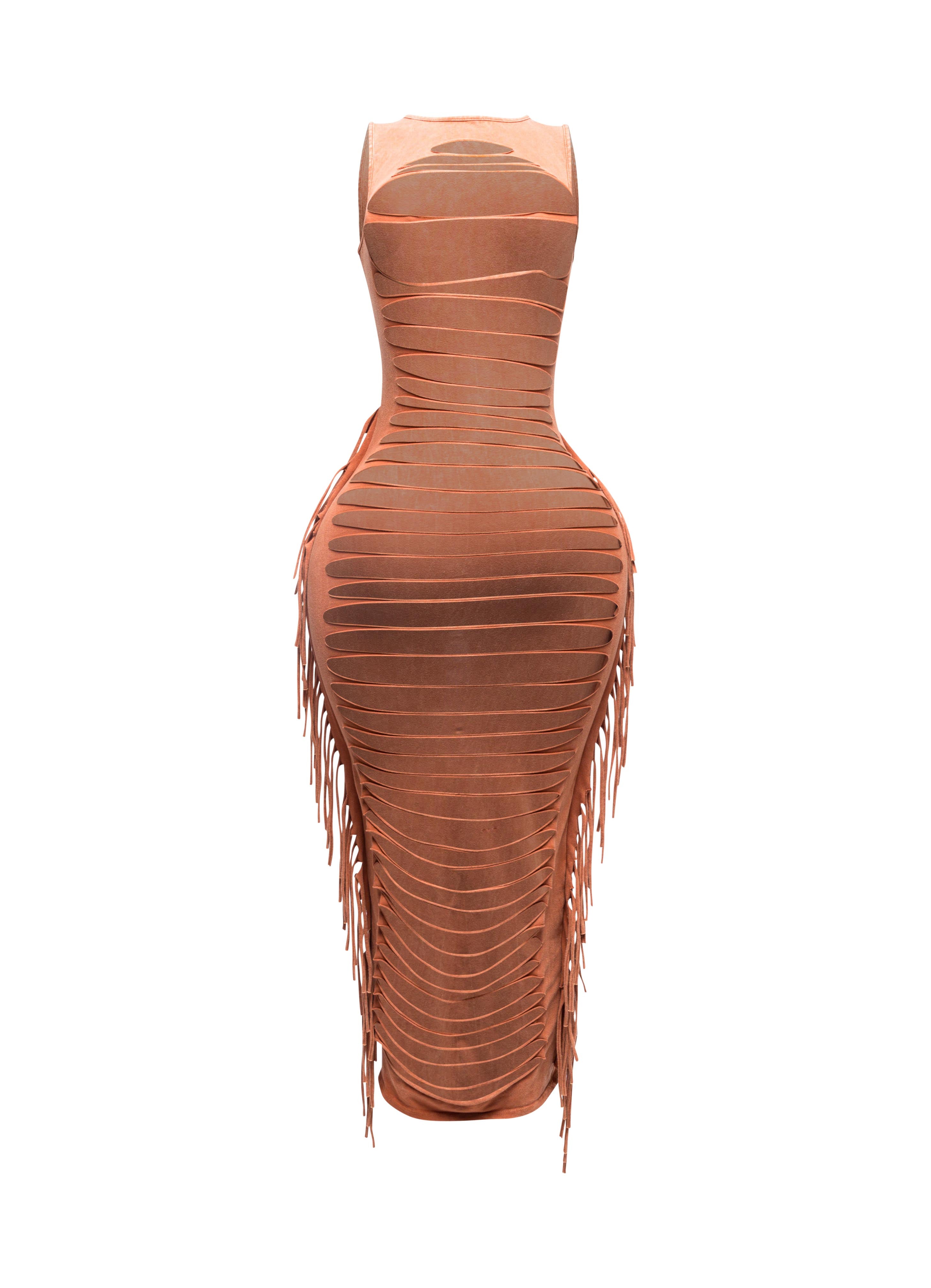 Turn up the heat with this daring fringe cut-out maxi dress, designed to make a bold statement. Perfect for the...