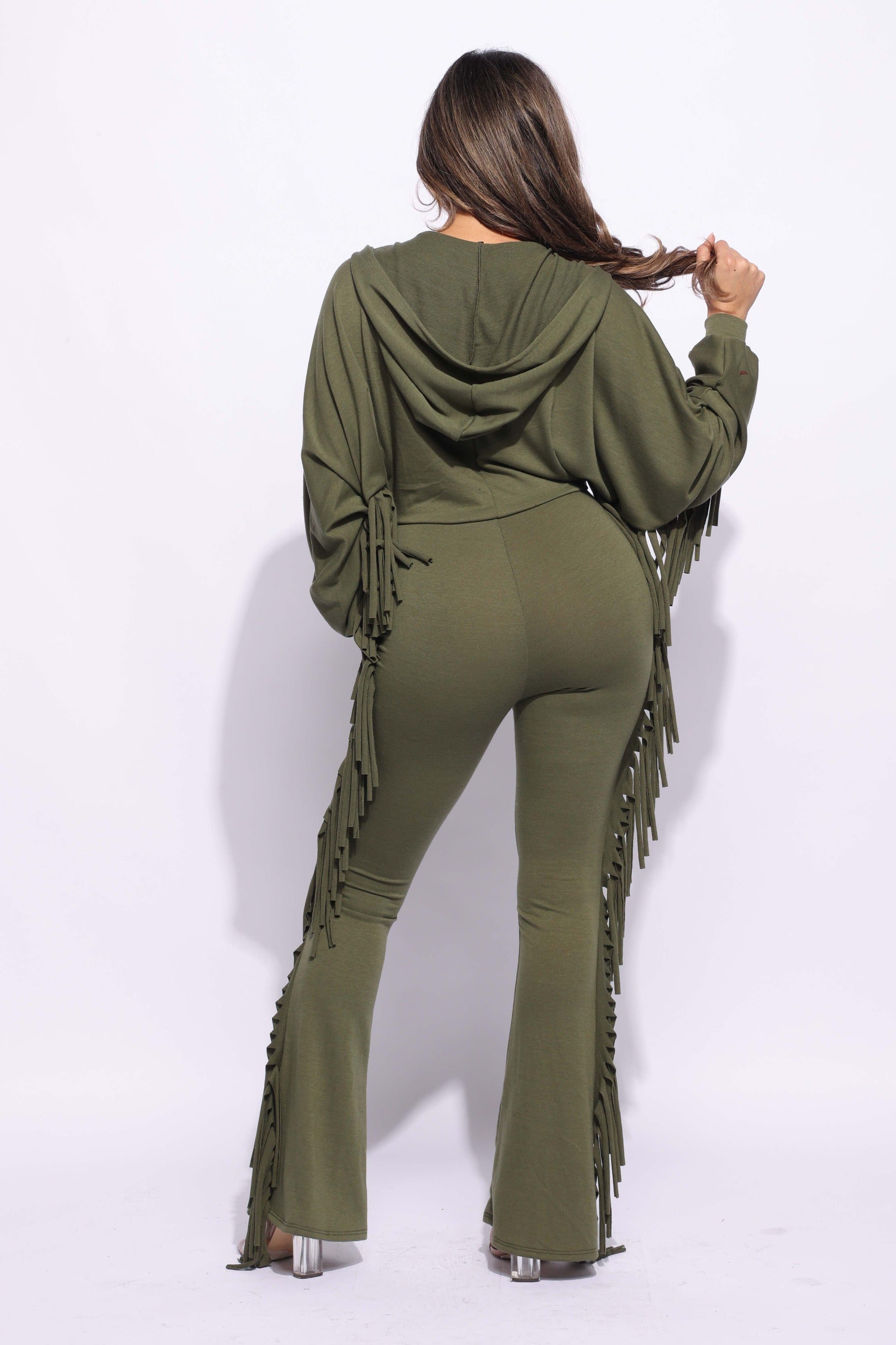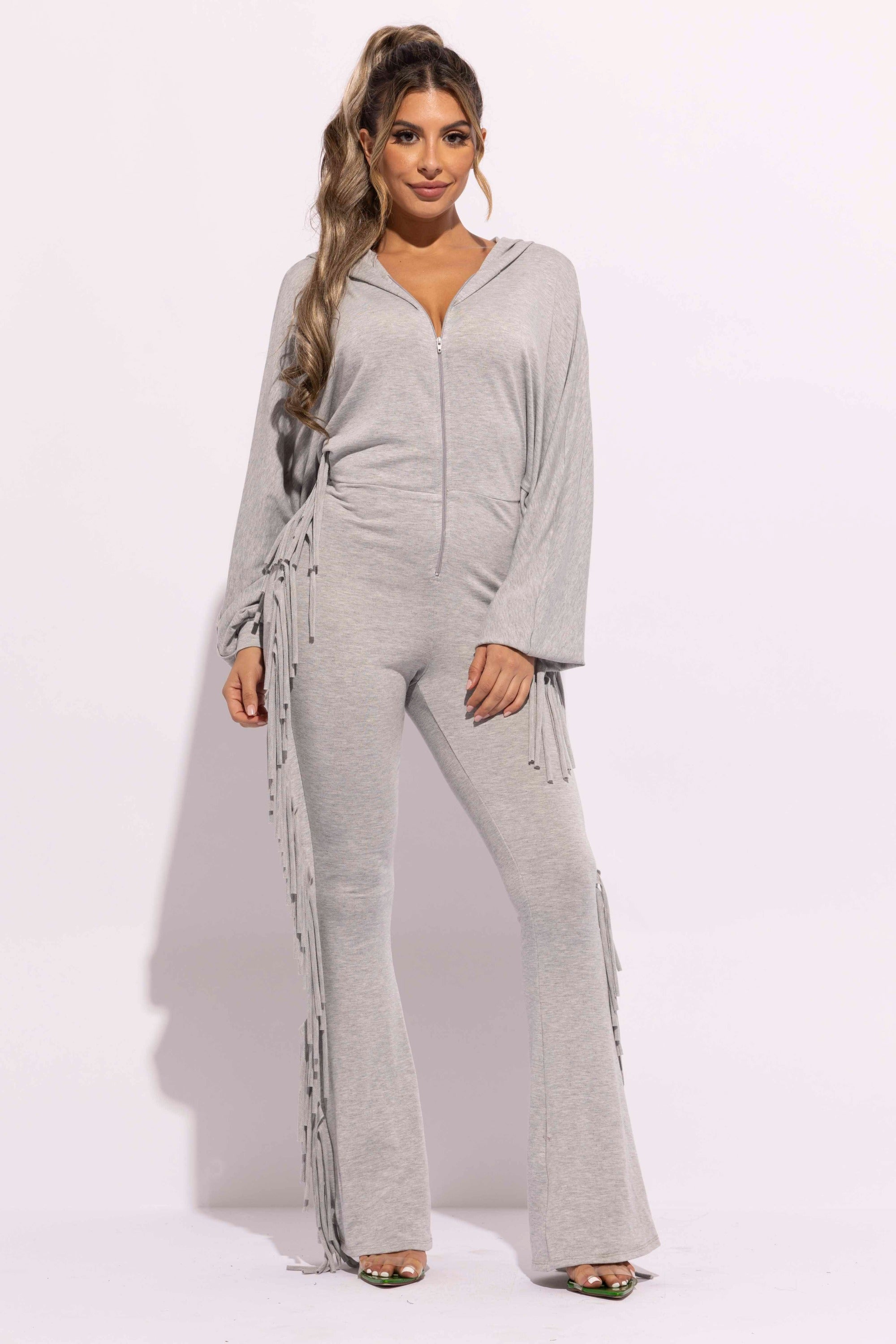 Effortless style with our Front Zipper Fringe Jumpsuit. Featuring a zippered front, fringe detailing, batwing sleeves, and a hoodie for...
