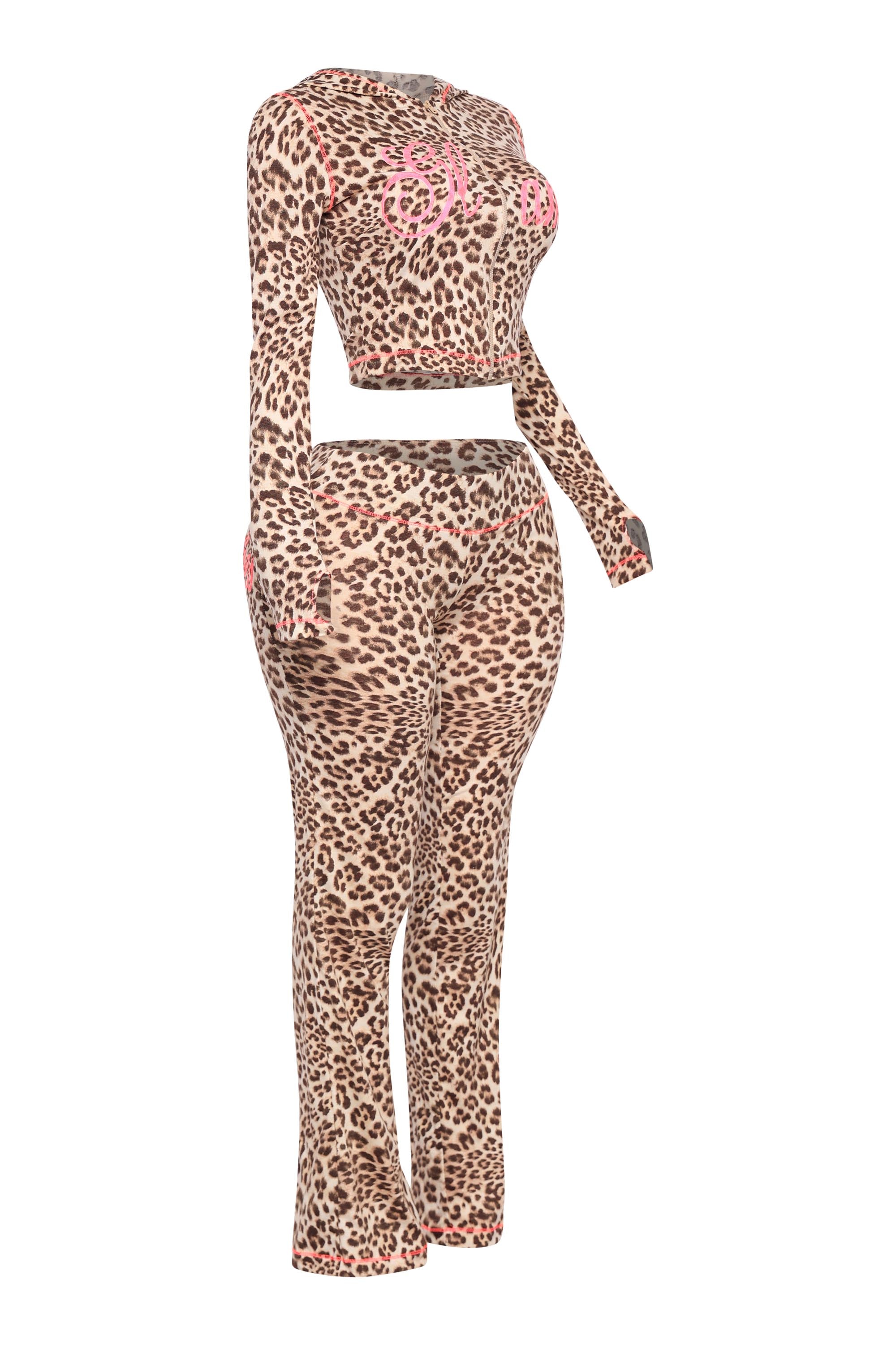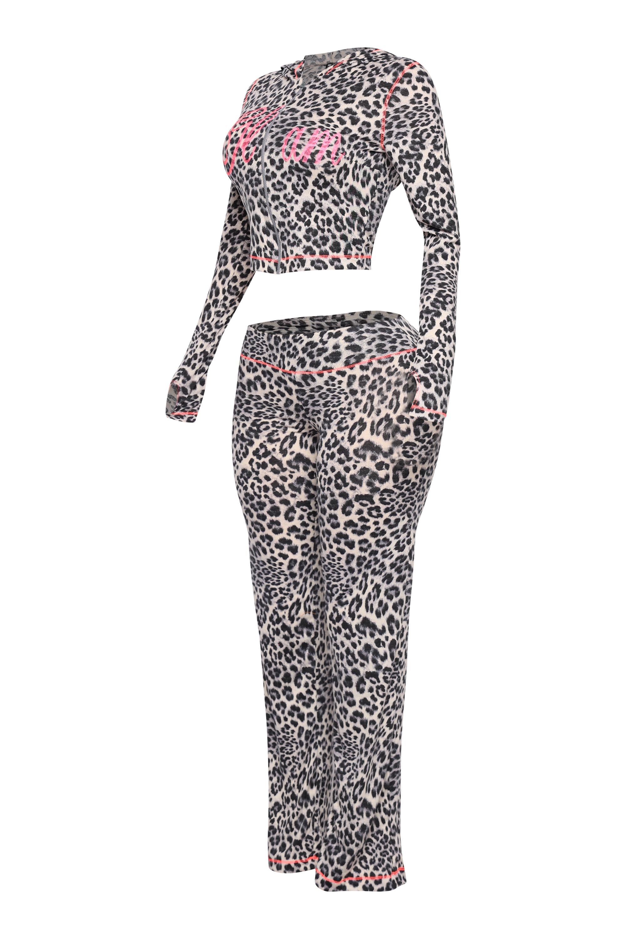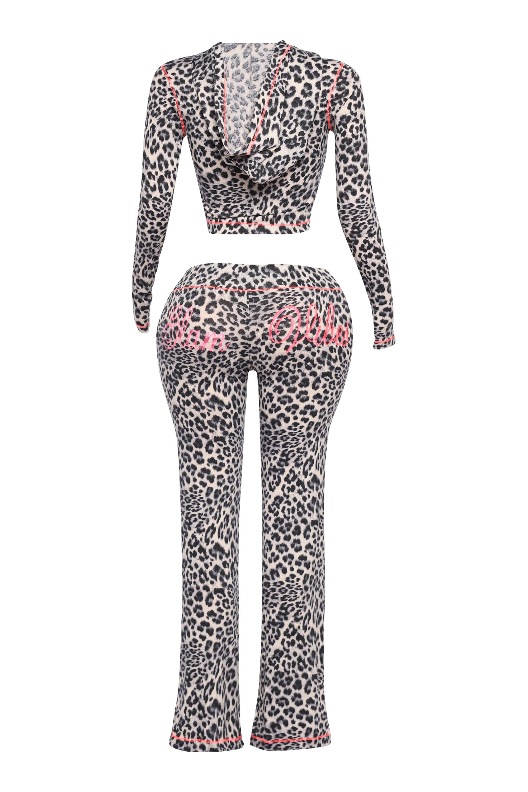 The vibes? Glamorous. This leopard print hoodie set is serving full Y2K fantasy with a modern twist. Featuring a cropped zip-up hoodie with thumbhole sleeves and a bold “Glam” graphic in hot pink, paired with matching slim-fit pants that scream main character energy thanks to the cheeky “Glam Vibes” back print. The stretchy fit keeps things ultra-comfy, while the contrast stitching adds that extra pop. Just throw on your hoops and you're ready to strut.