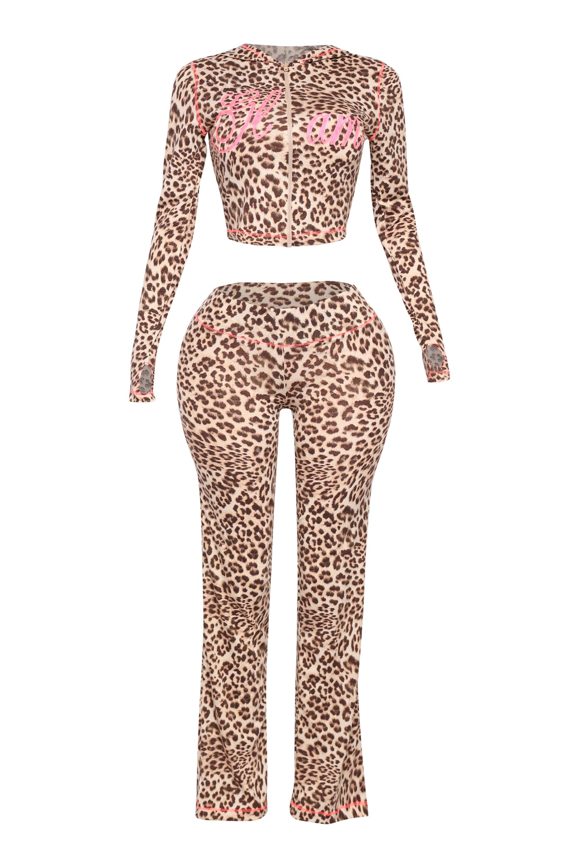 The vibes? Glamorous. This leopard print hoodie set is serving full Y2K fantasy with a modern twist. Featuring a cropped zip-up hoodie with thumbhole sleeves and a bold “Glam” graphic in hot pink, paired with matching slim-fit pants that scream main character energy thanks to the cheeky “Glam Vibes” back print. The stretchy fit keeps things ultra-comfy, while the contrast stitching adds that extra pop. Just throw on your hoops and you're ready to strut.