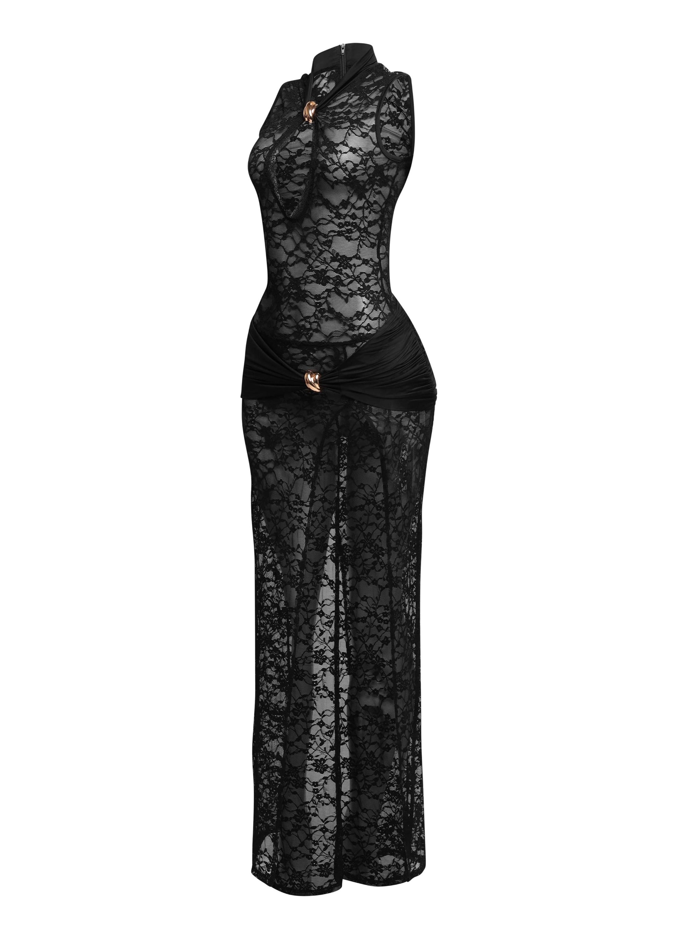 Draped in delicate floral lace and trimmed with gold-tone accents, the Golden Hour Lace Slit Maxi Dress turns up the heat while keeping it elegant. With a sleek keyhole neckline, curve-skimming fit, and dramatic thigh-high slit, this sheer maxi is all about bold femininity. The sculpted waistband and draped hip panel enhance the silhouette, while the luxe gold trim catches the light just right. Perfect over a bikini or daring lingerie for beach nights, birthday looks, or red carpet energy.