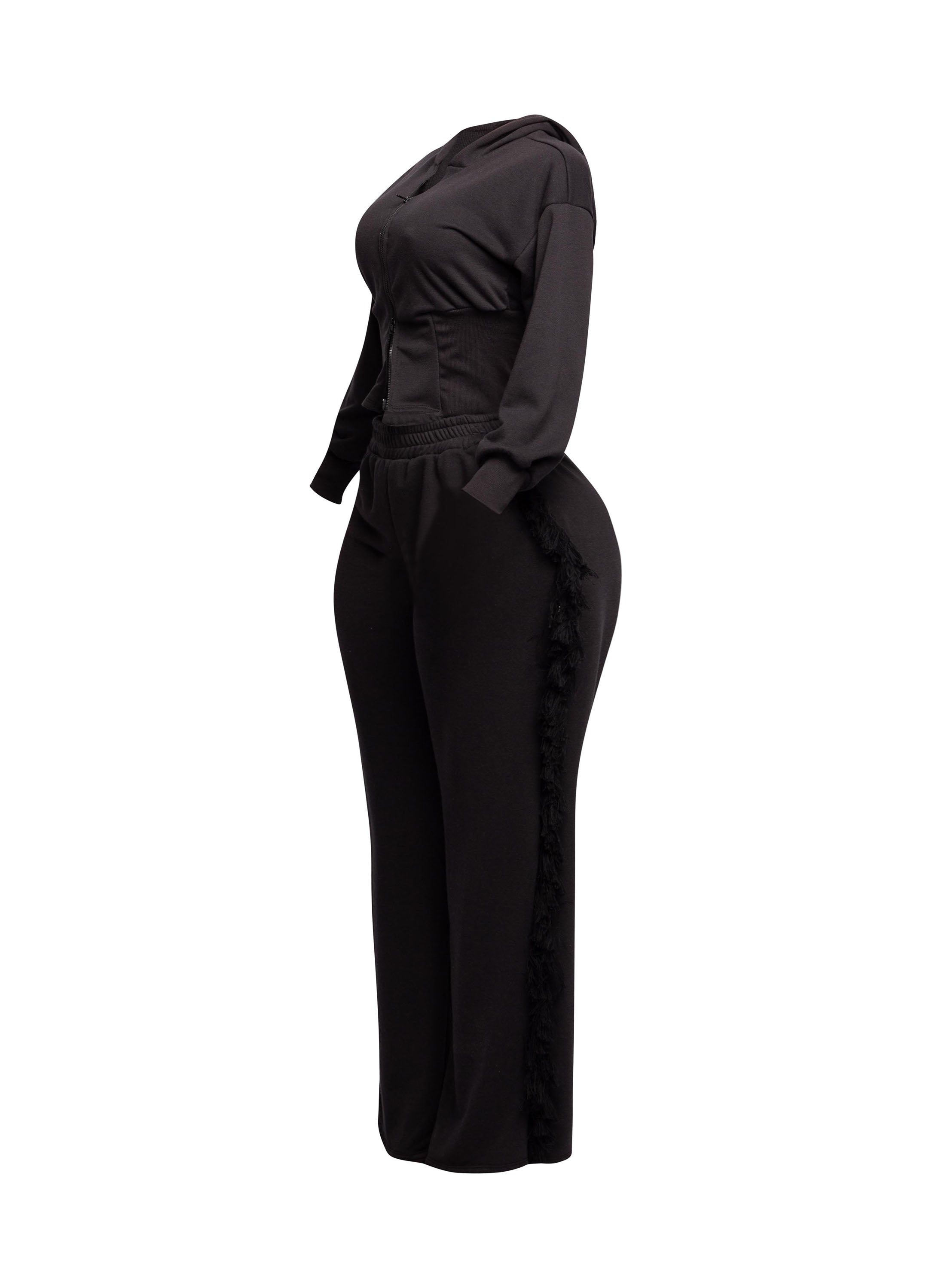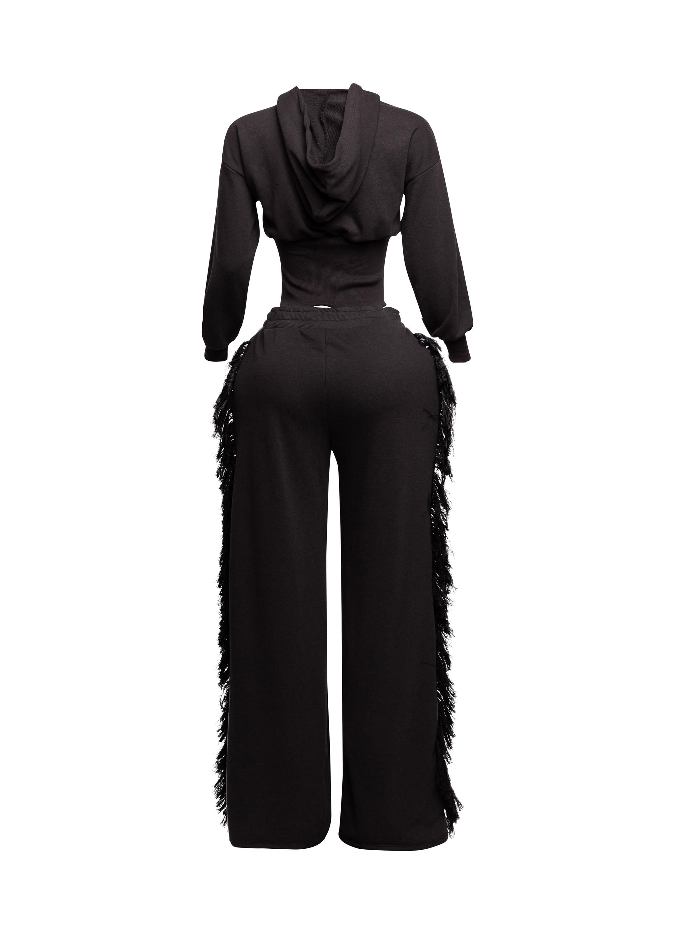 • Hoodie jacket• Terry body with rip contrast• Zipper closure• Wide leg pants• Side tassel detailed• Pull on style• Stretch •...