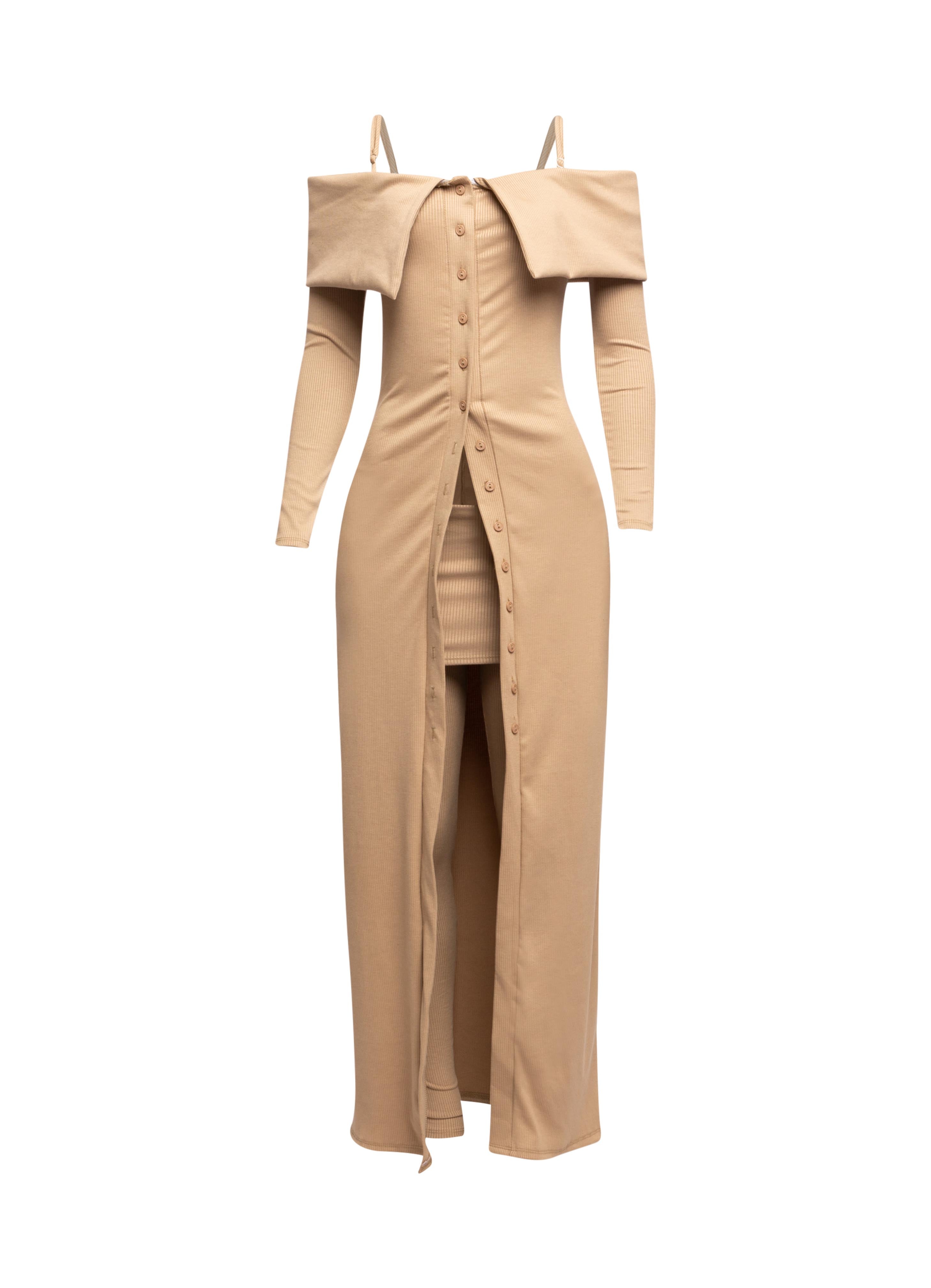 • Rib fabric• Off shoulder long sleeve with thumb hole• Spaghetti strap• Maxi length top• Button closure• Skirt leggings• Pull...