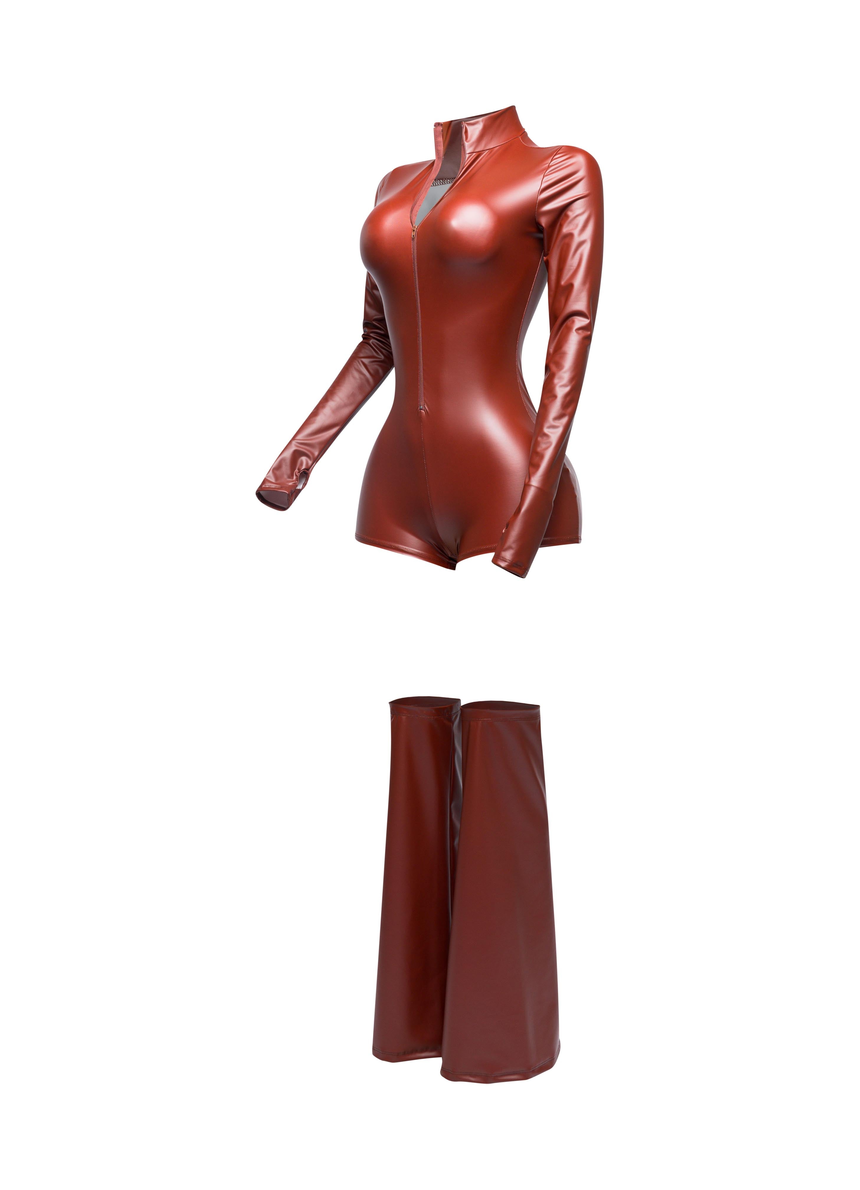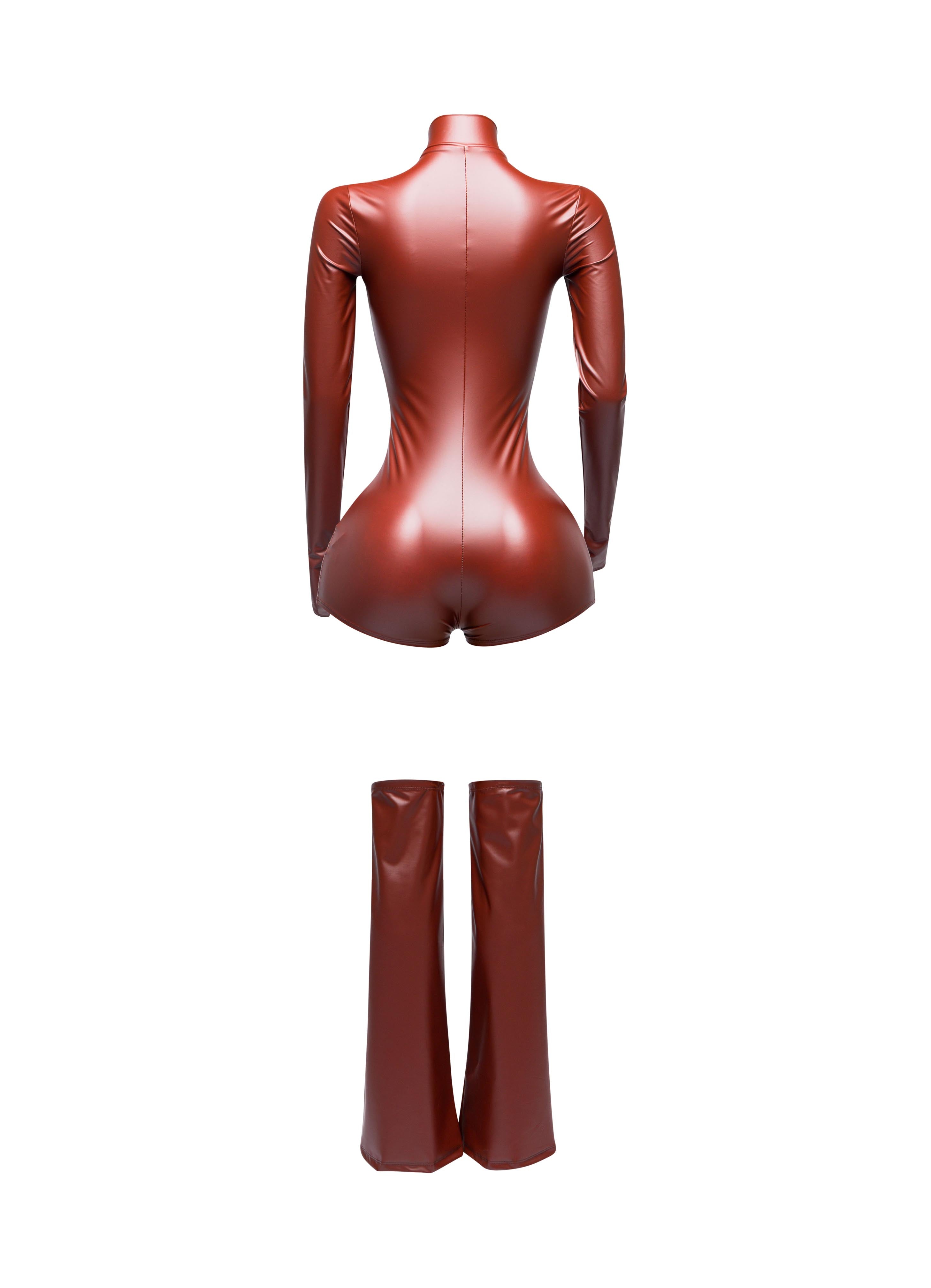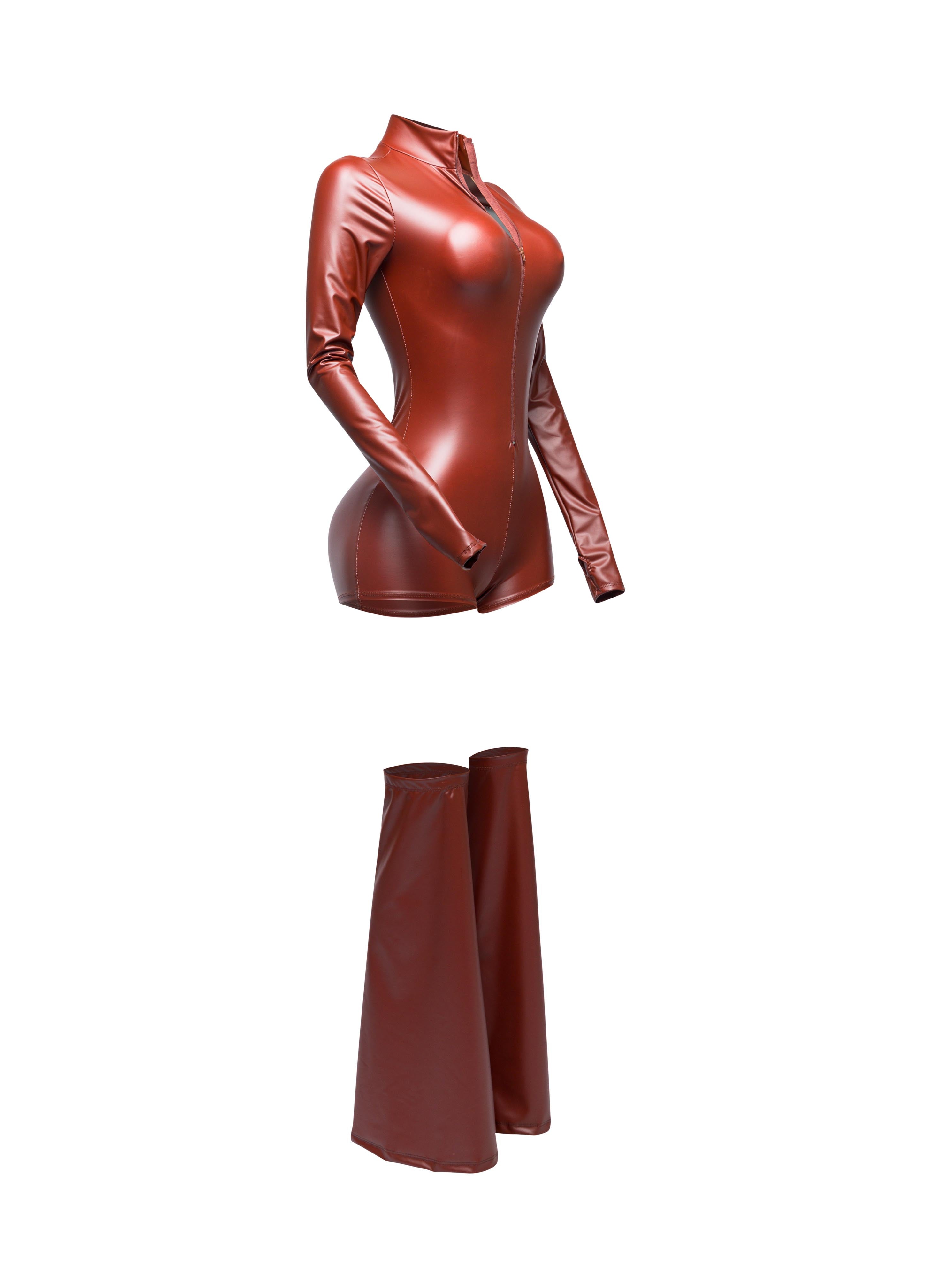 Step into sleek style with our Long Sleeve PU Romper with Leg Warmers. Featuring a zippered closure, medium stretch, and...