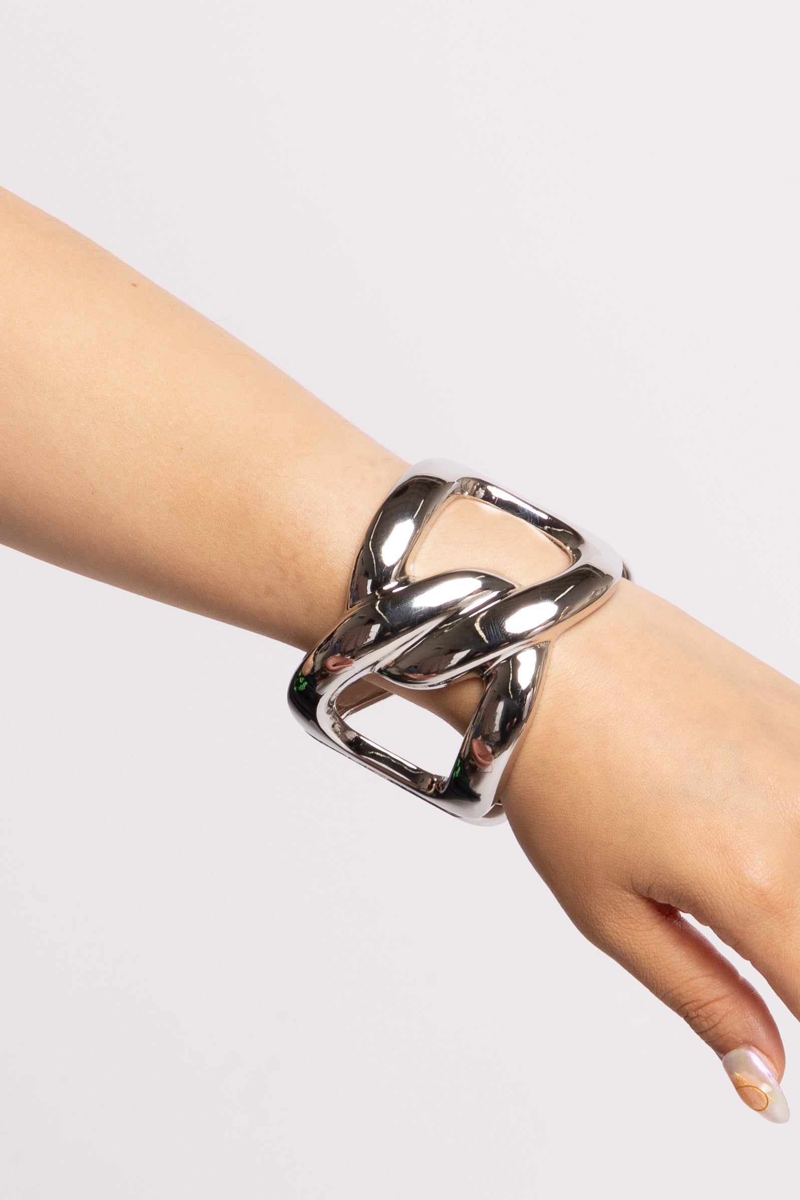 Elegant open geometric design Available in gold and silver finishes Polished high-quality metal Secure spring hinge closure Versatile statement accessory...