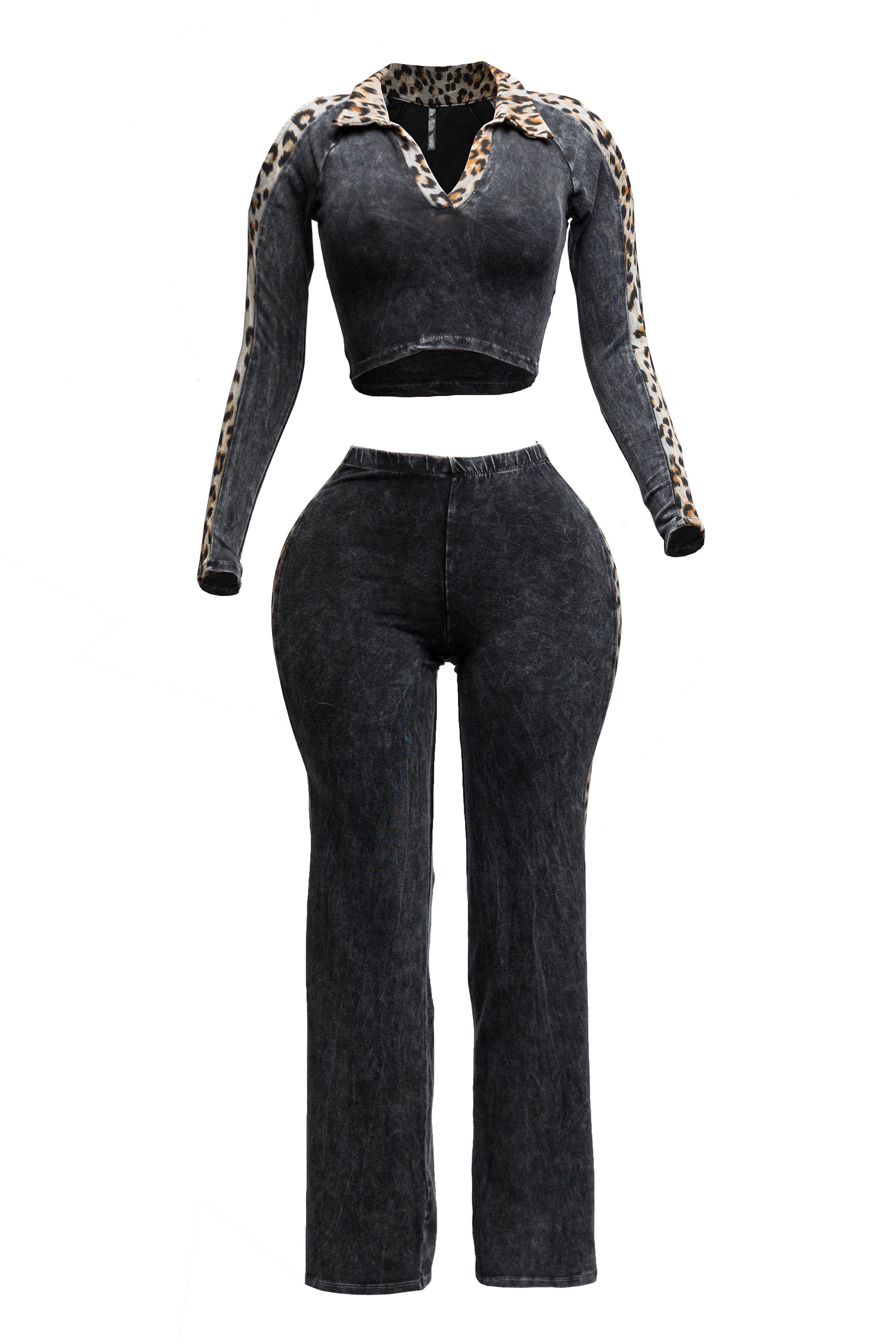 • Mineral washed • Long sleeve crop top • Leopard contrast • Pull on pants • Stretch • SELF:95%Cotton 5%Spandex...