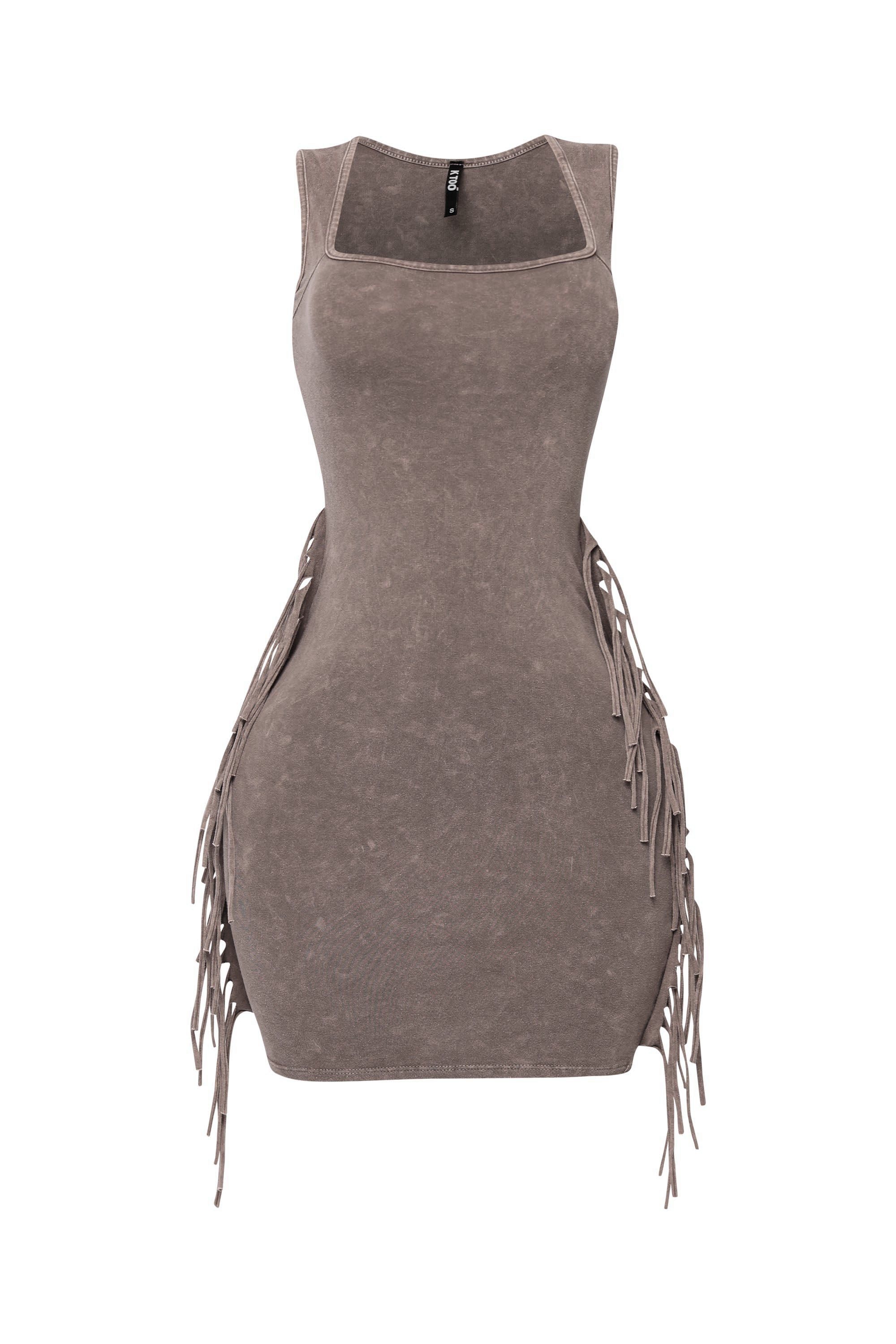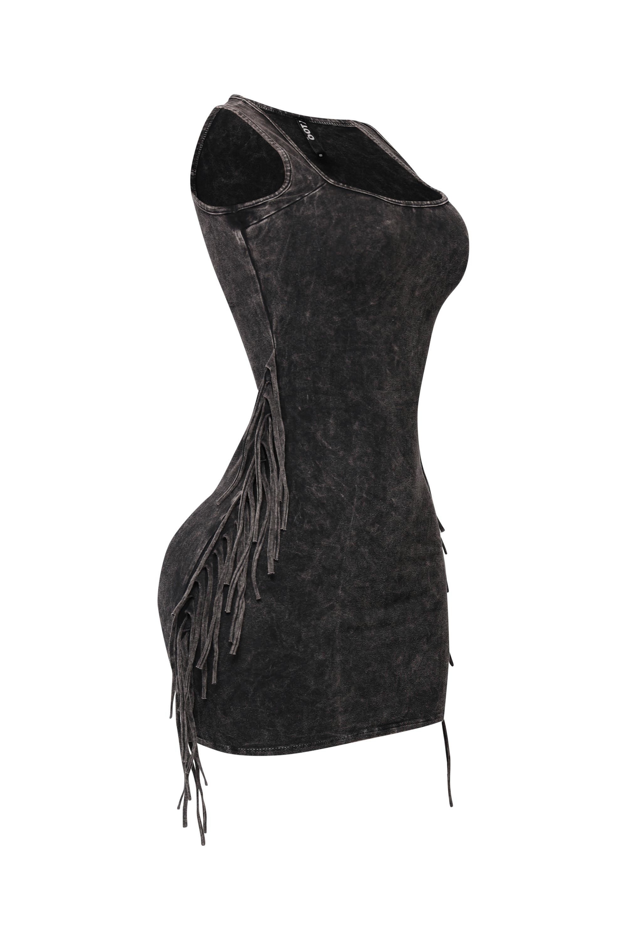 The Fringe Check Acid Wash Mini Dress is made to turn heads—period. With its square neckline, curve-hugging stretch, and flirty...