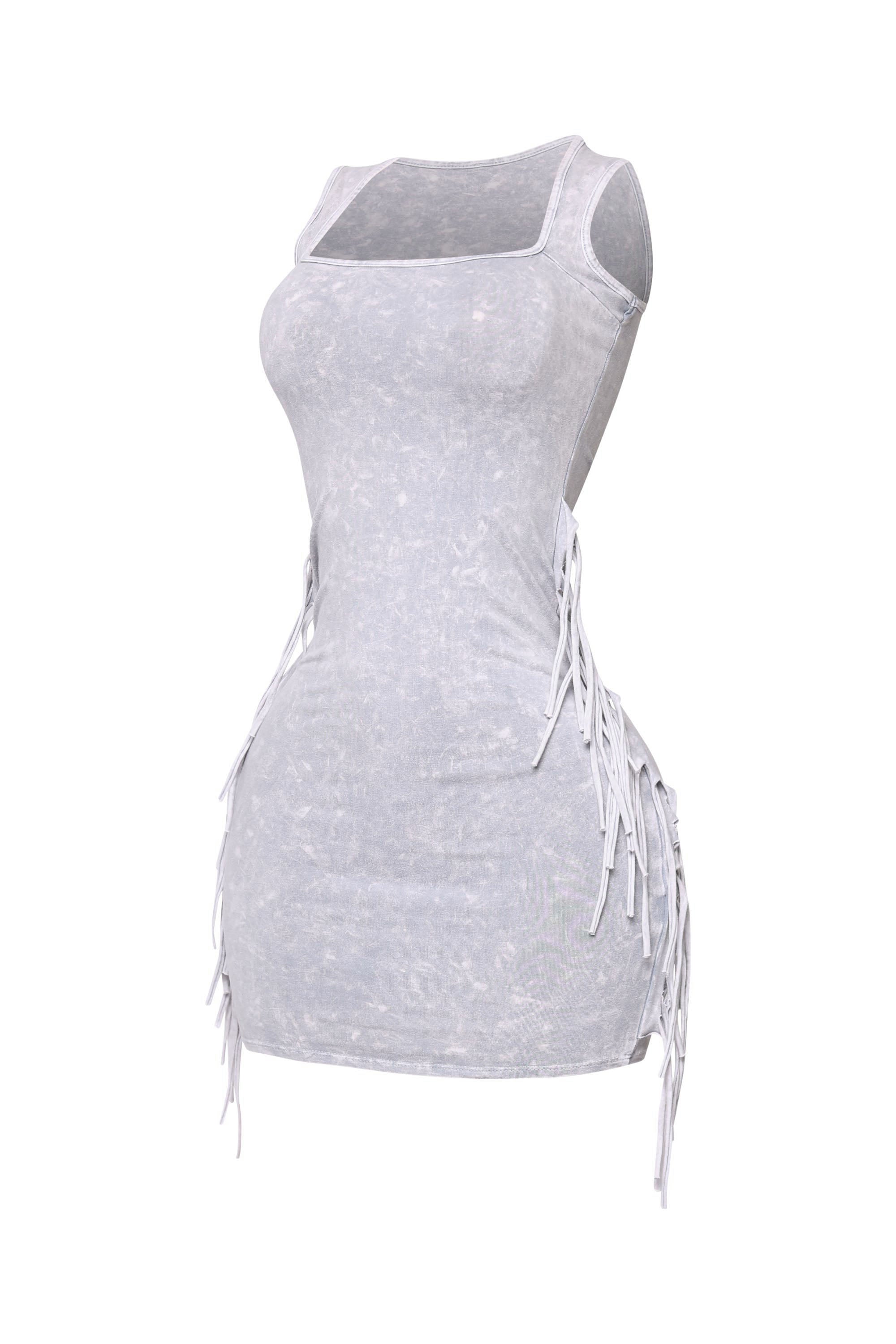 The Fringe Check Acid Wash Mini Dress is made to turn heads—period. With its square neckline, curve-hugging stretch, and flirty...