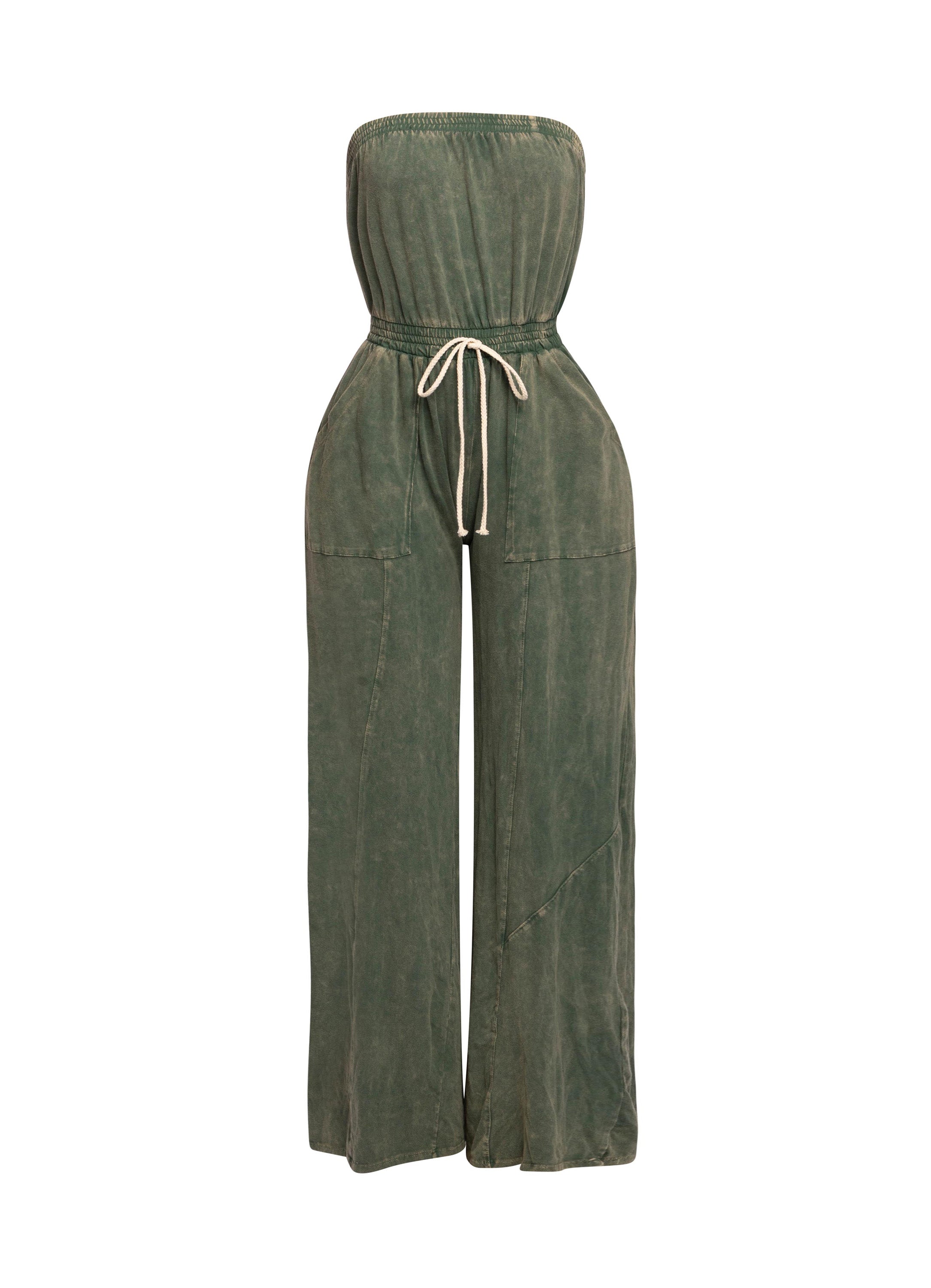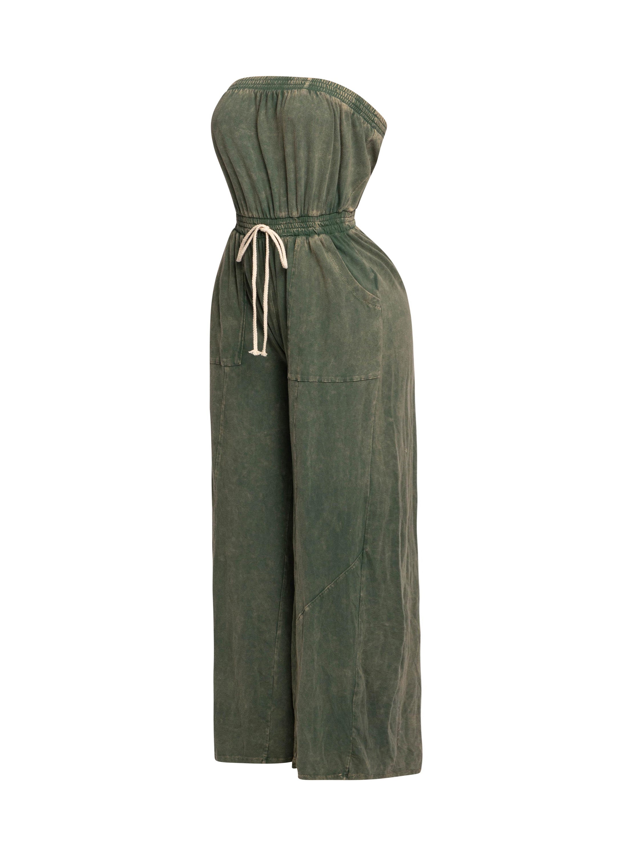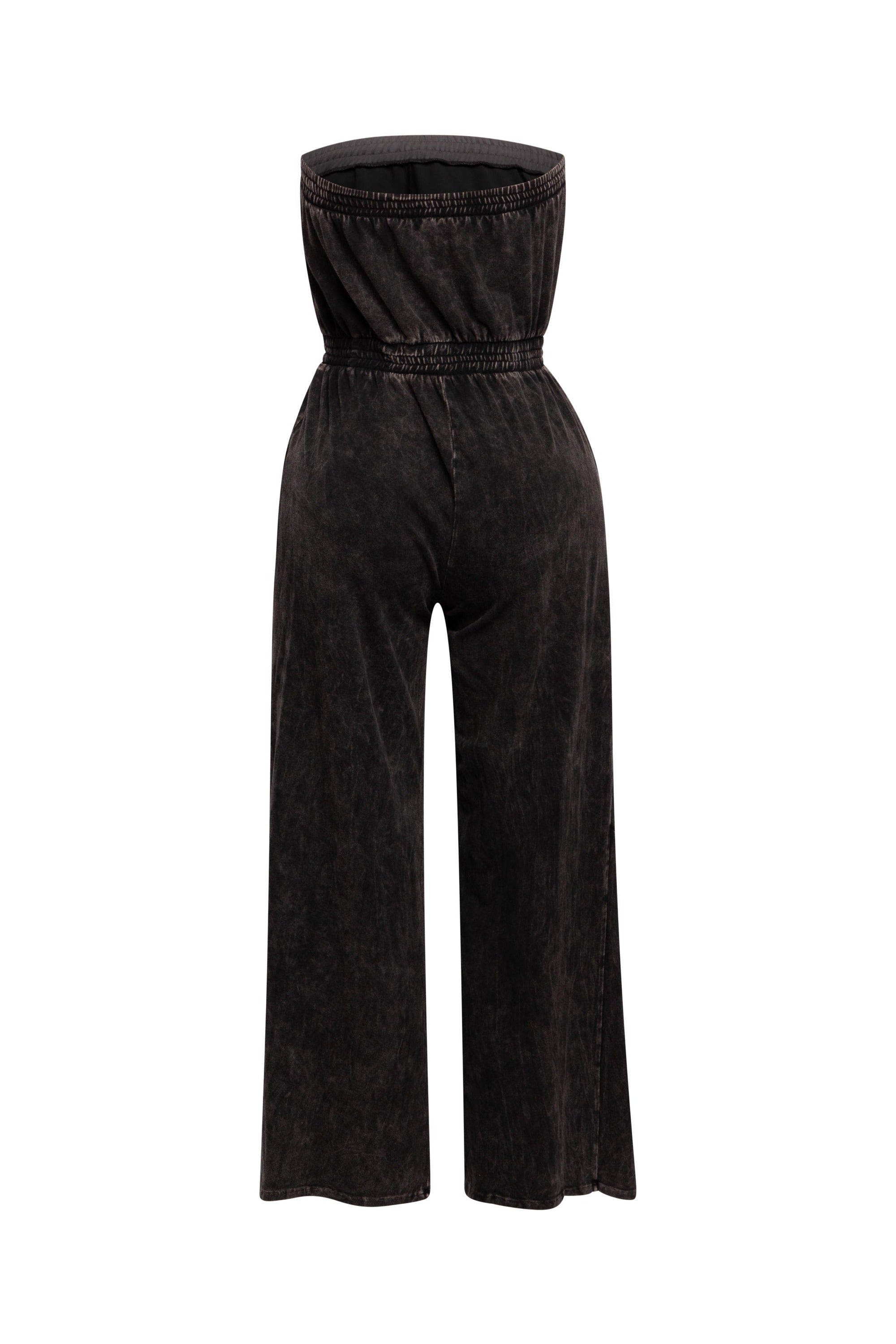 Mineral washed strapless wide leg jumpsuit