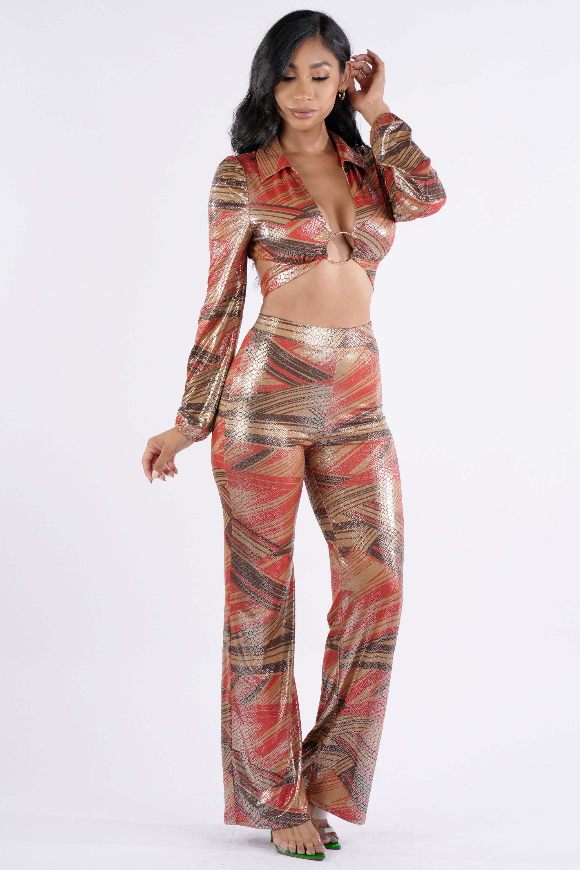 Elevate your style with our O-Ring Trim Tie Back Top and Pants set. The chic O-ring detail and playful tie-back...