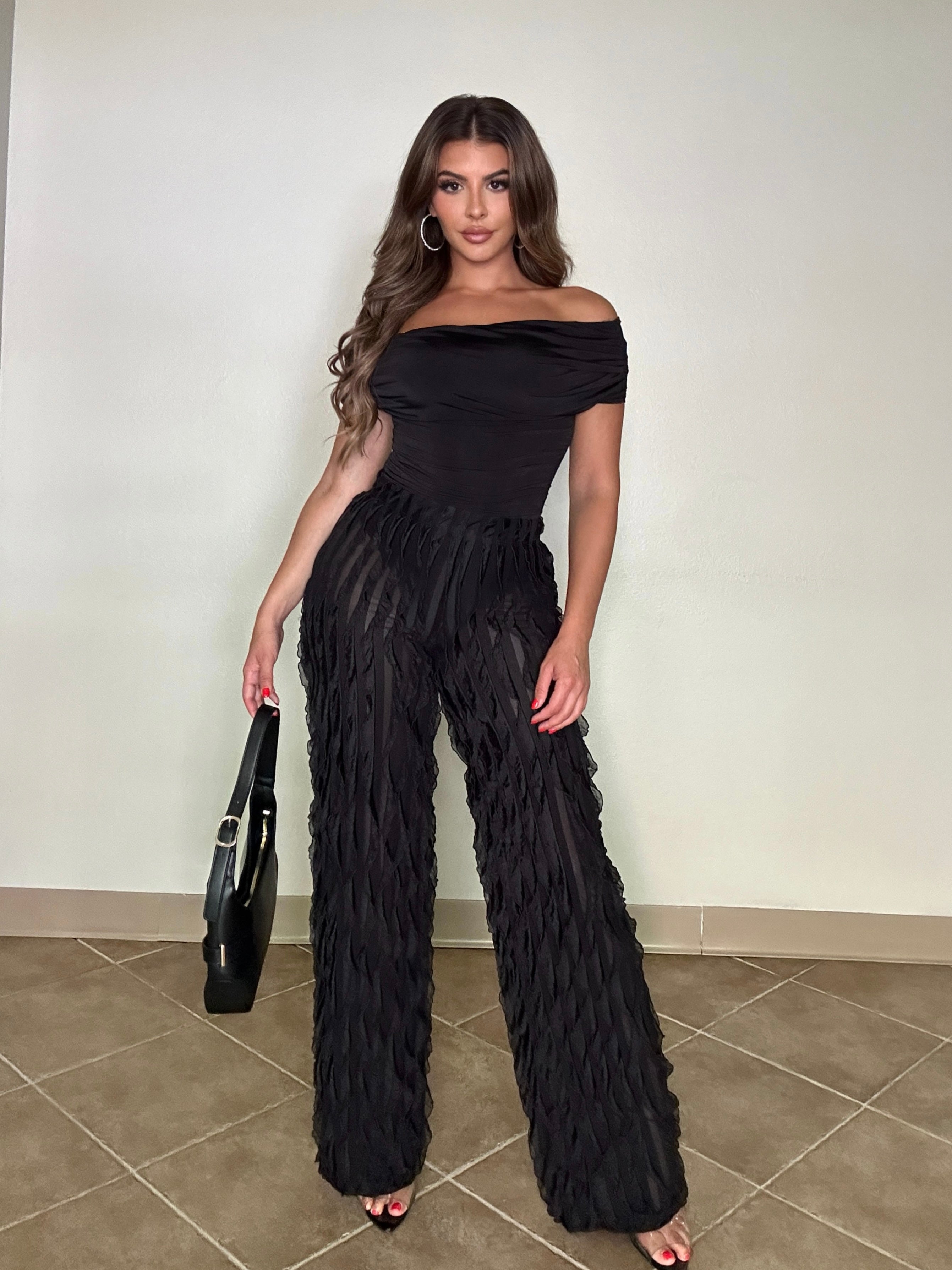 Exude elegance with our Off-Shoulder Bodysuit Set with Wide Leg Ruffle Pants. This sophisticated set features a chic off-shoulder bodysuit...