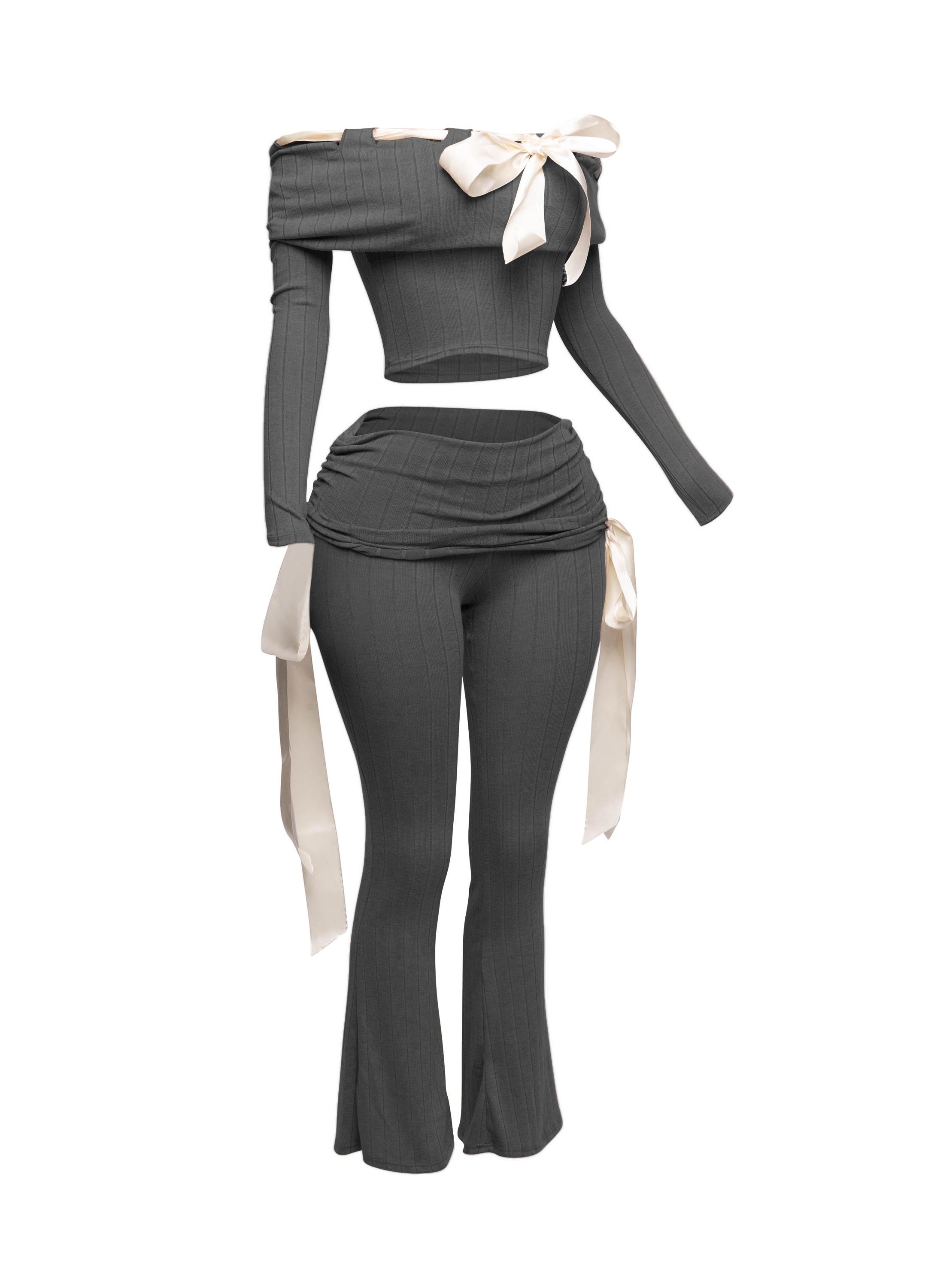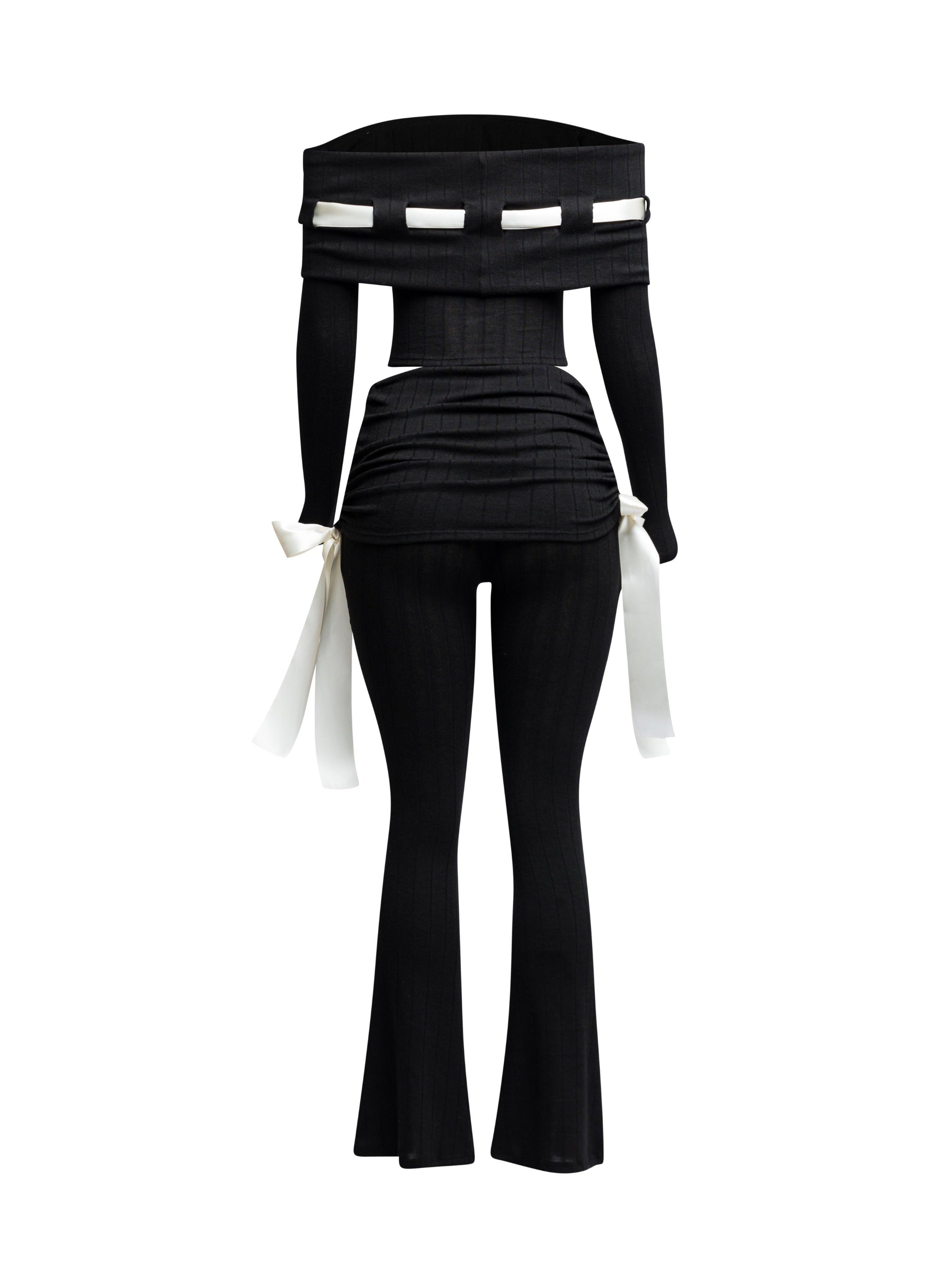 Off shoulder long sleeve top Ribbon trim detailed Skirt on top wide leg pants Pull on style Stretch 78%Polyester 18%Rayon...