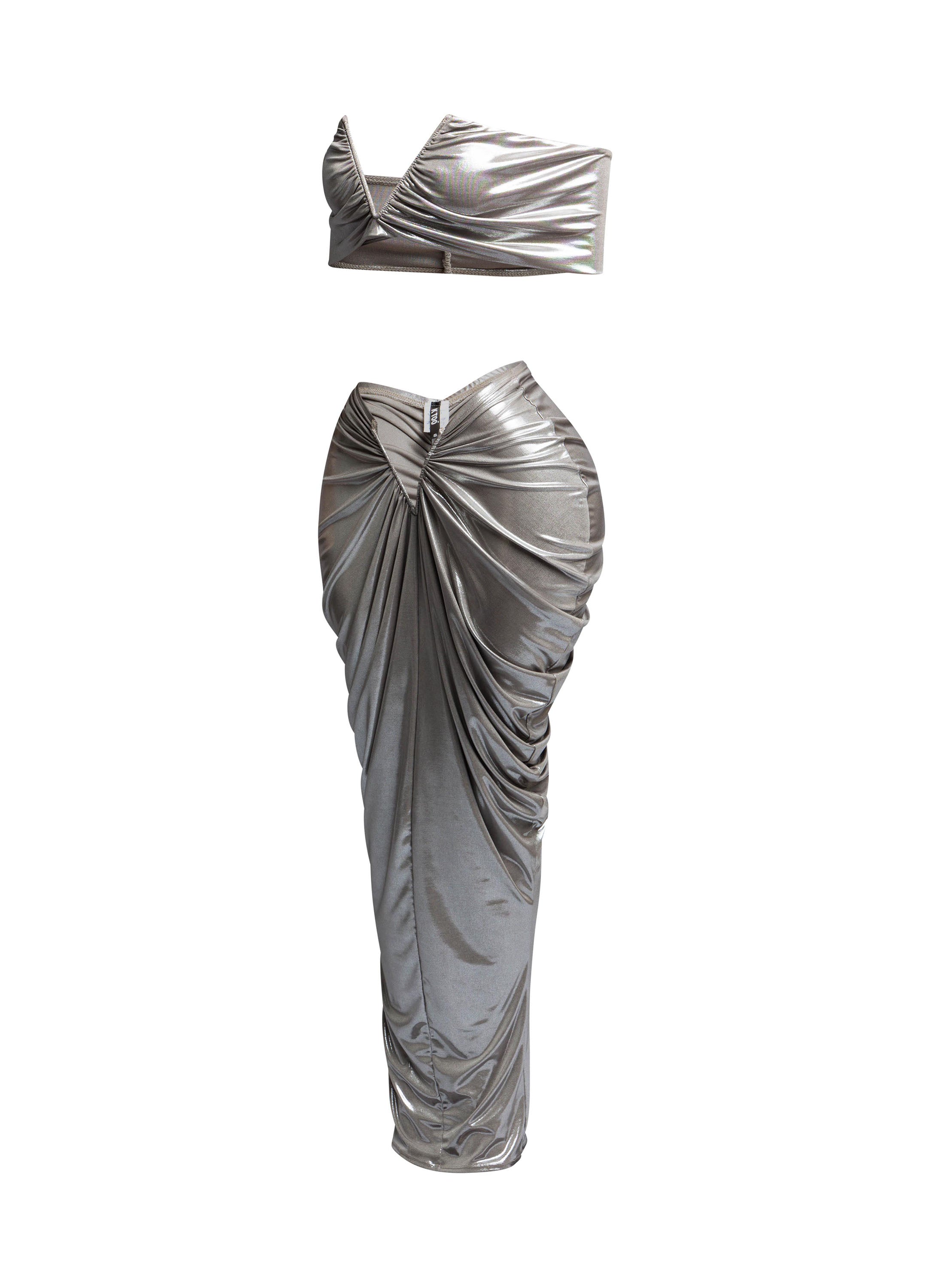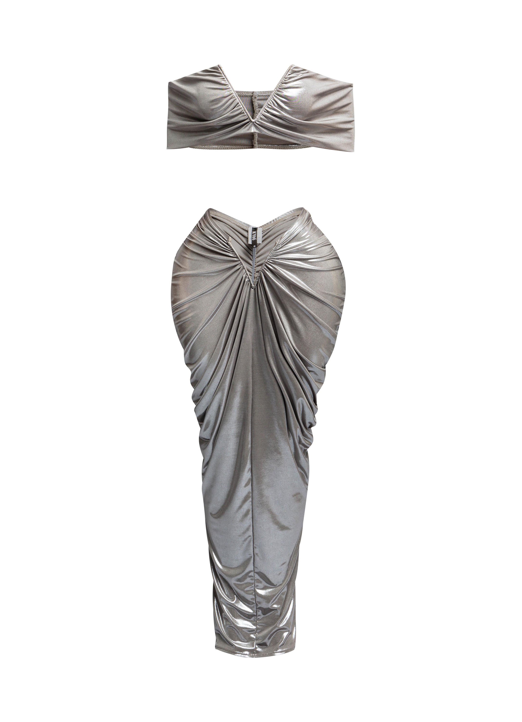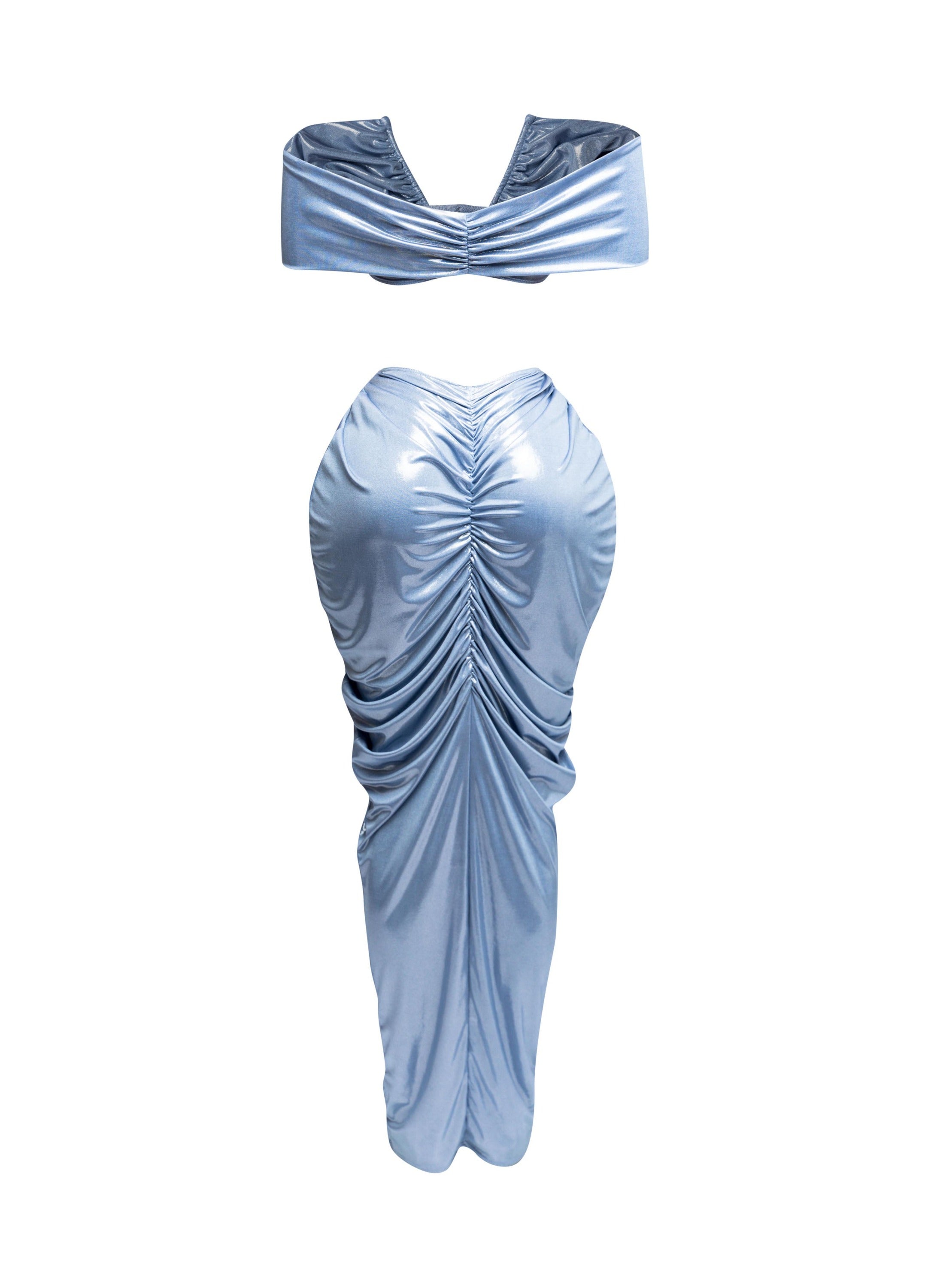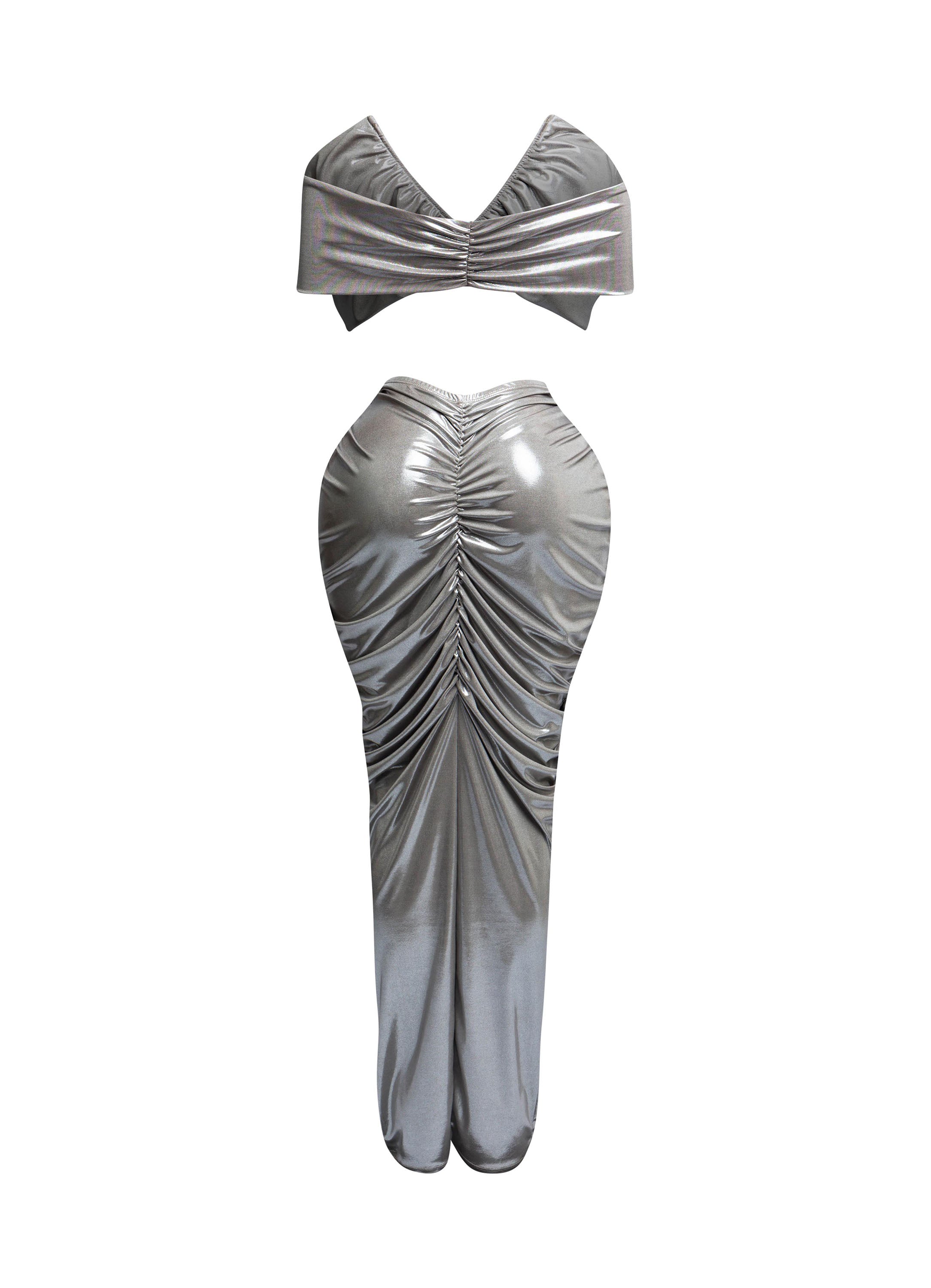 Get ready to turn heads with these gorgeous two-piece skirt sets, designed to accentuate your curves in all the right ways. The set includes a cropped top with a flattering V-neckline and a high-waisted, ruched skirt that hugs the body for a perfect fit. Available in striking metallic colors like bronze, silver, and ice blue, this outfit exudes confidence and glamour.