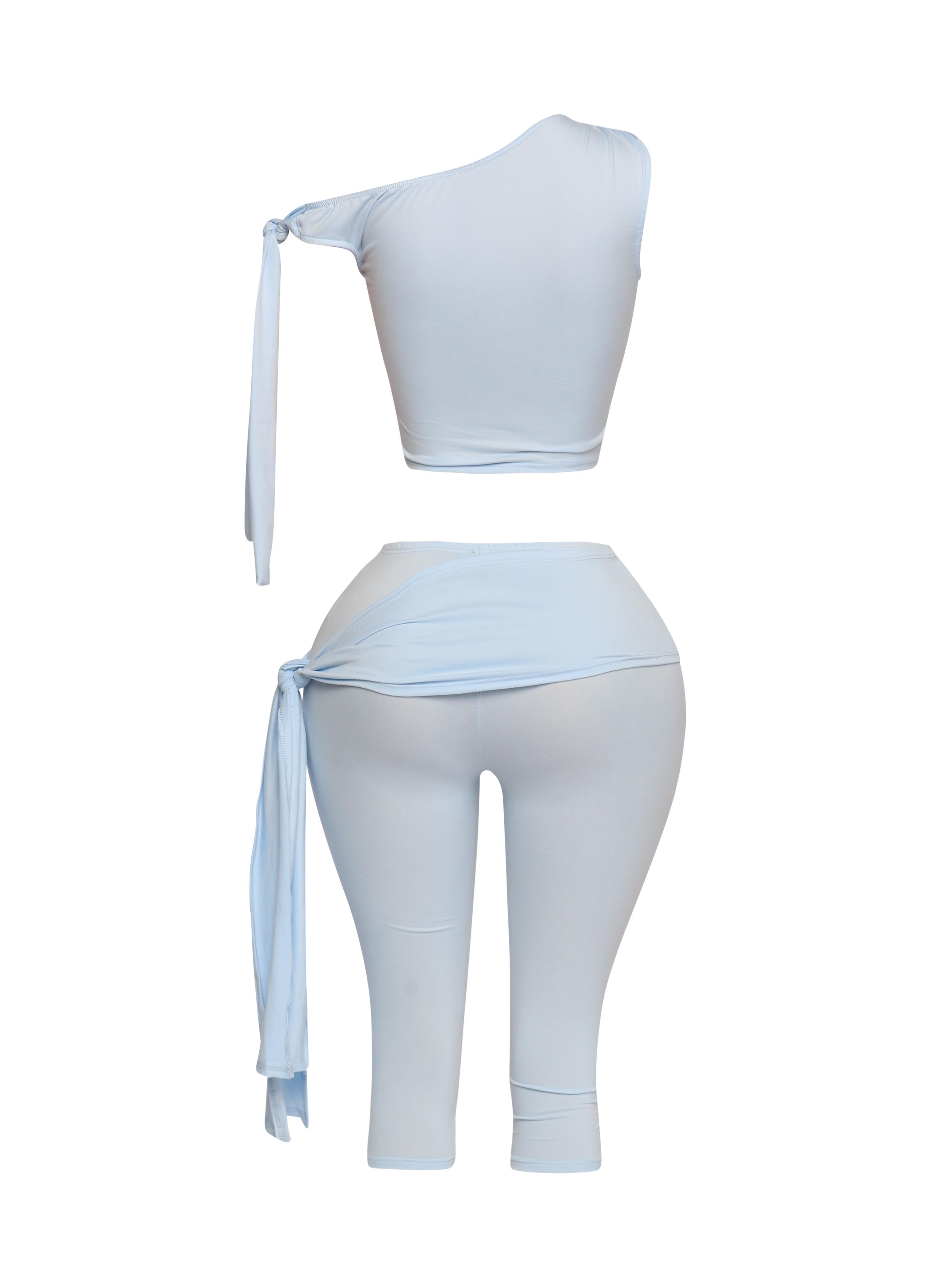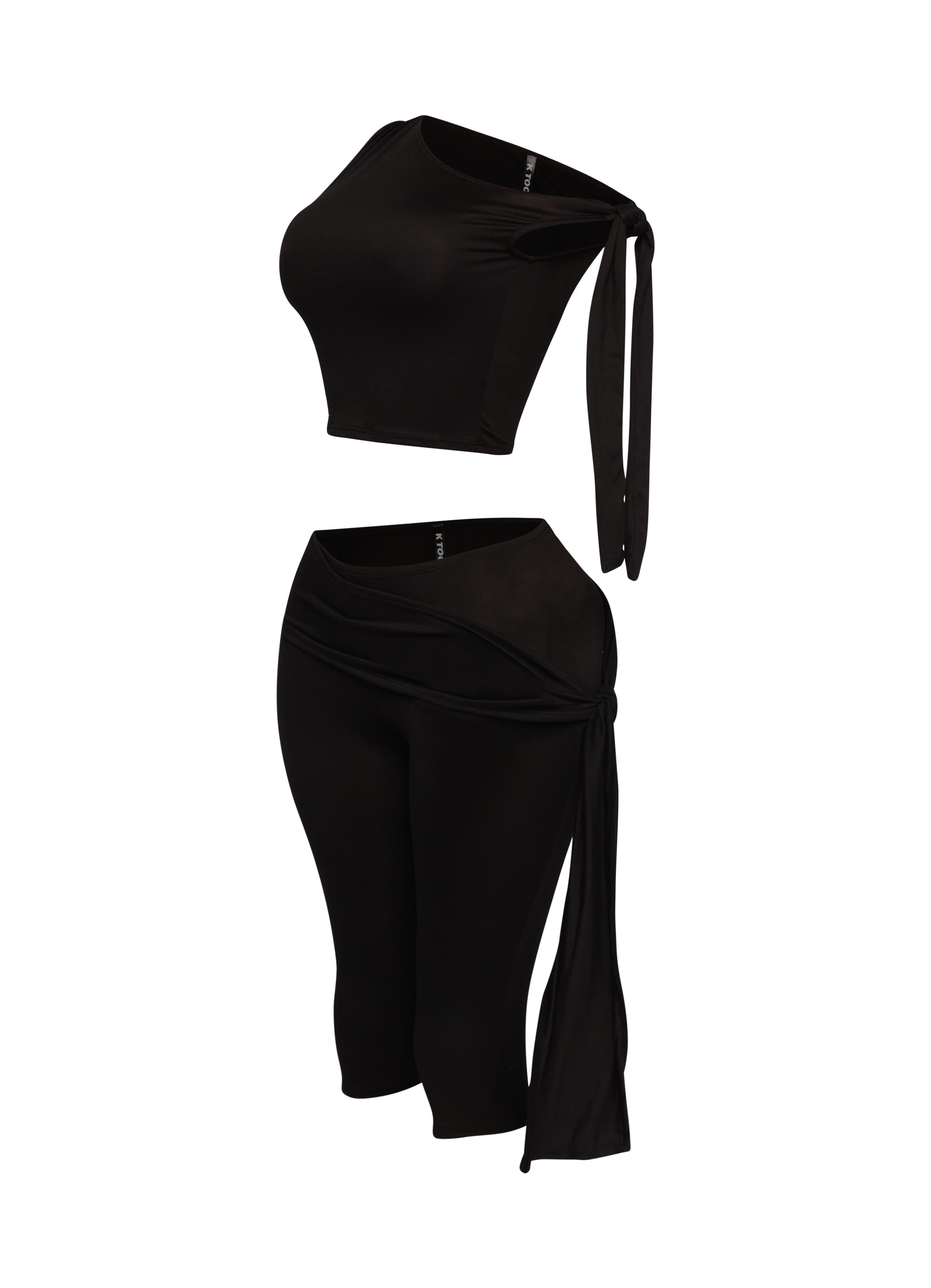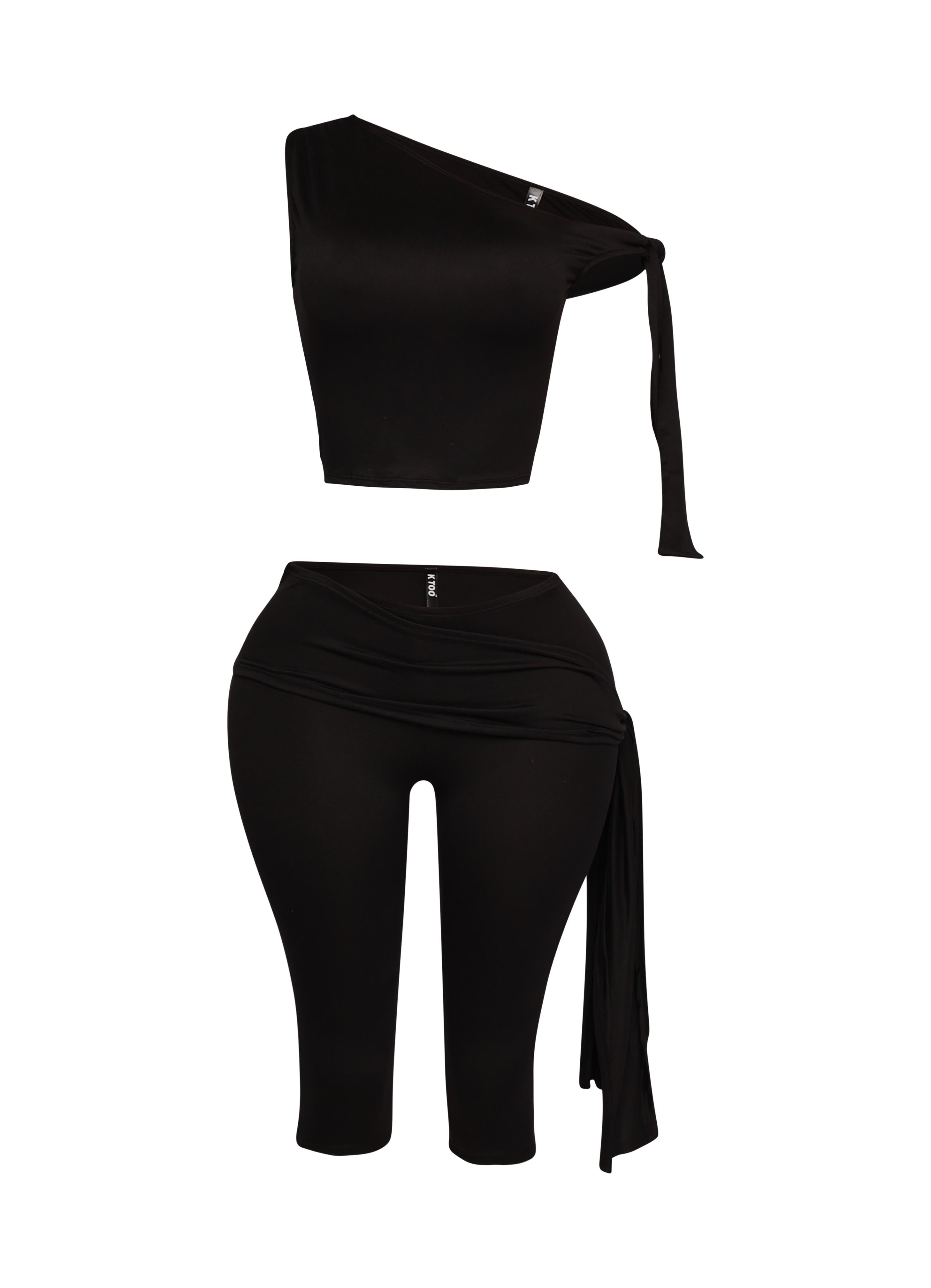 •One shoulder•Tied arm sleeve•Capri leggings set•Pull up pants•Stretch•95%Polyester 5%Spandex•Top Length : 17" (From HPS)•Inseam : 19"•Imported