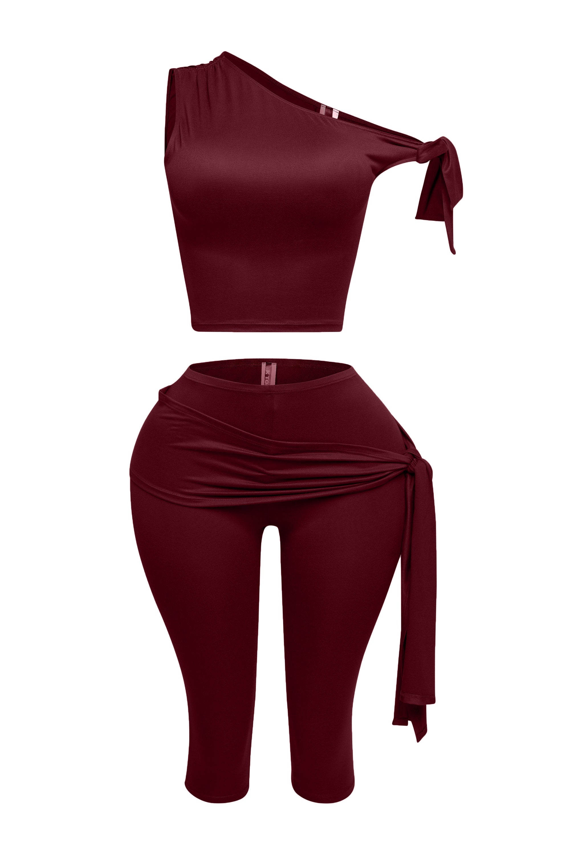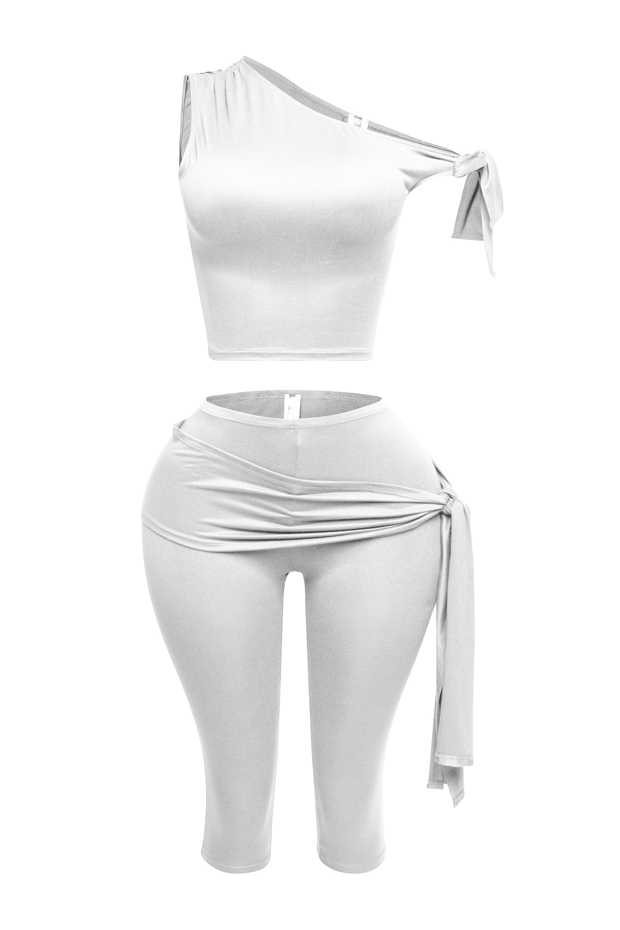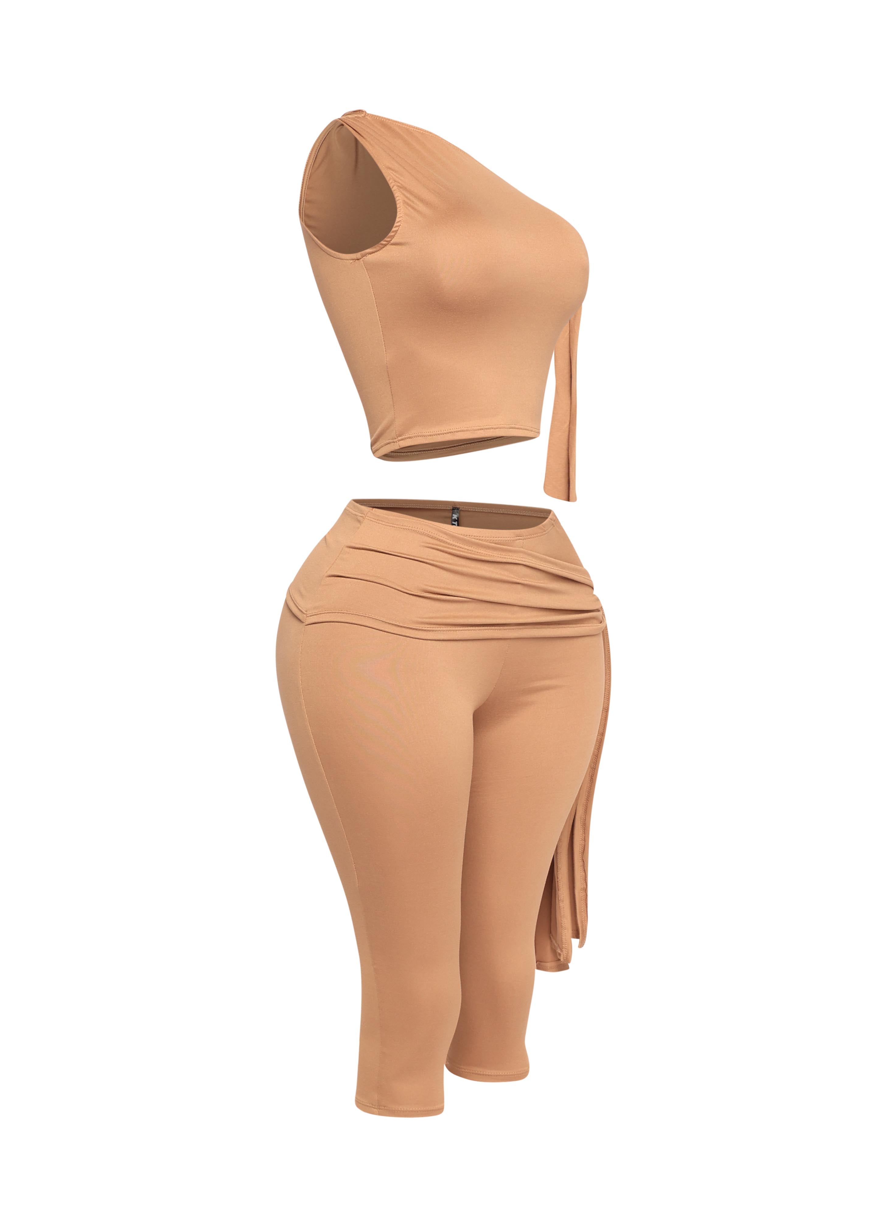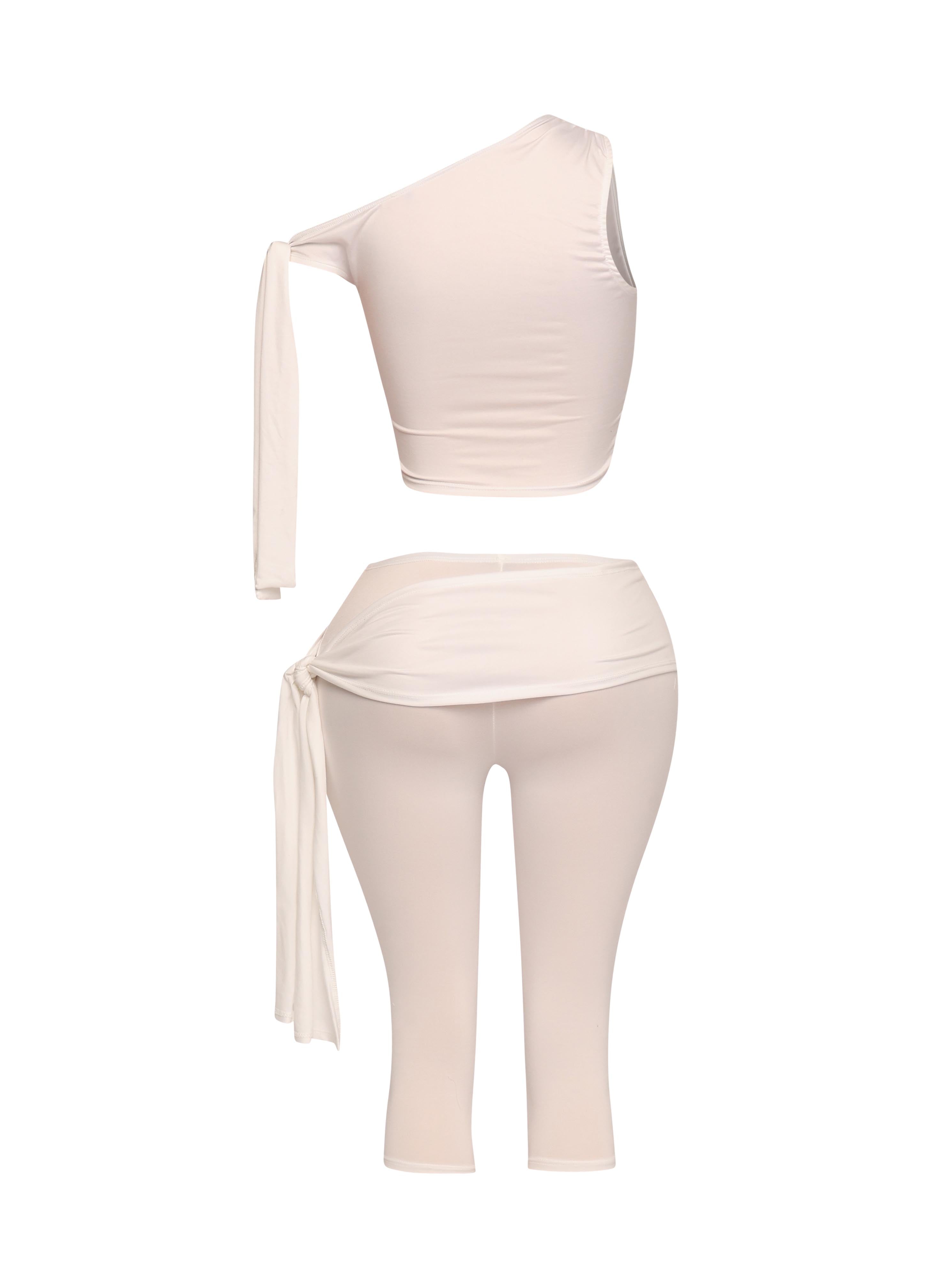 •One shoulder•Tied arm sleeve•Capri leggings set•Pull up pants•Stretch•95%Polyester 5%Spandex•Top Length : 17" (From HPS)•Inseam : 19"•Imported