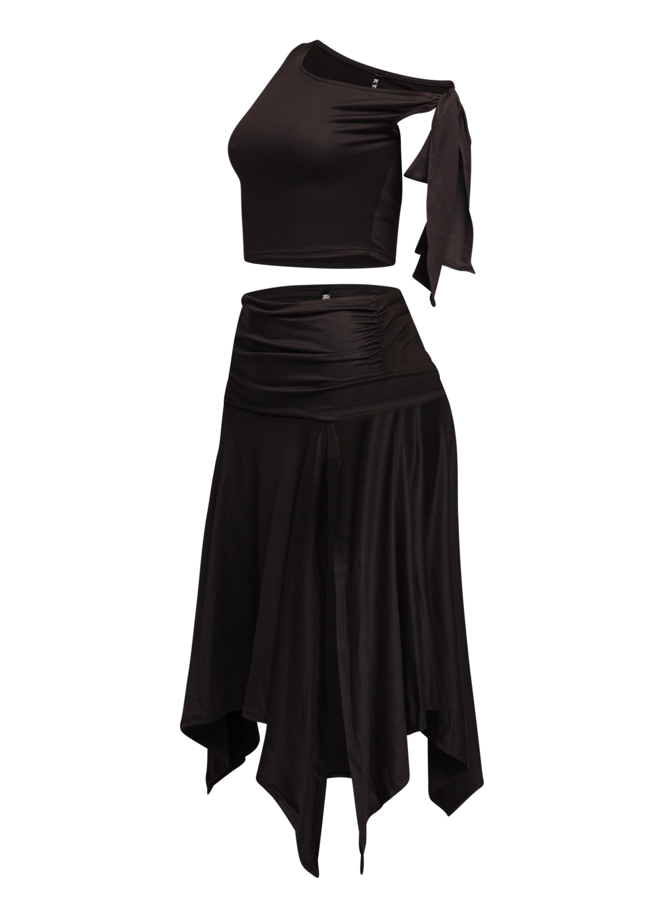 One shoulder Tied arm sleeve Shark bite hem skirt Elastic shirring waistband Slit on the skirt Stretch 95%Polyester 5%Spandex Top...