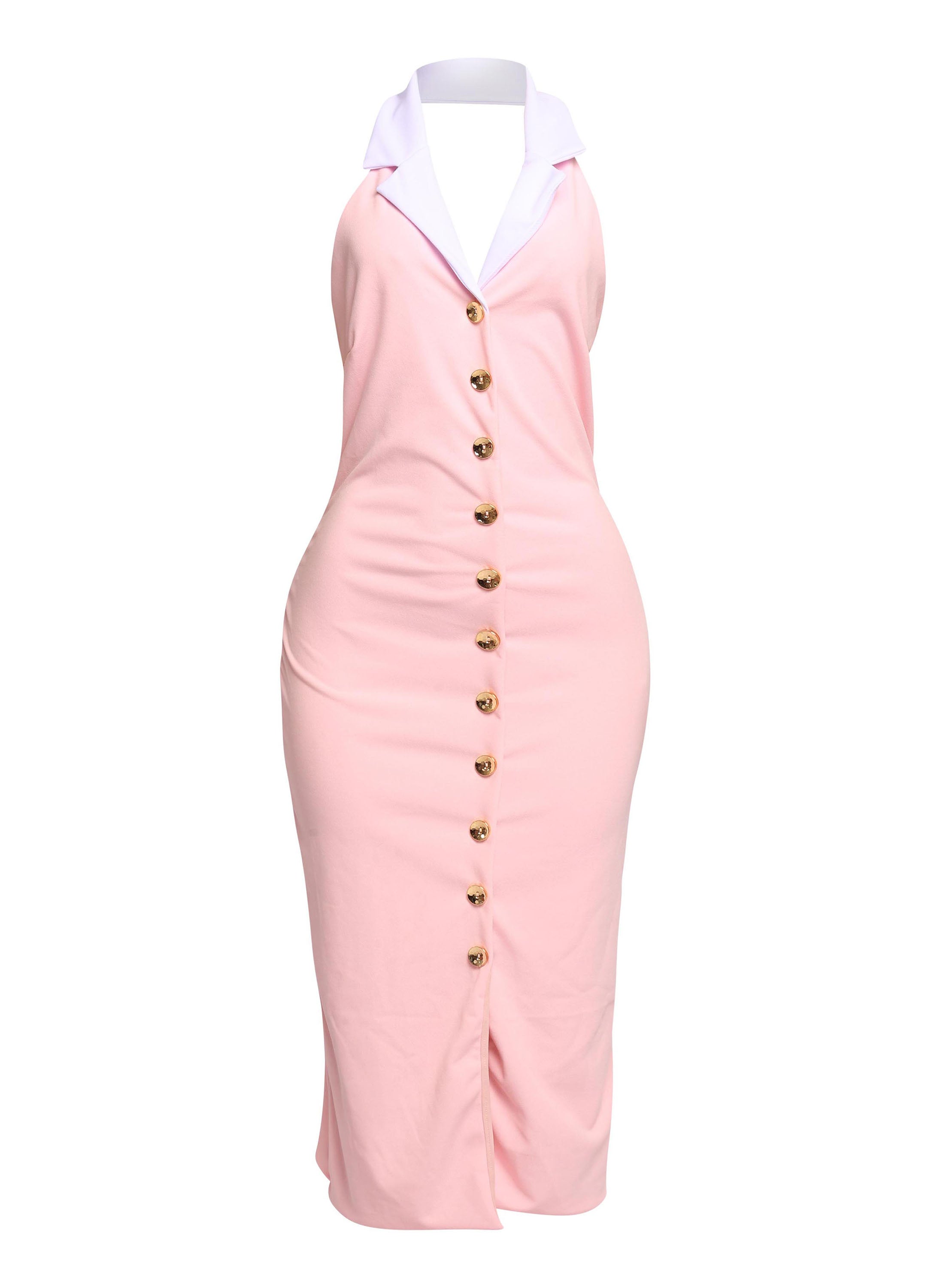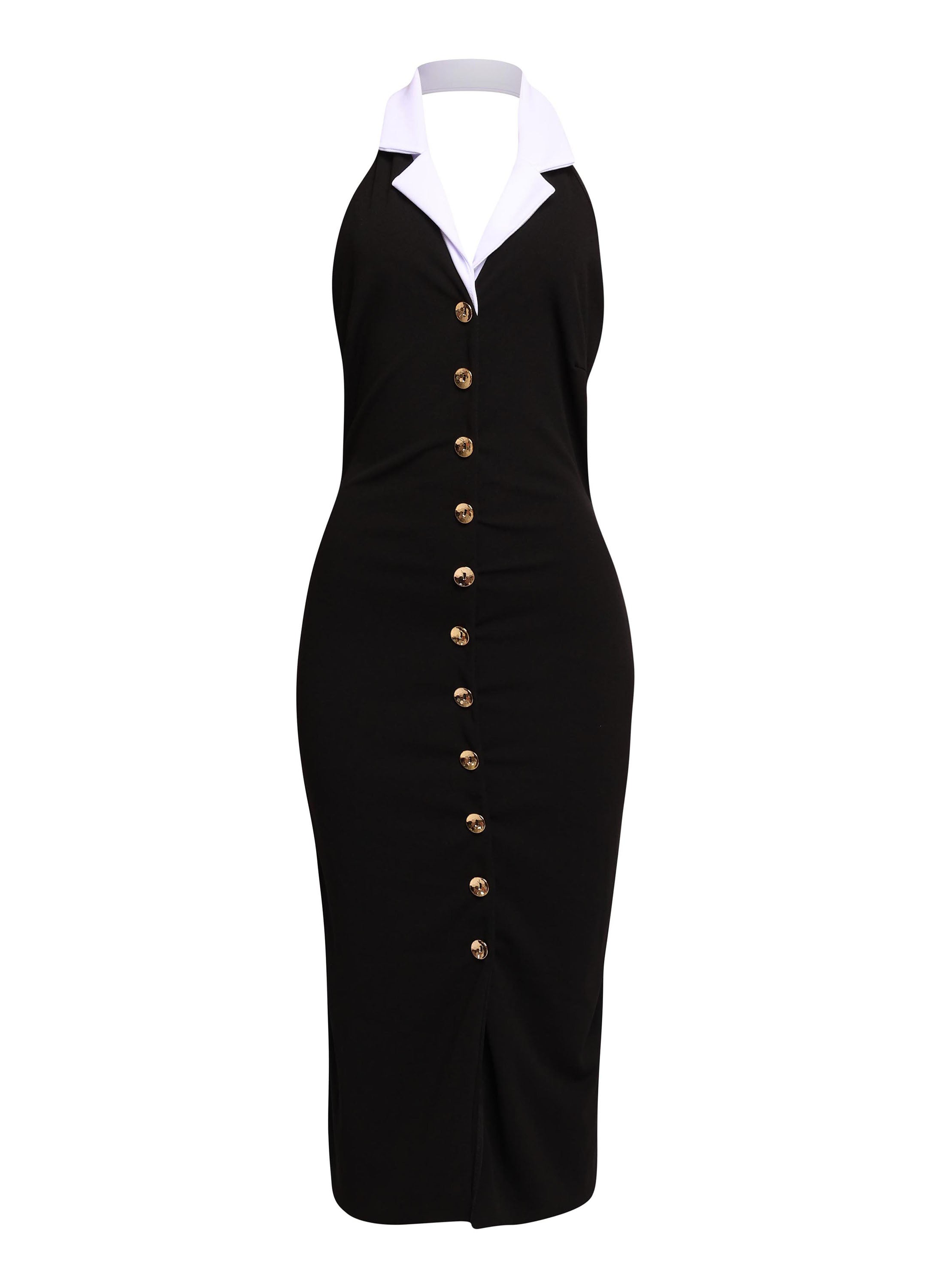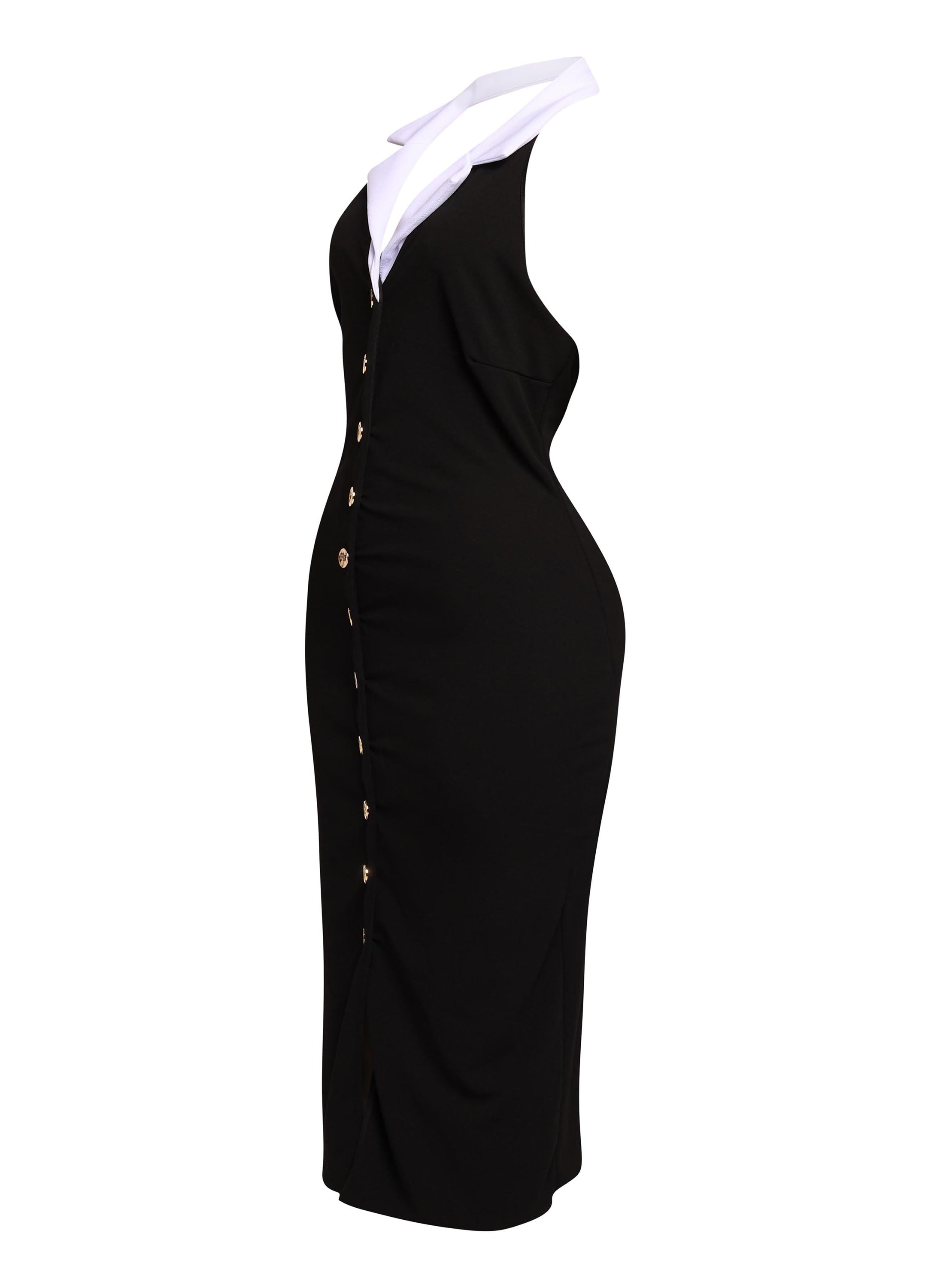 Step into main character energy with the Power Move Contrast Collar Midi Dress. Featuring a sharp white collar, luxe gold...