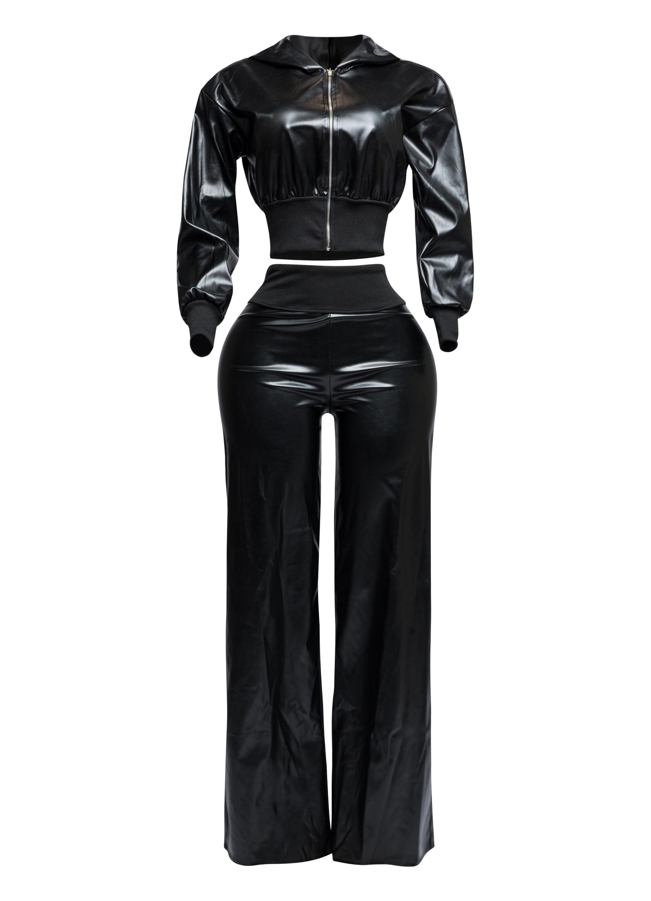 PU hoodie jacket & wide leg pants set
