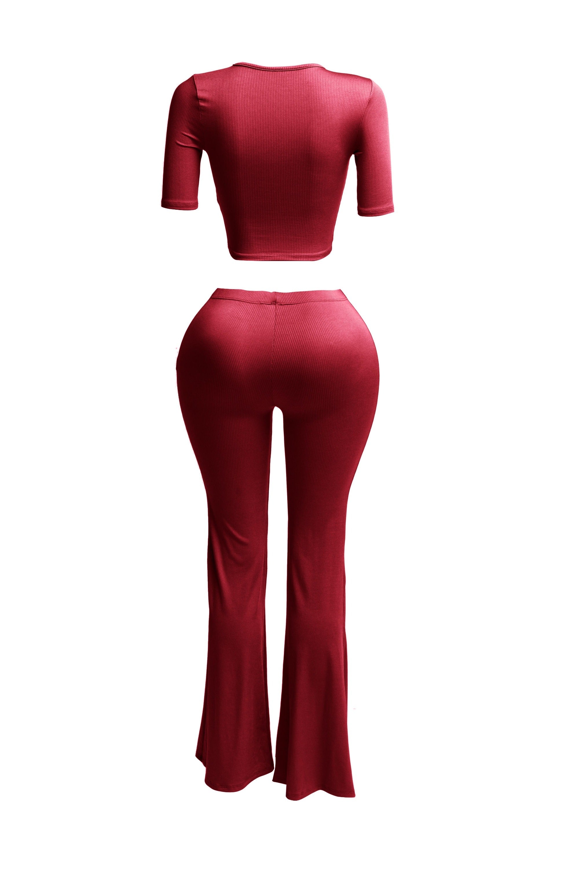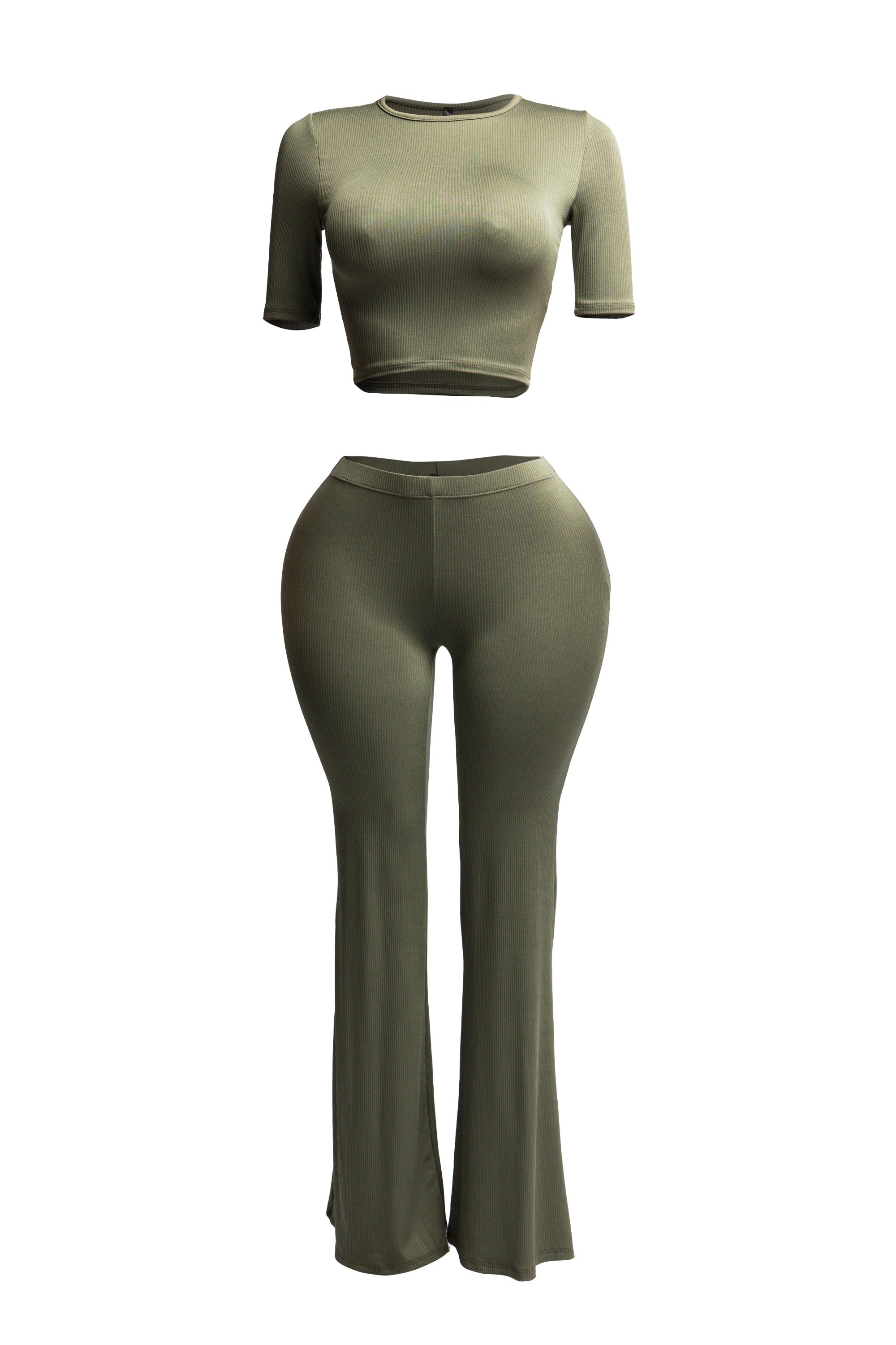 • Rib fabric• Short sleeve crop top• Flare bottom pants• Pull on style• Stretch • 92%Nylon 8%Spandex• Top : 16"• Inseam...