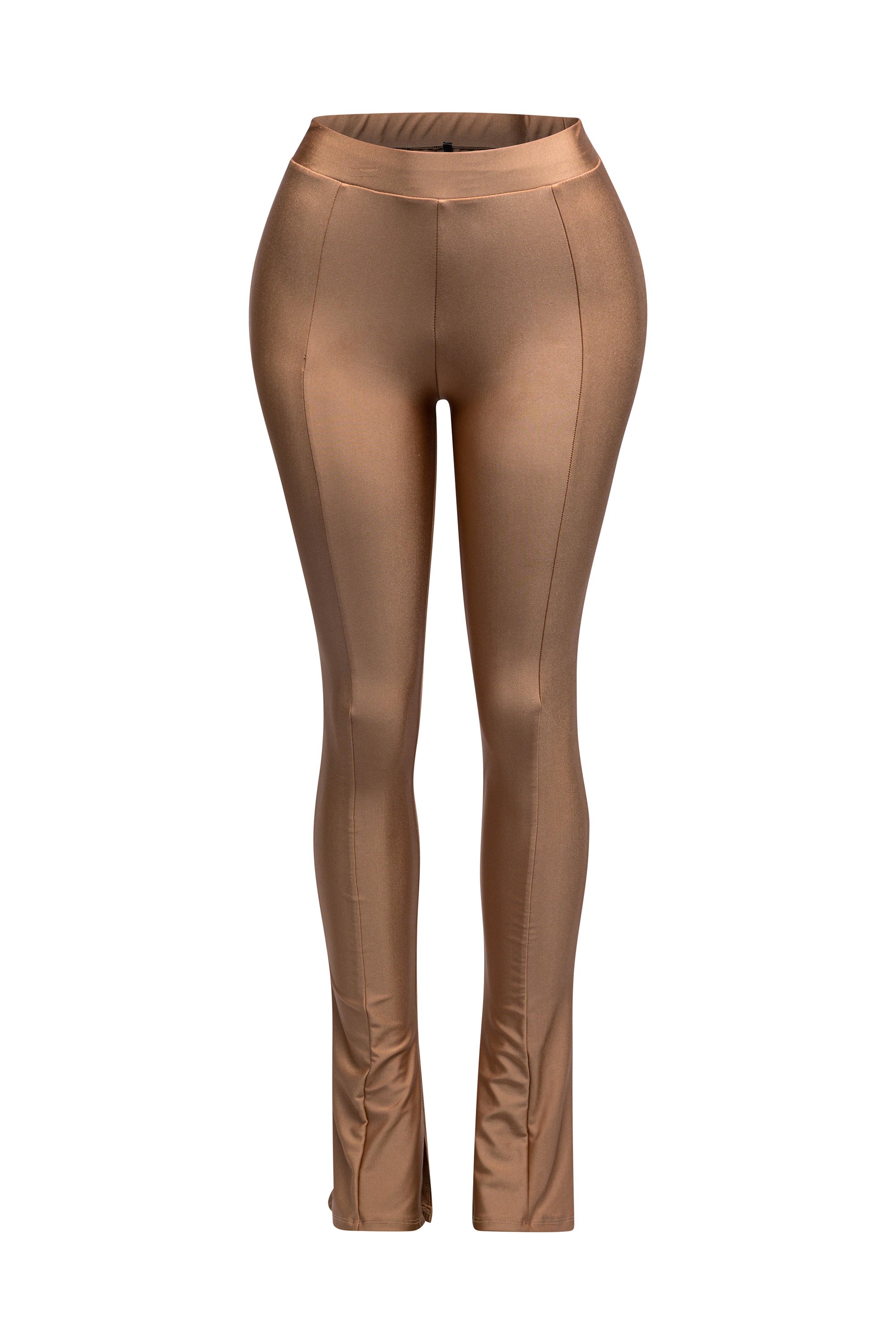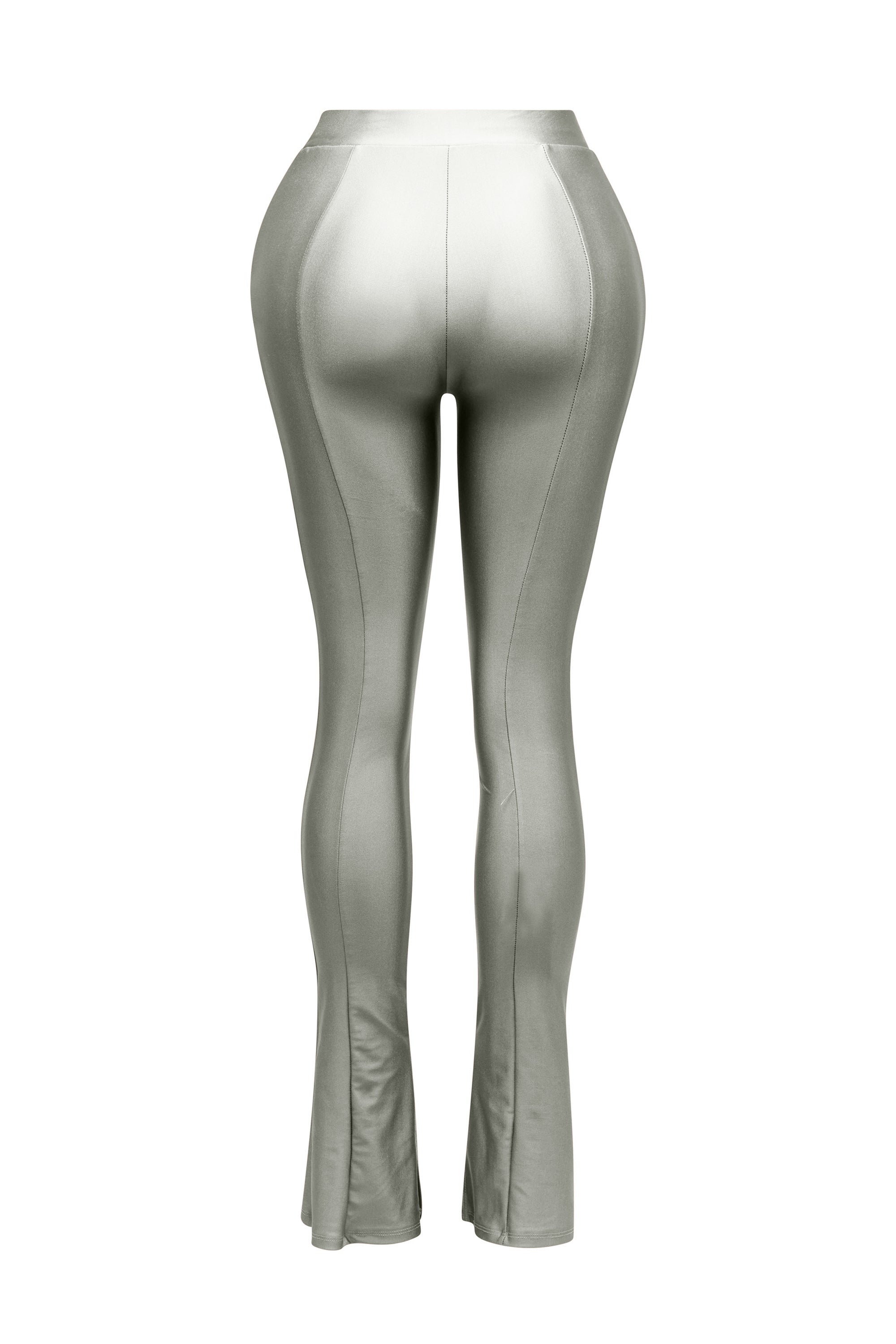 • Shiny tricot • Side slit hem • Bell bottom • Full length • 82%Nylon 18%Spandex • Imported