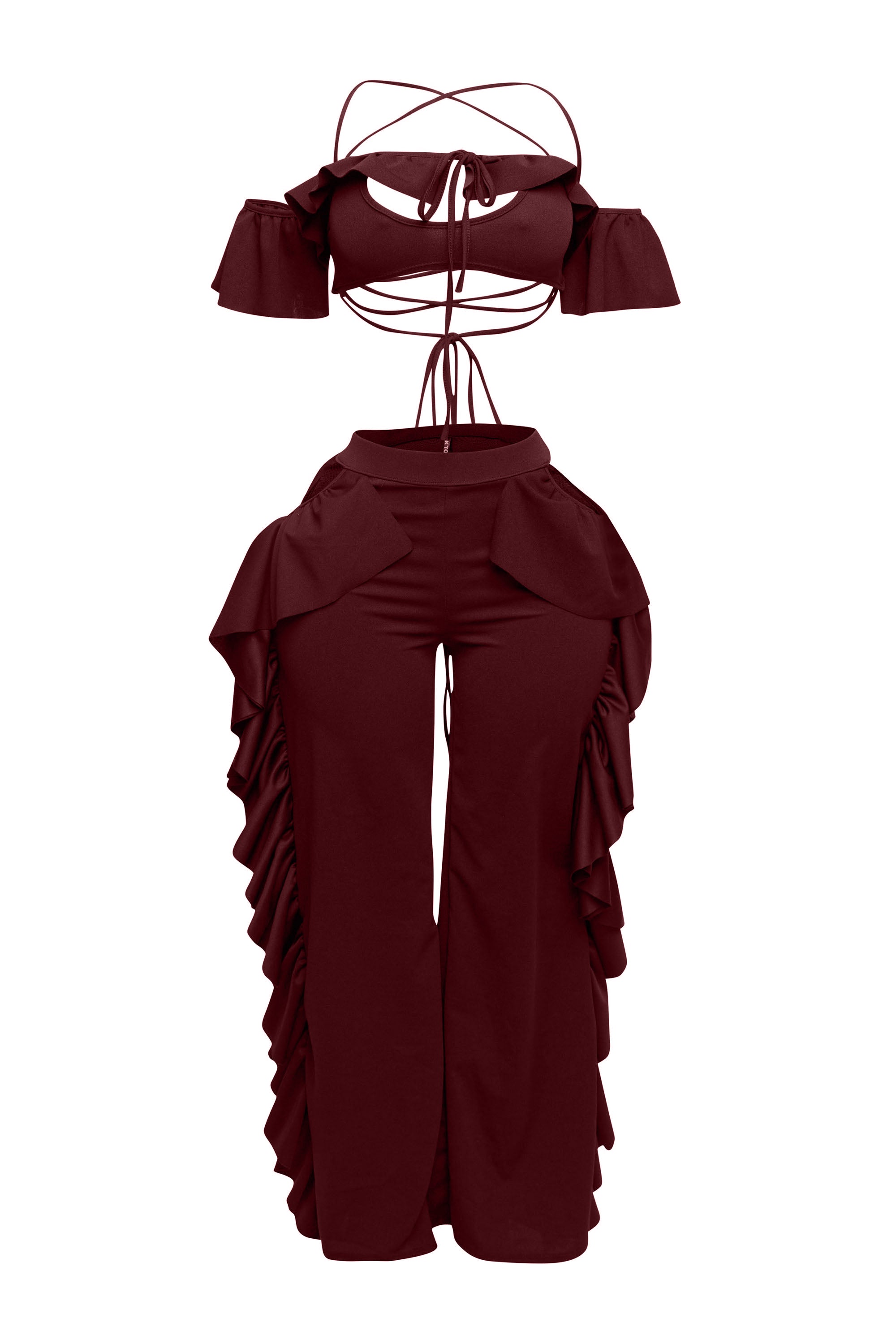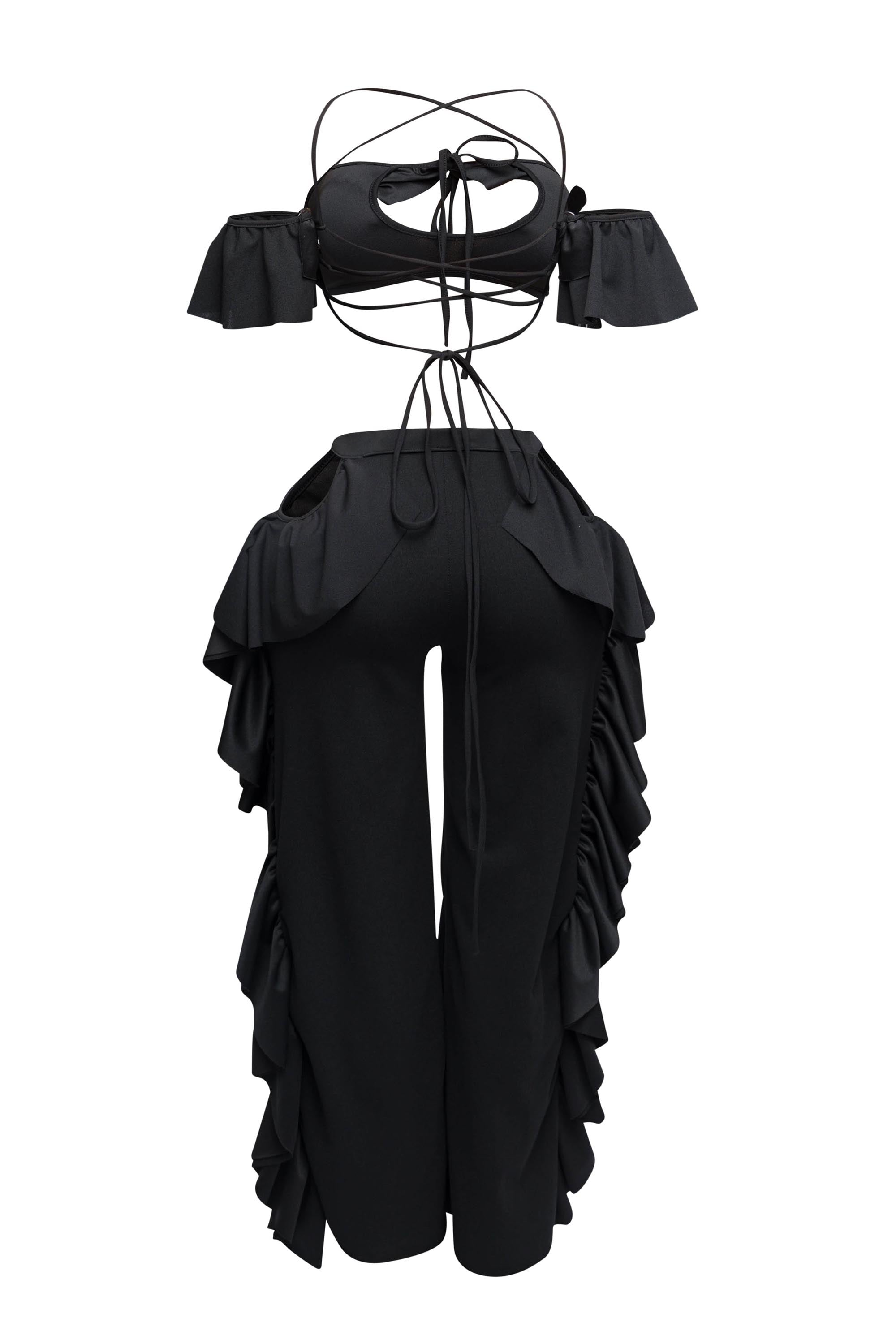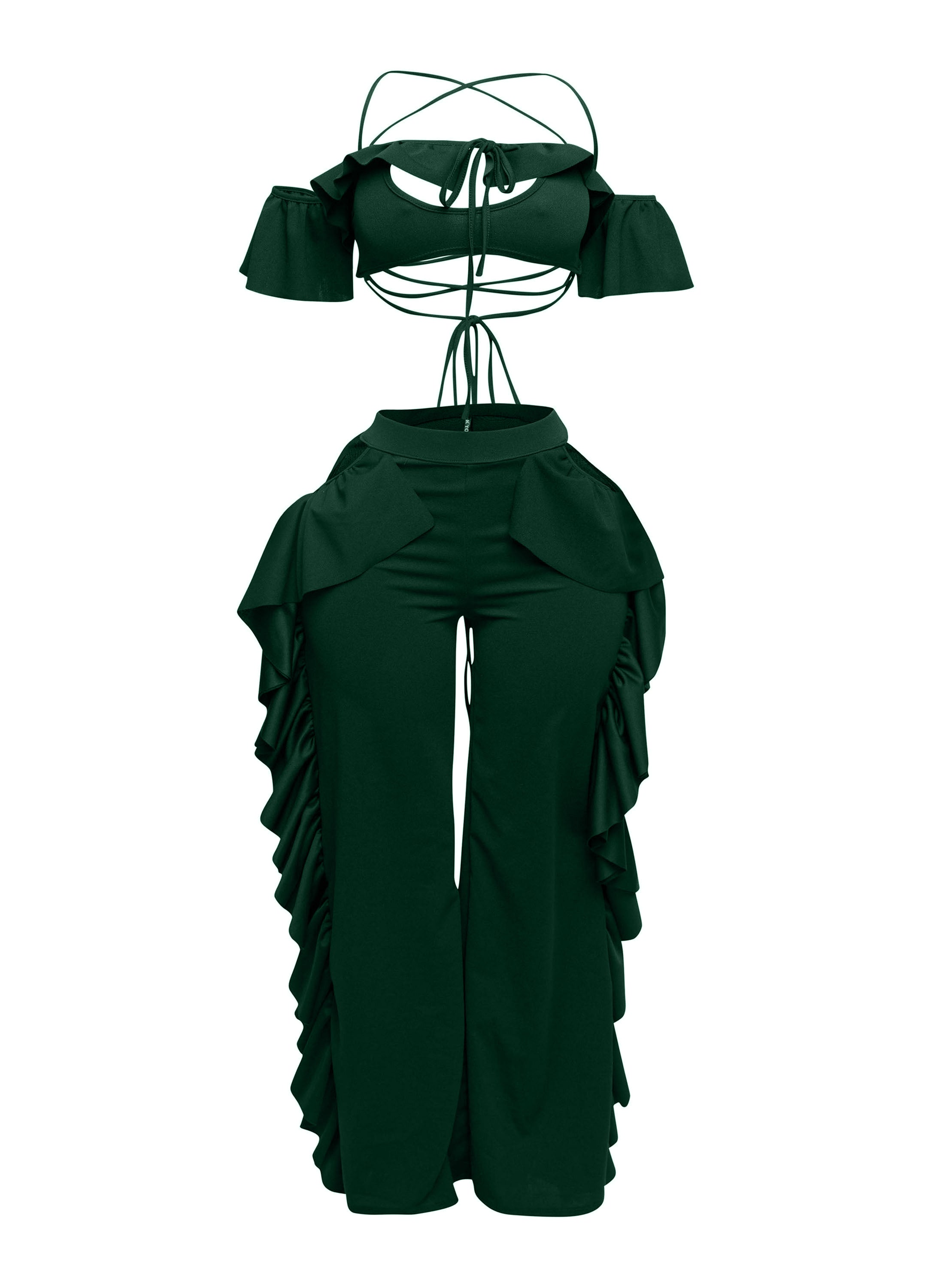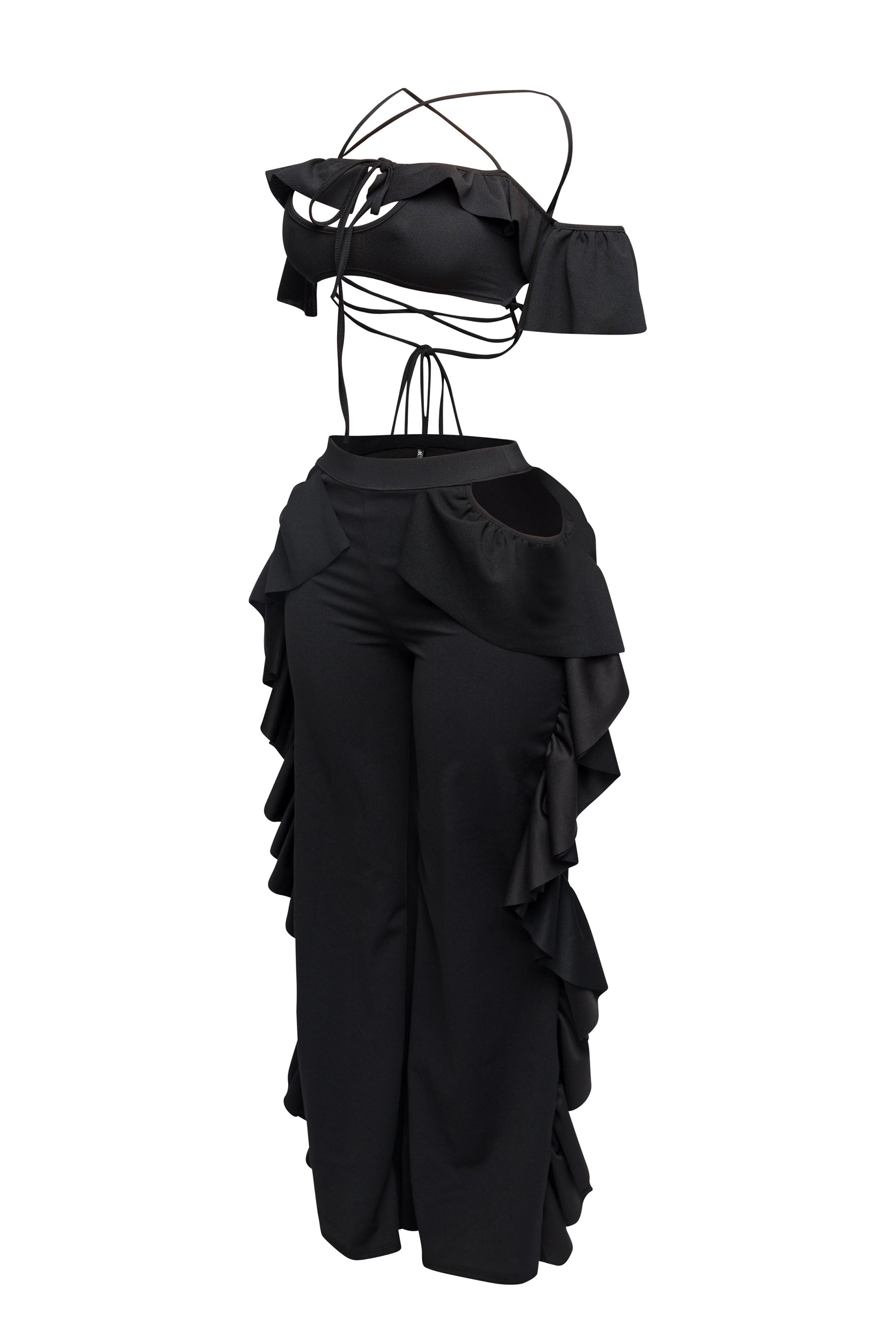 • Strappy & ruffle sleeve crop top • Side cut out • Ruffle detailed pants • Wide leg • Stretch...