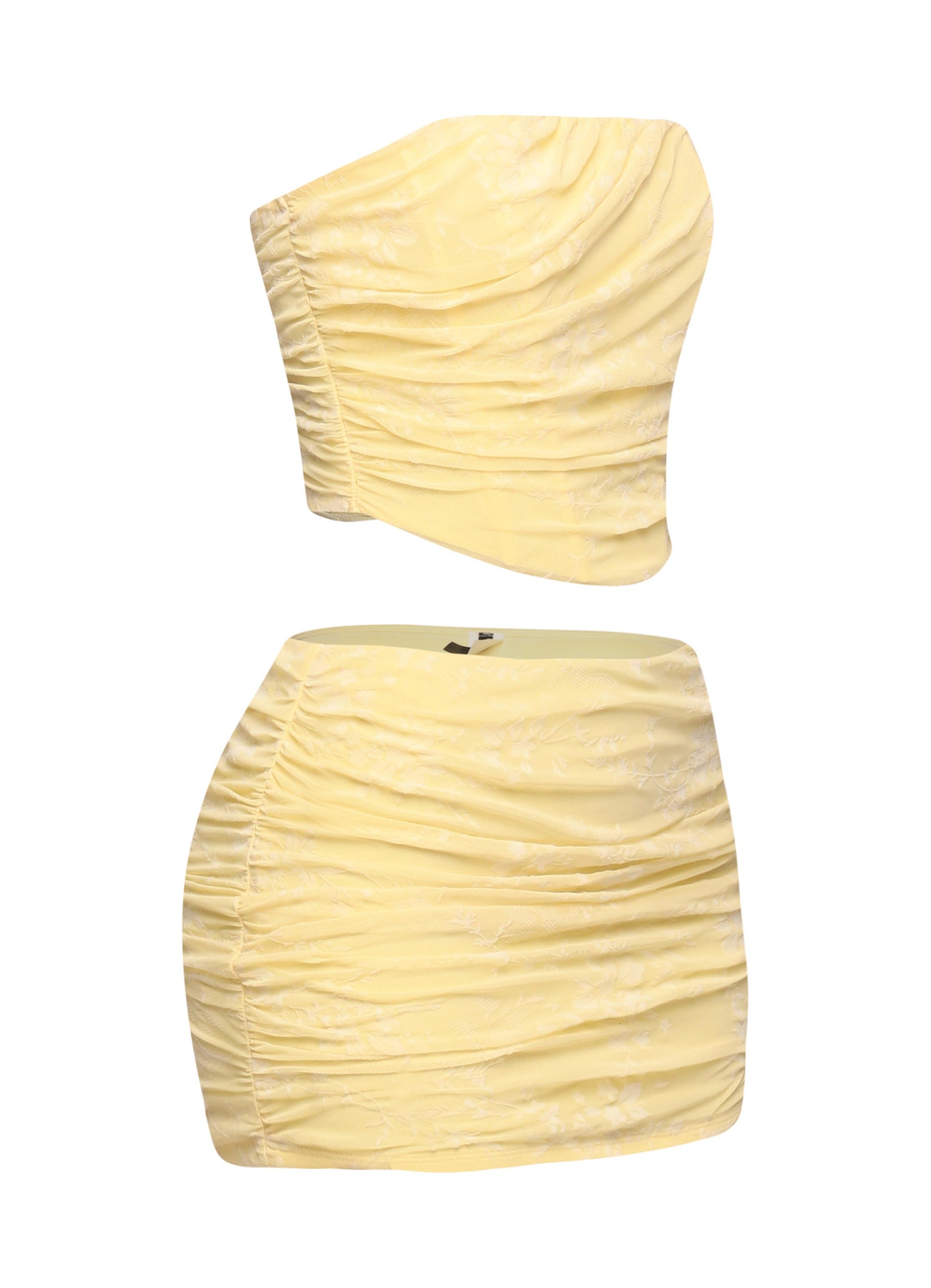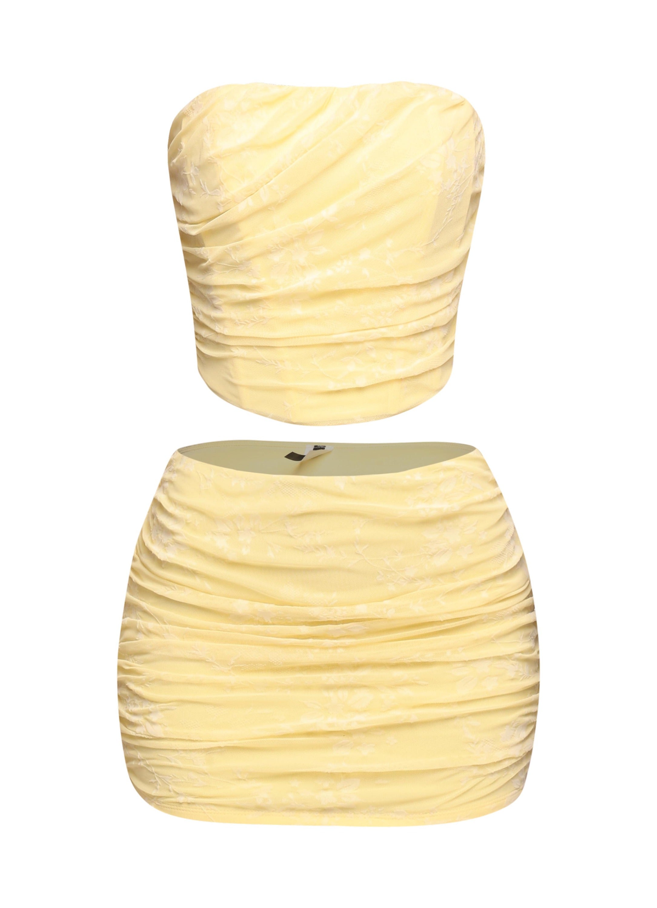 Your new weekend favorite just dropped. The Sundae Crushed Shirred Mini Set is serving sweet heat with its sculpted bandeau top and ruched mini skirt duo. Featuring delicate floral jacquard texture, a boned bodice for structure, and flattering gathered details throughout, this set brings just the right amount of stretch and curve-contour magic. Whether you're dancing through a festival or headed to rooftop brunch, this look brings sun-soaked main character energy in every color.