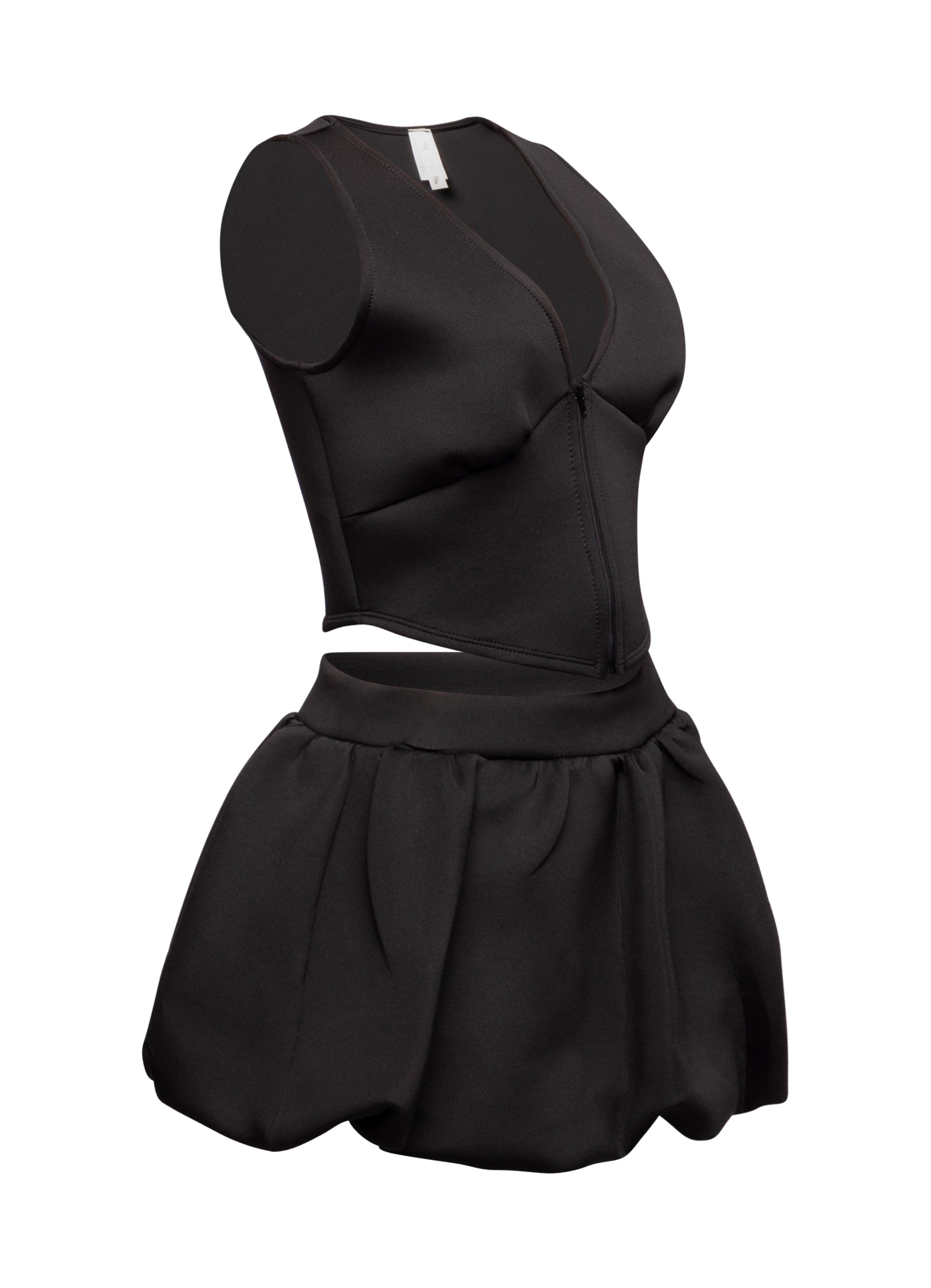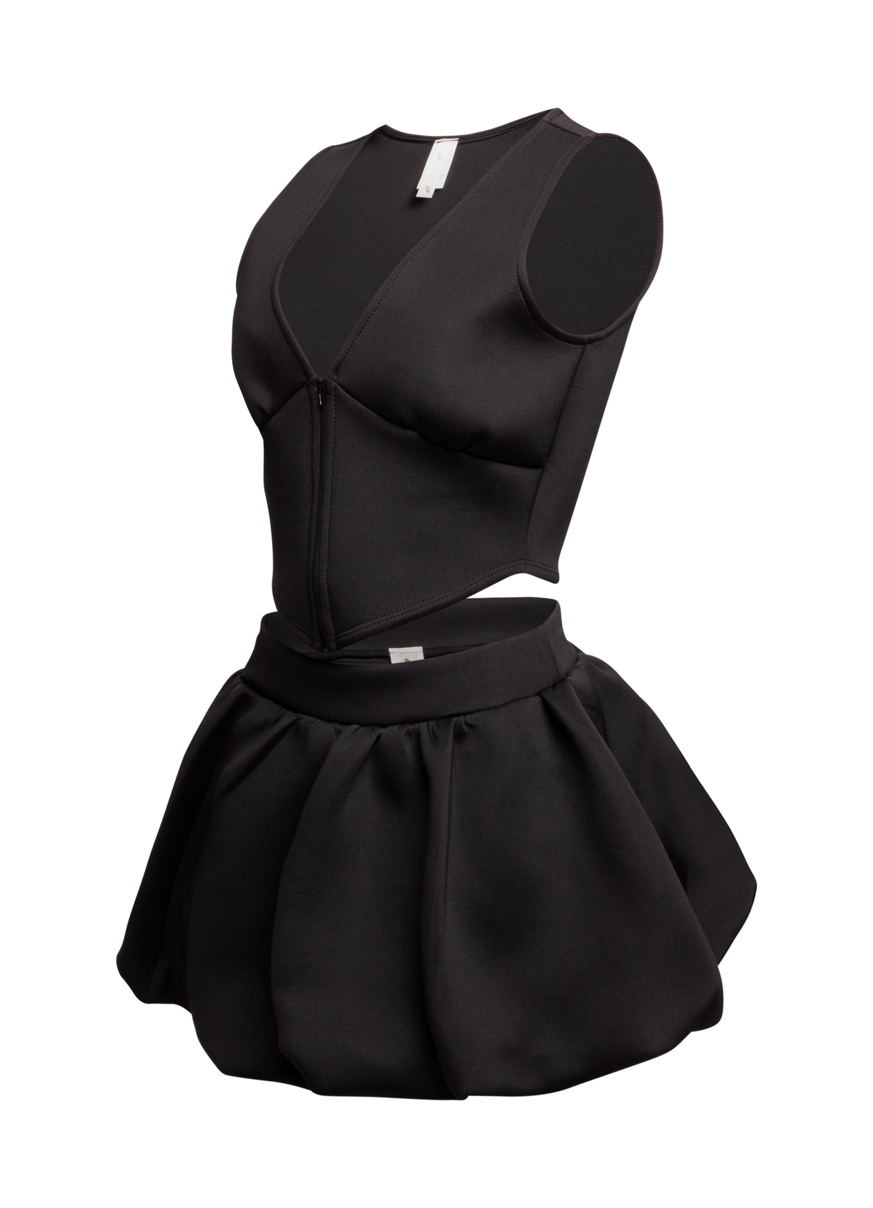 Vest Length: 16" Bottom Length: 13" Material Composition: 100% Polyester for both vest and skirt Structured cropped vest with a...