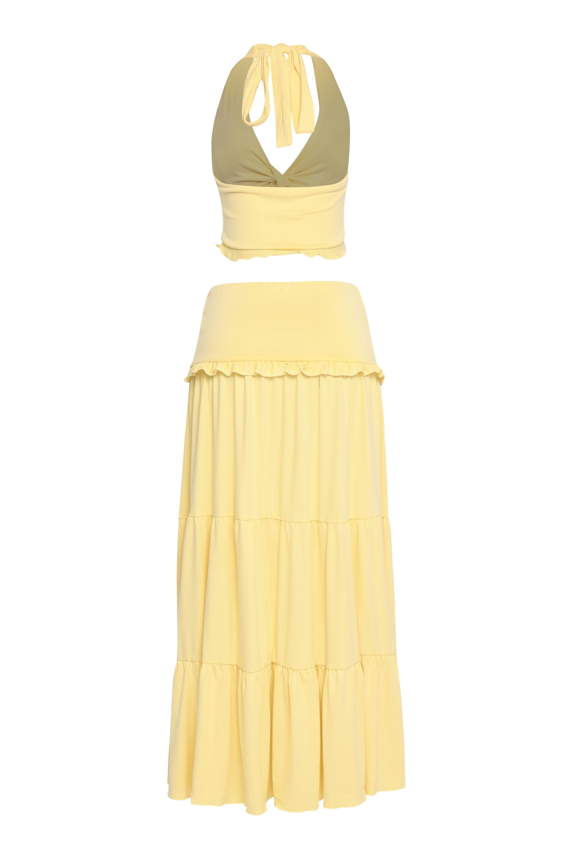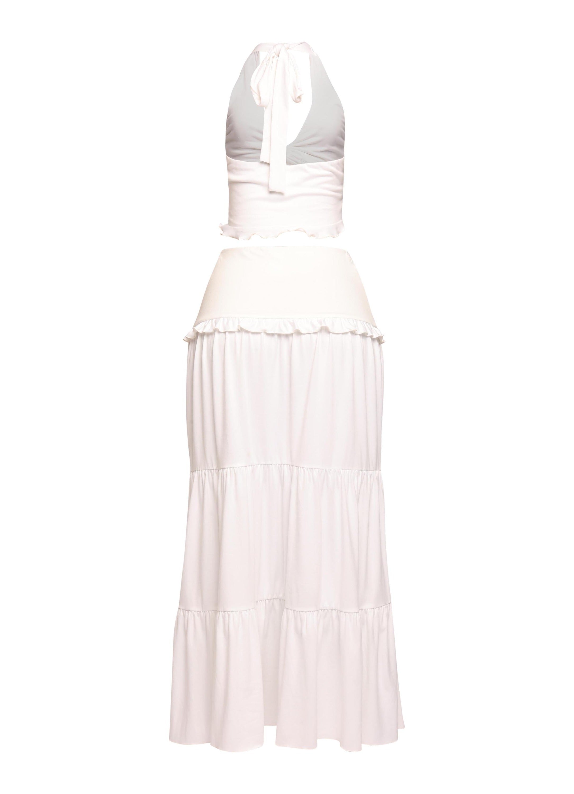 Say hello to soft drama. The Sunspell Twist Halter Maxi Skirt Set brings effortless movement with a hint of sultry. Featuring a plunging halter top with a twisted front and a low-rise maxi skirt that sits perfectly on the hips, this set serves major vacation goddess energy. The tiered merrow hem adds a breezy vibe while the soft-stretch fabric hugs just enough. Whether you're poolside or out for rooftop drinks, this look is your golden hour essential.