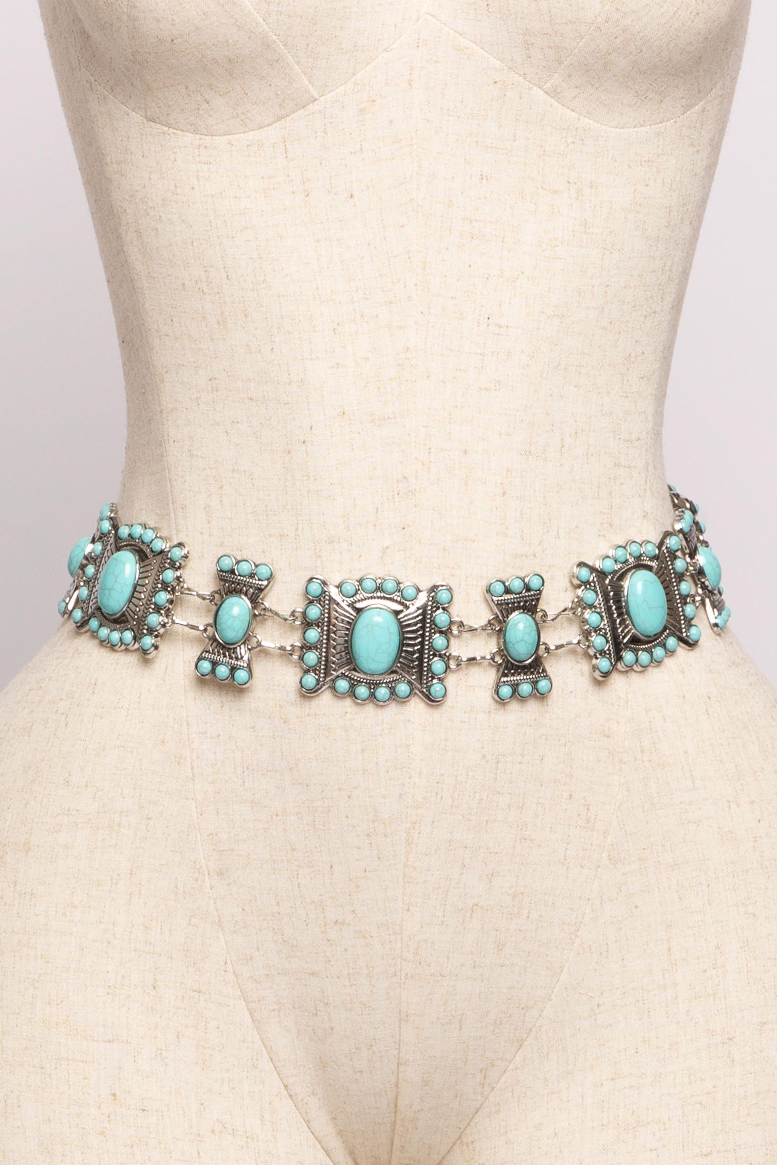 Infuse your look with a touch of Southwestern elegance using the Turquoise Medallion Chain Belt. This exquisite accessory features beautifully crafted turquoise stones set in antique silver-tone medallions, creating a timeless and eye-catching design. The intricate detailing and rich turquoise color make it the perfect piece to add texture and personality to any outfit, whether paired with jeans, a dress, or even layered over a long sweater. With an adjustable chain clasp for a customized fit, this belt combines comfort and style effortlessly, ideal for both casual and bohemian-inspired looks.