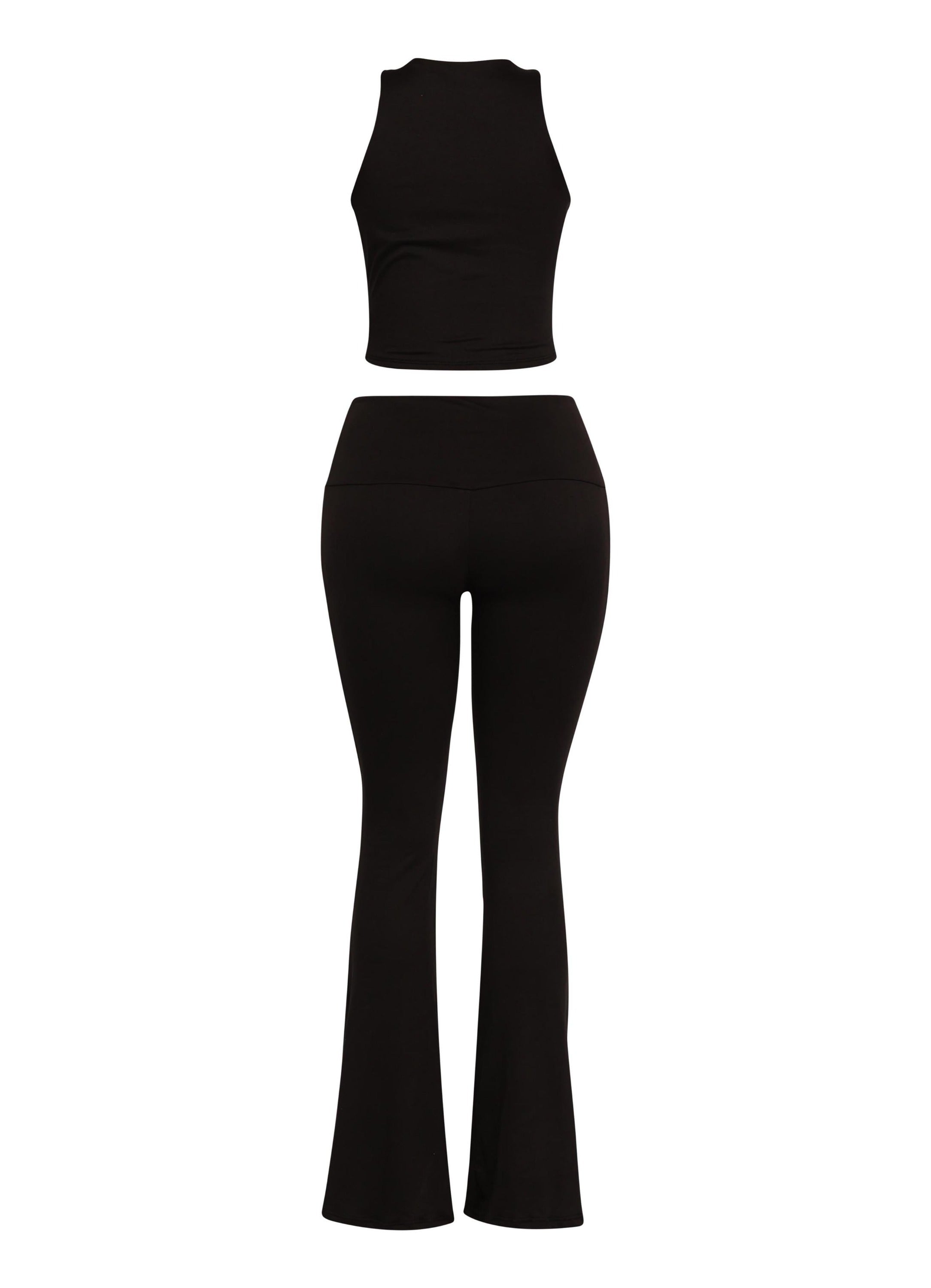 Not your average set. The Twist Play combo is made to steal stares with a sultry cut-out shoulder detail, sleek sleeveless silhouette, and body-loving stretch that moves with you. Paired with ultra-flattering high-waisted flare pants, it hugs all the right places while giving you legs for days. Whether you're stepping out for drinks or dressing it down with sneakers, this set gives that clean girl meets off-duty baddie energy. TikTok “cool-girl” coded and designed to flex your curves.