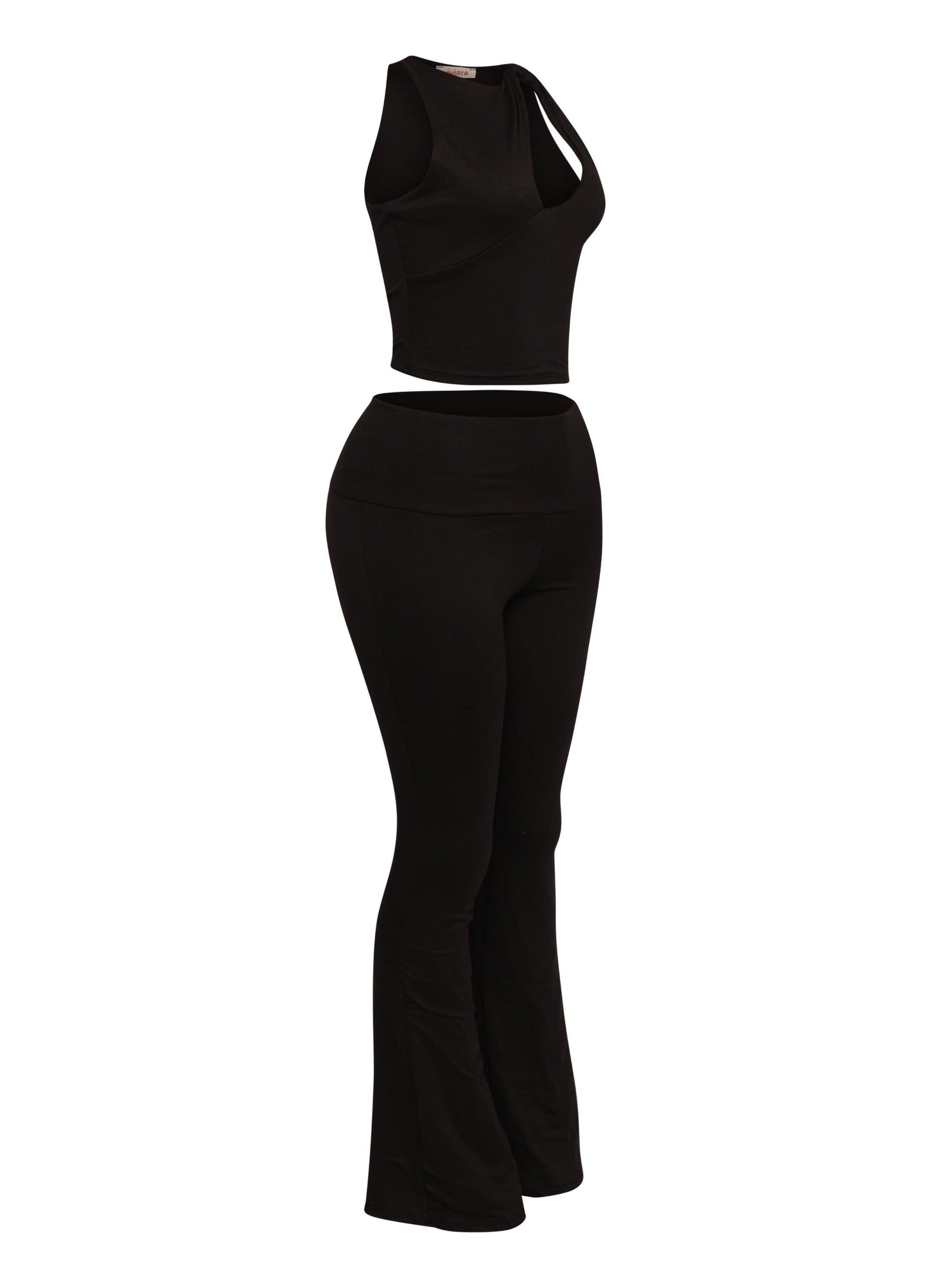 Not your average set. The Twist Play combo is made to steal stares with a sultry cut-out shoulder detail, sleek sleeveless silhouette, and body-loving stretch that moves with you. Paired with ultra-flattering high-waisted flare pants, it hugs all the right places while giving you legs for days. Whether you're stepping out for drinks or dressing it down with sneakers, this set gives that clean girl meets off-duty baddie energy. TikTok “cool-girl” coded and designed to flex your curves.