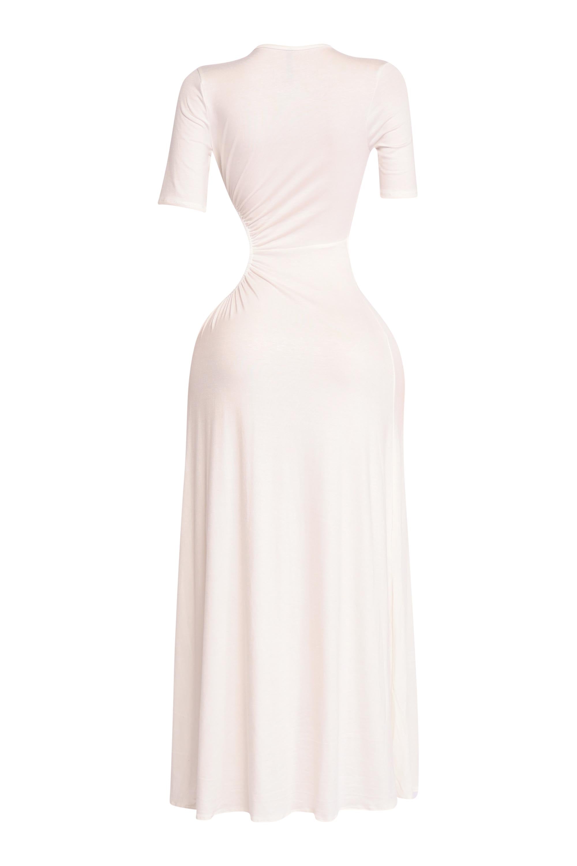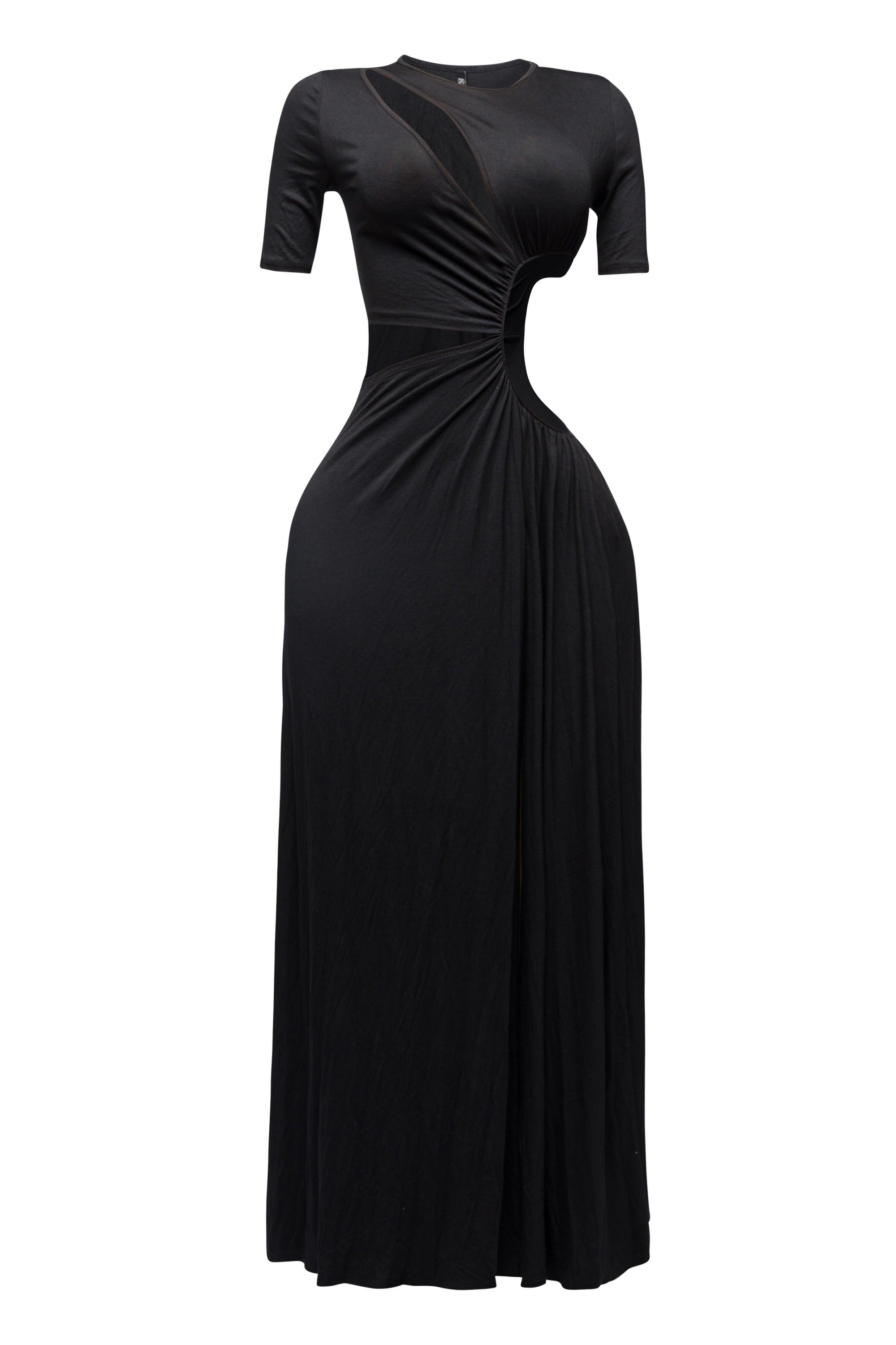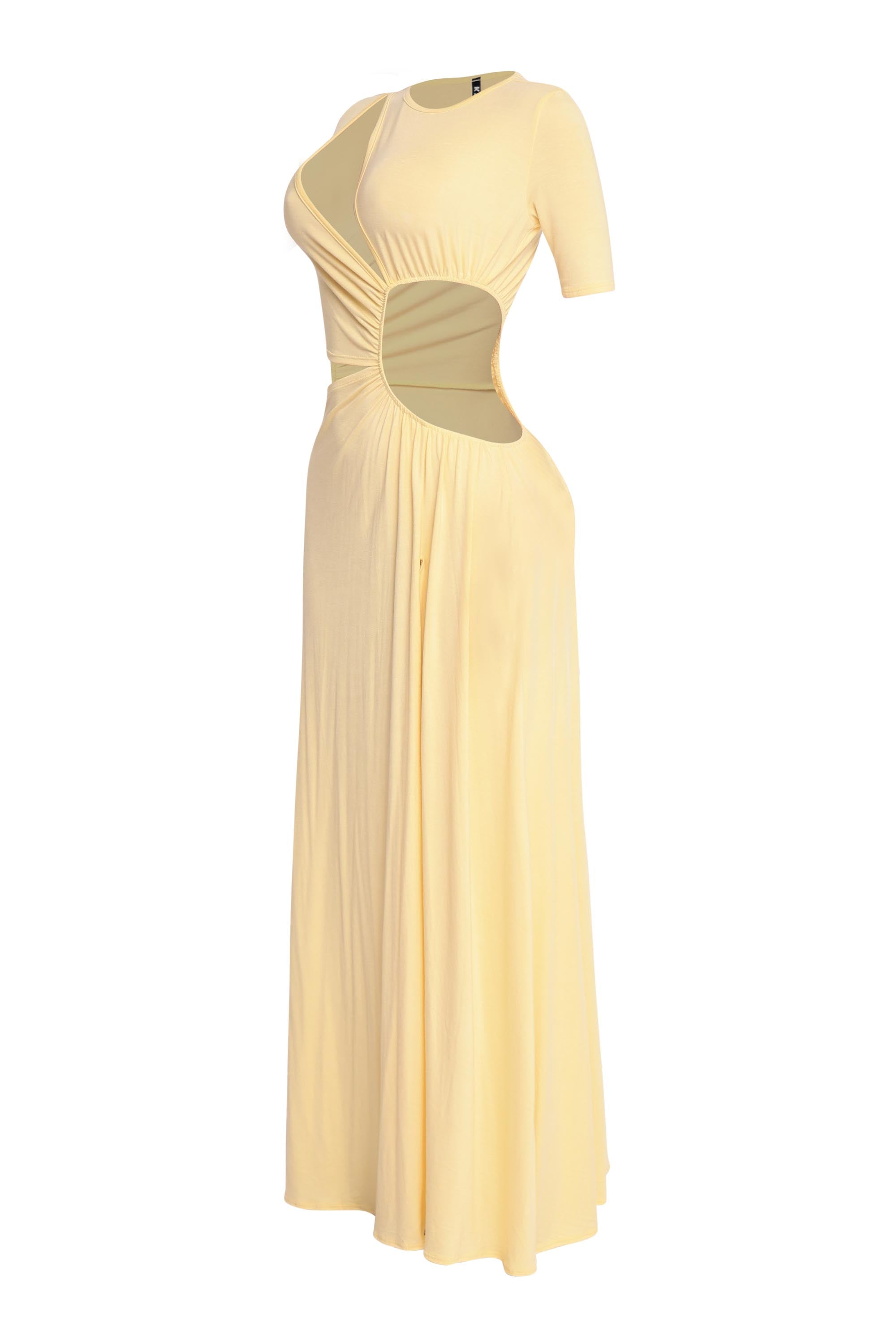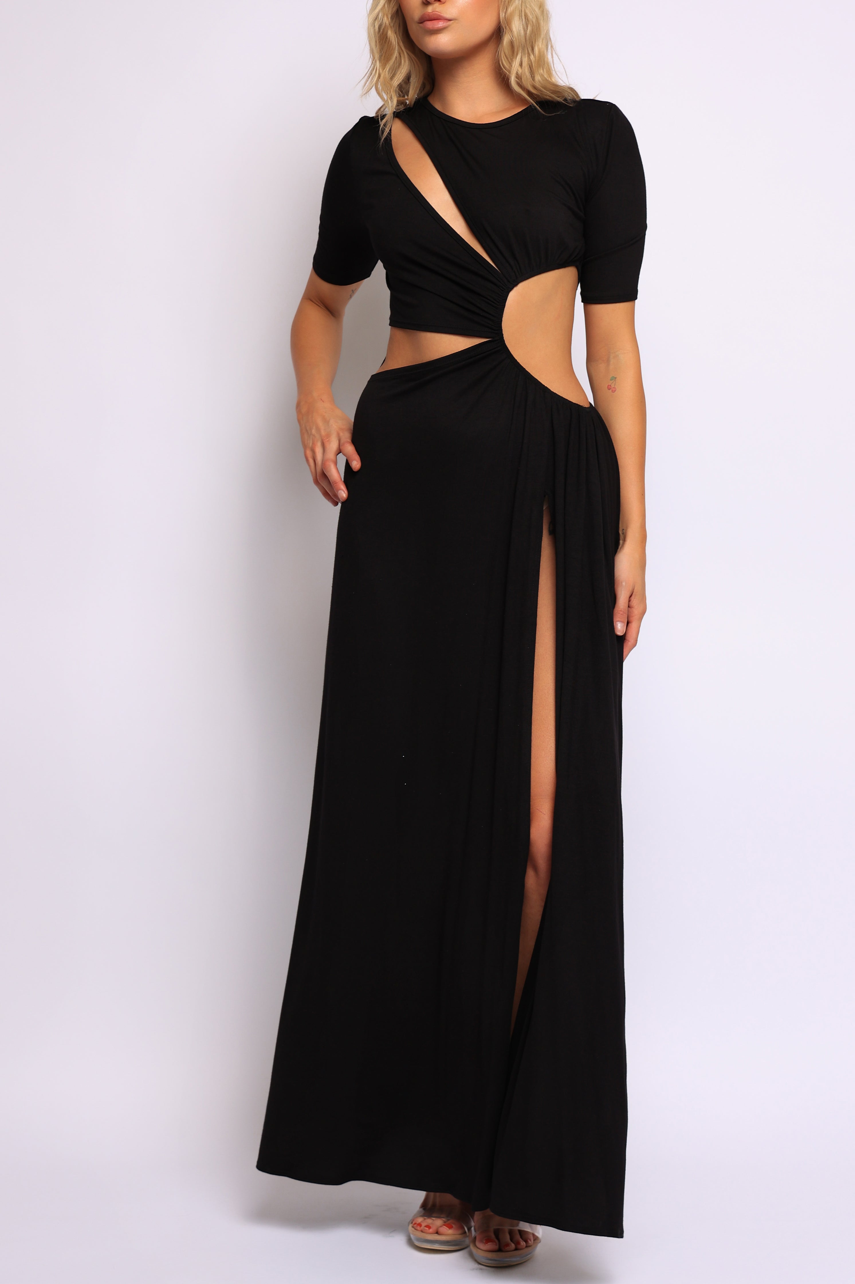 Bold moves only. The Uncut Intention Cutout Maxi Dress is made to break hearts and turn heads. Featuring asymmetrical front cutouts, a sultry side-baring twist, and a dramatic thigh-high slit, this is your go-to statement dress for steamy nights out or unforgettable vacation glam. The soft stretch fabric clings and flows just right, while short sleeves balance the heat with a sporty-meets-sultry vibe. It's giving runway-ready energy with a no-effort feel.