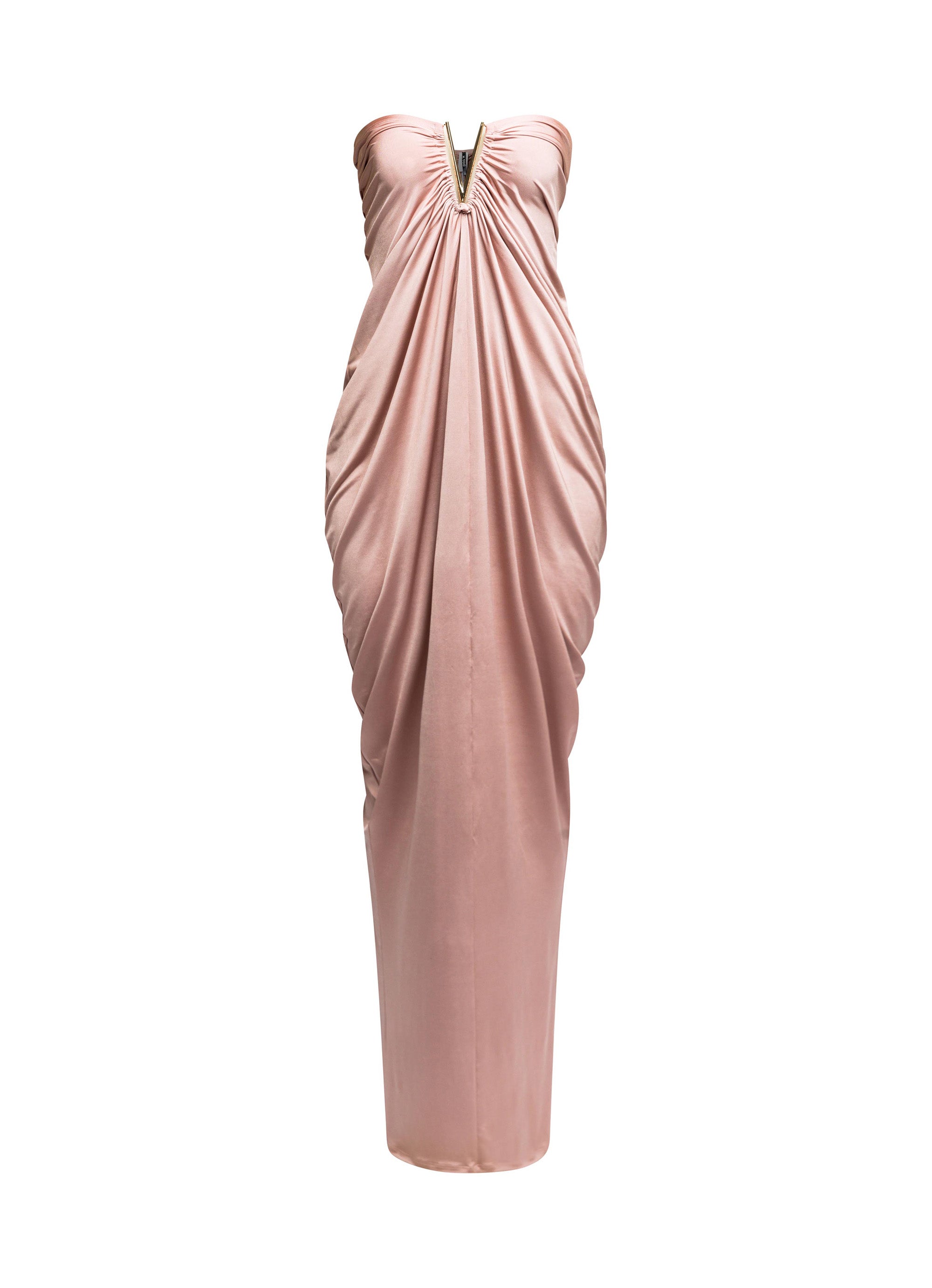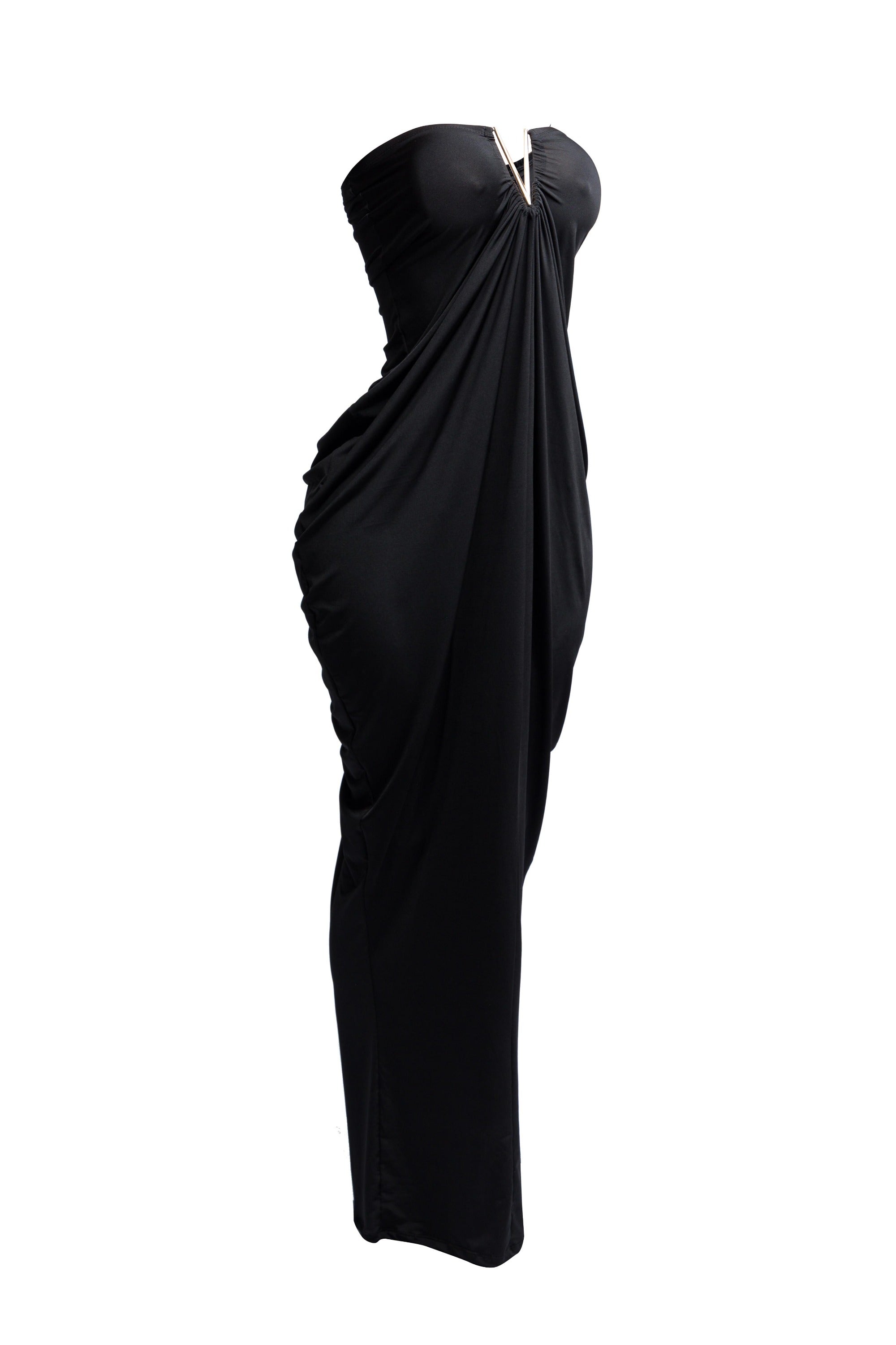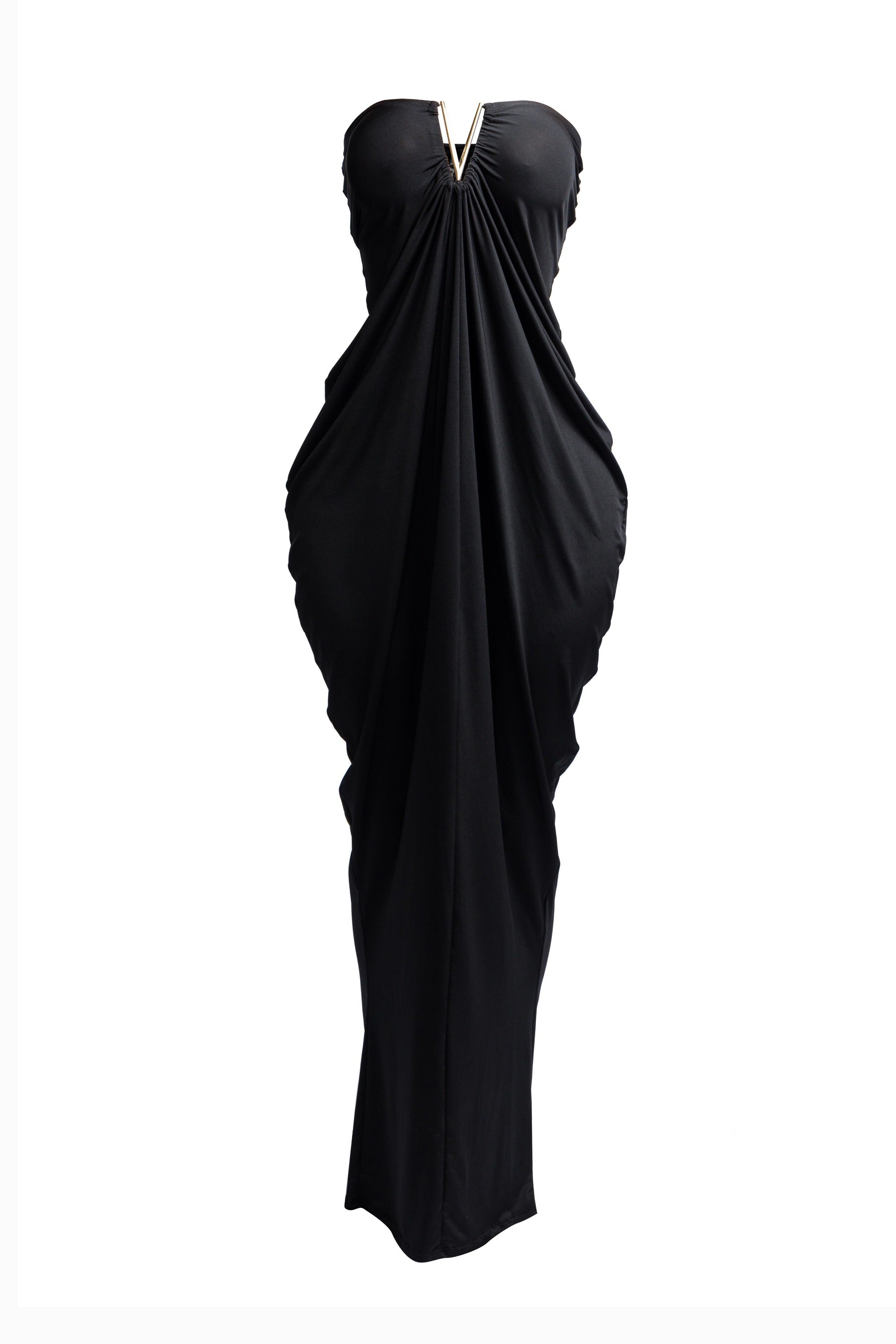 • Strapless dress• V shape trim detailed• Draping body• Ruching back• Slit open front• Stretch • 95%Polyester 5%Spandex• Length : 60"(HPS)•...