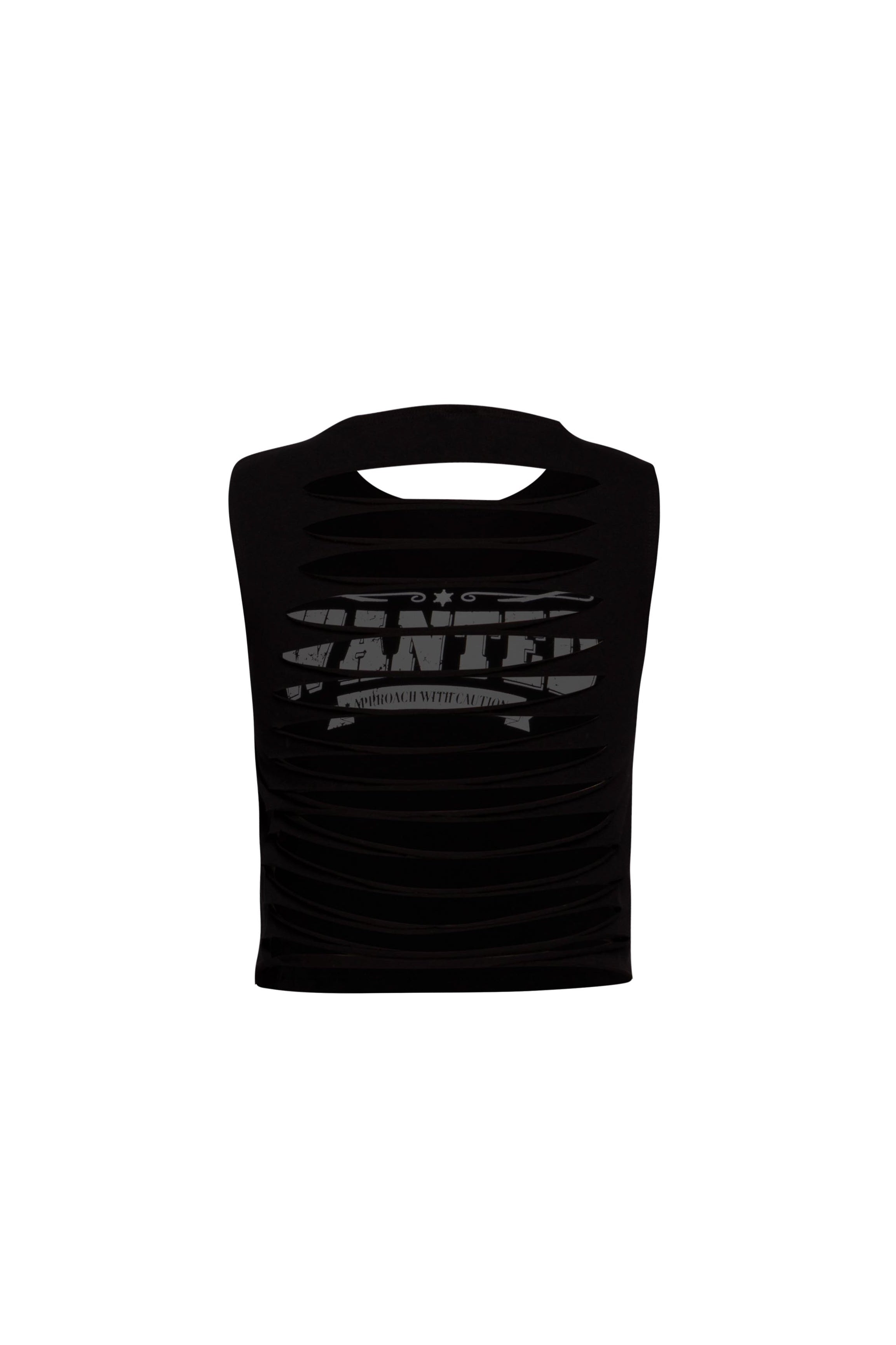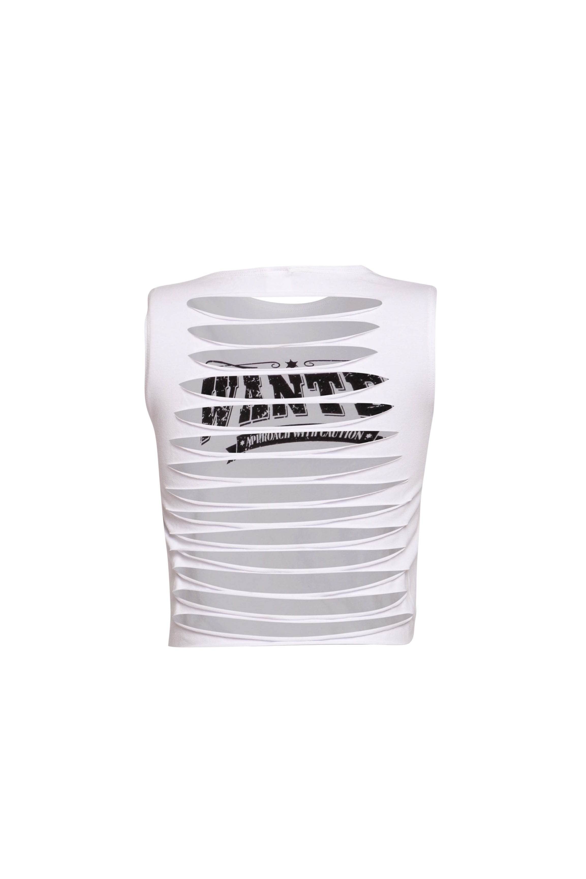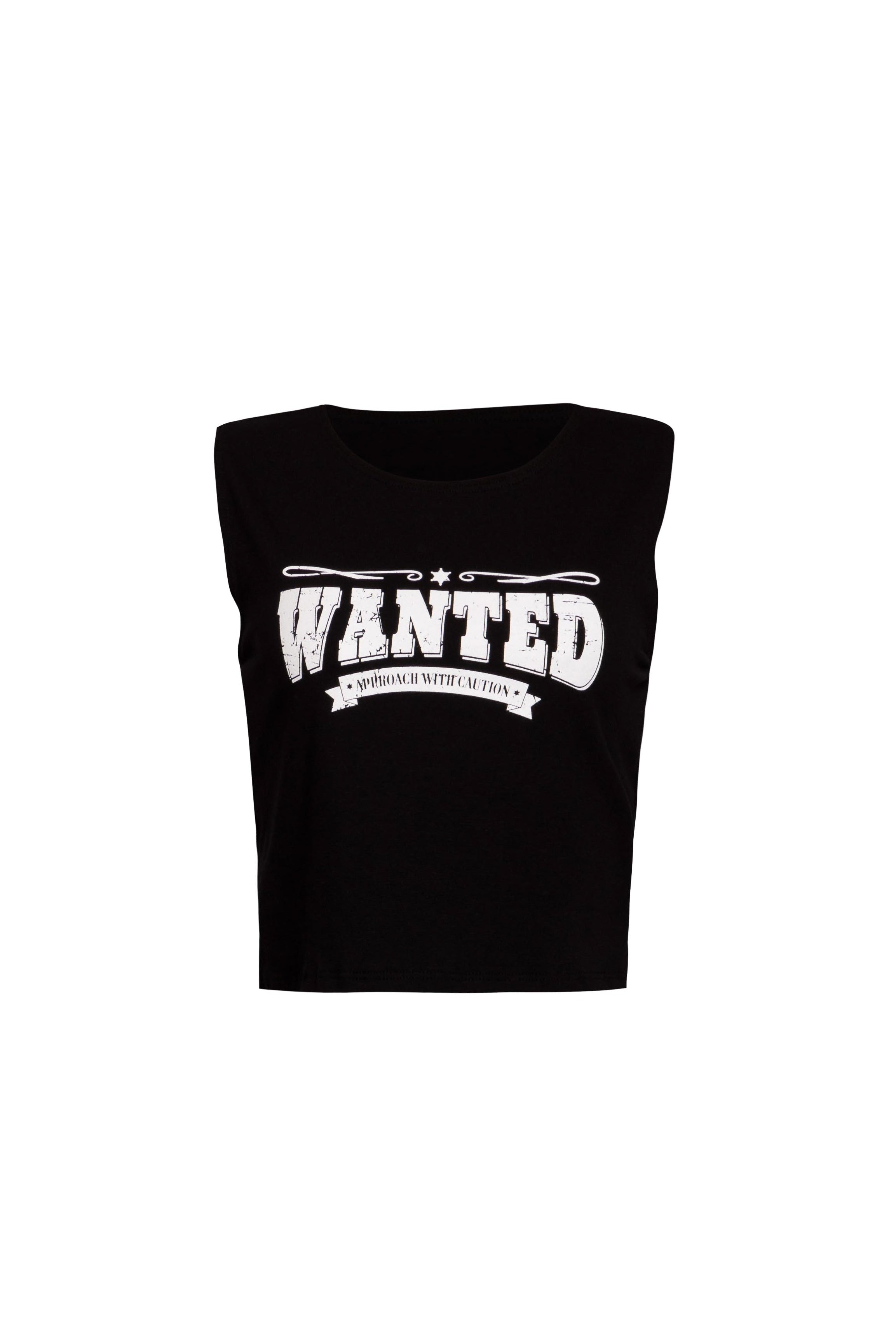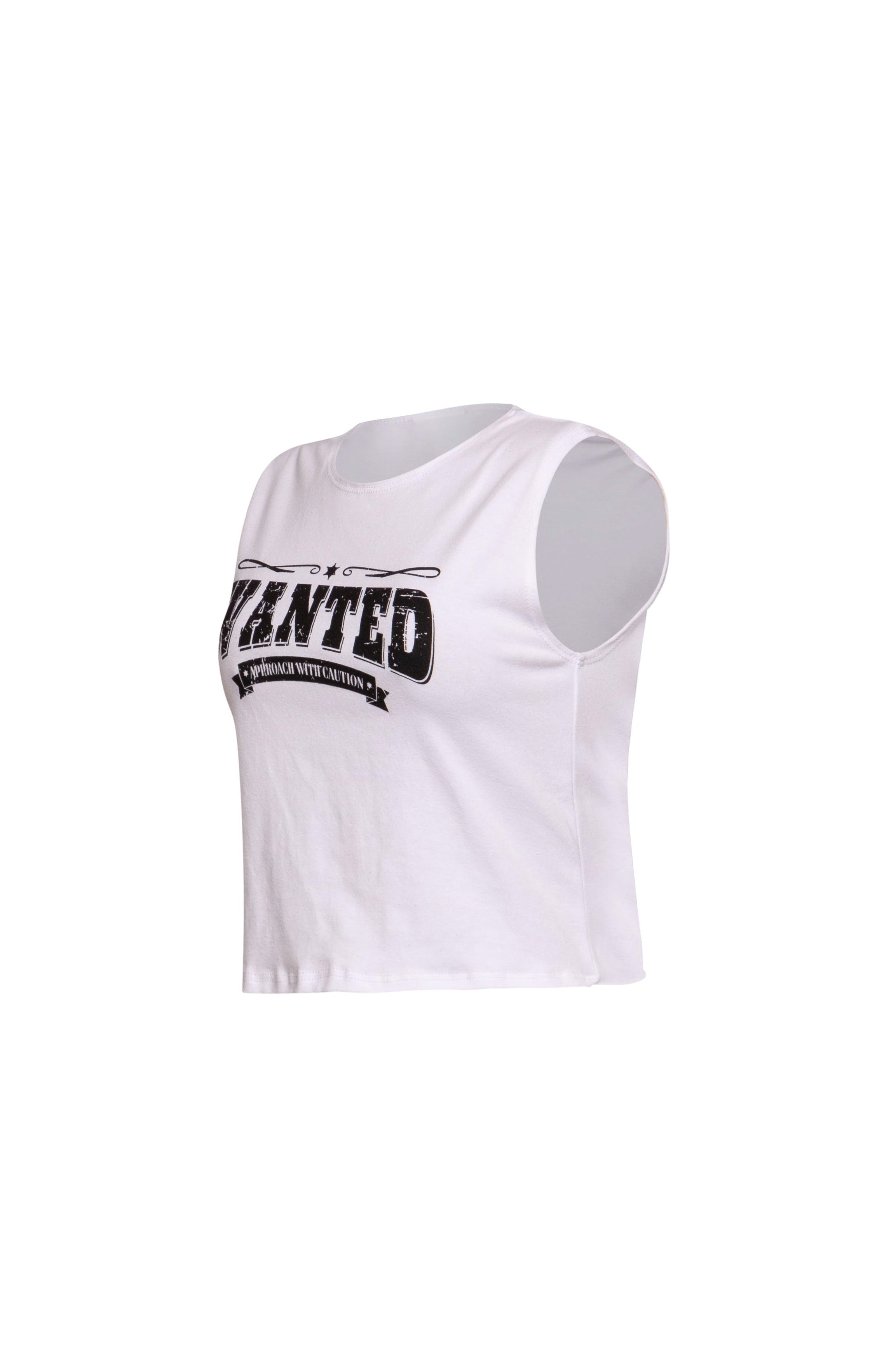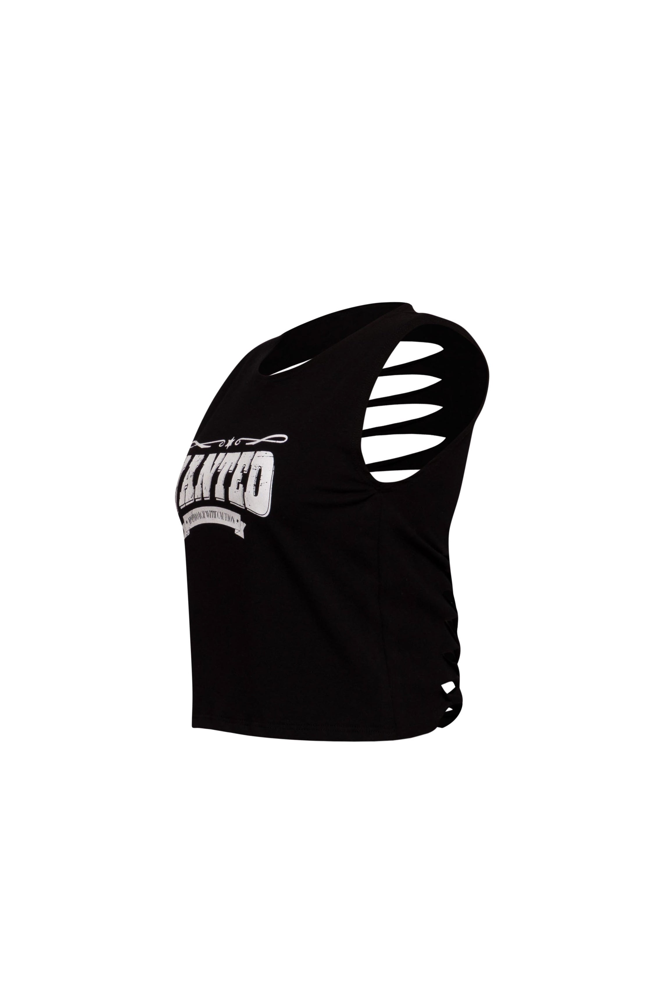 Turn heads with this bold "Wanted" muscle tank that brings a mix of attitude and style. Featuring a distressed "Wanted – Approach With Caution" graphic on the front, this sleeveless top exudes confidence and edge. The real standout feature is the back, with its unique horizontal cutouts that add a fierce, trendy vibe. Made from a soft cotton blend, this tank is designed for comfort and style, making it perfect for casual outings, festival looks, or pairing with your favorite denim or leather pieces.